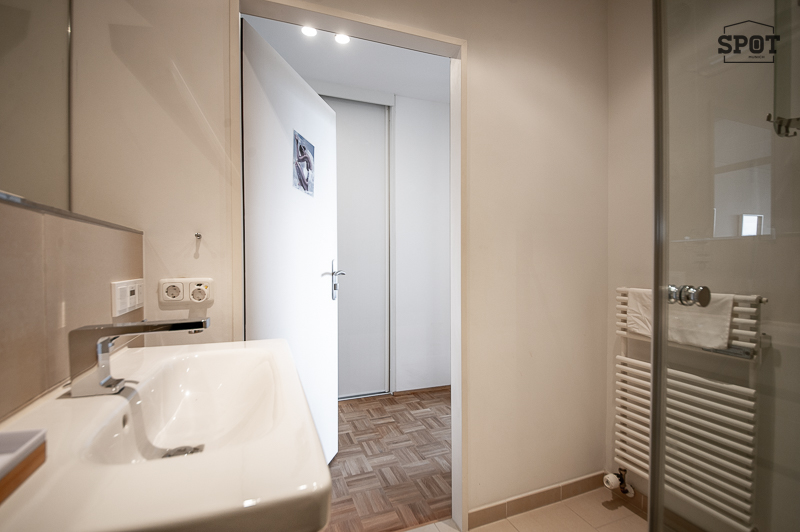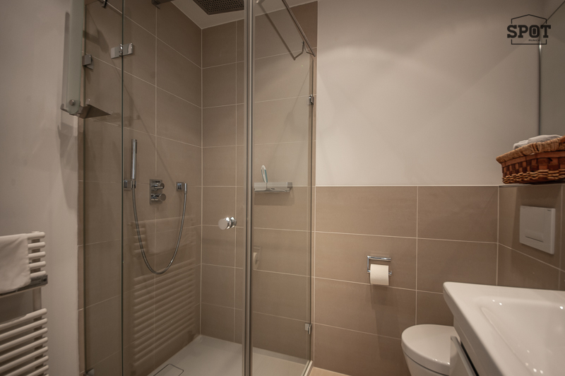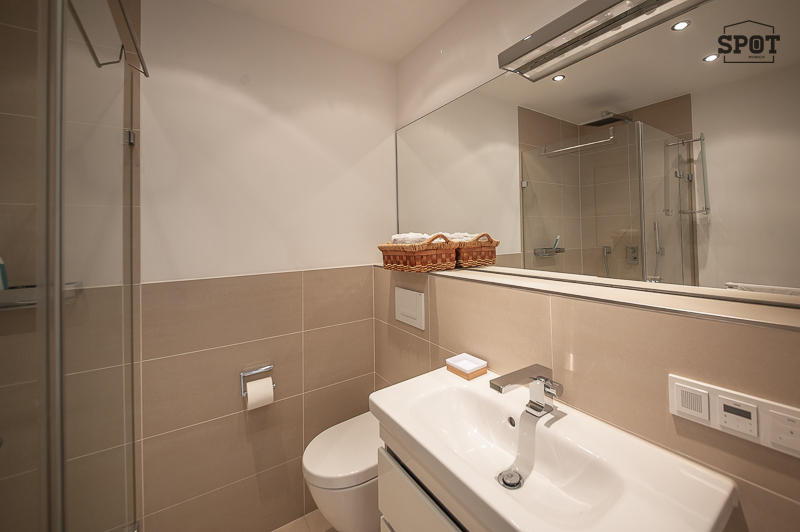 – Bathroom 2 with floor-level glass shower with rain shower head, washbasin with vanity unit, WC, mirror, towel warmer