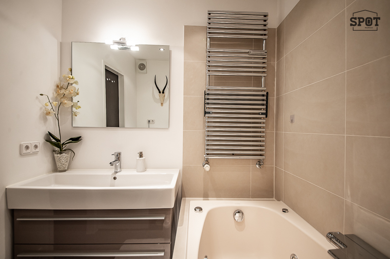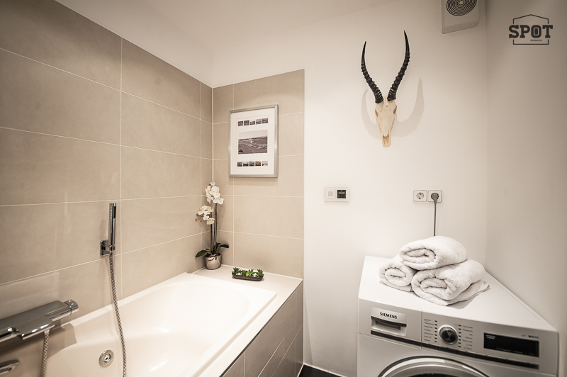 – Bad 1 mit Badewanne mit Whirlpool Funktion, Waschtisch mit Unterbau, Handtuchwärmer, Wäschetrockner