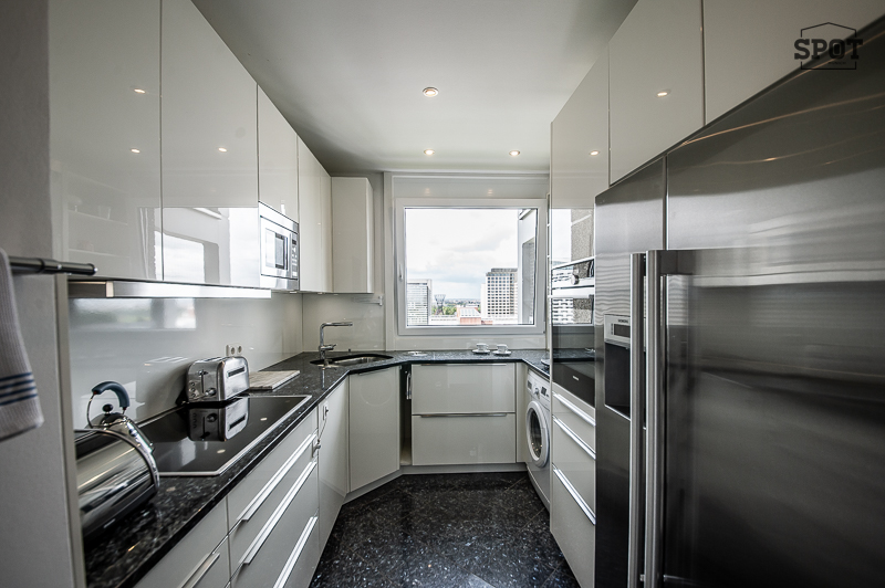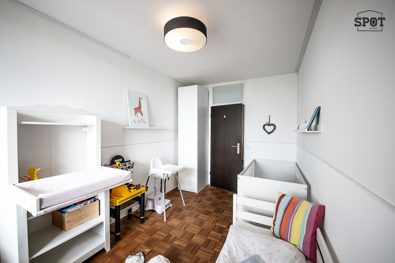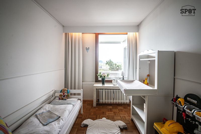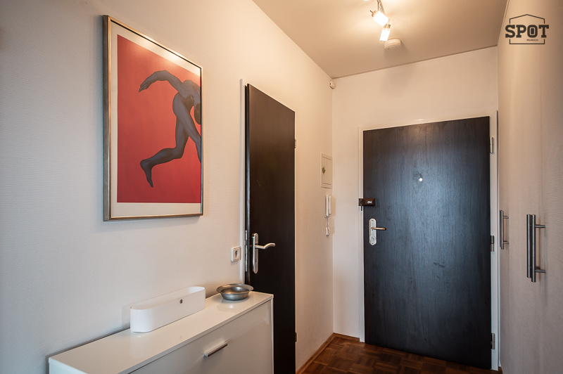 Helle möblierte 4 Zimmer Wohnung mit 2 großen Balkonen, drei separaten Schlafmöglichkeiten und zwei Bädern, Bogenhausen Arabellapark. Die Lage im 15. Stock (mit Lift) bietet einen großartigen Blick über München bis zu den Alpen. Die Möblierung ist modern mit originellen Leuchten und hübschen Details. Die großzügige Diele wurde im Bereich vor dem Zugang zur Küche für einen Esstisch für vier Personen genutzt. Dieser bietet sich auch als Arbeitsplatz für Homeoffice an. Im Eingangsbereich gibt es einen praktischen Einbauschrank und einen Schuhschrank. Von der Diele betritt man den hellen Wohnraum, welcher Zugang zum großen überdachten Süd-Balkon mit Balkonmöbeln ermöglicht. Der Wohnbereich ist ausgestattet mit bequemem Ecksofa, Lowboard, Flat Screen TV und Truhe. Im Essbereich des Wohnzimmers gibt es einen Esstisch für 4 Personen. Die neuwertige separate weiße Küche mit Fenster, ist sehr gut mit Markengeräten ausgestattet, u.a. mit großem amerikanischem Kühlschrank, Geschirrspüler, Waschmaschine etc. Das Hauptschlafzimmer ist mit Doppelbett (1,80 x 2,00 m), großzügigem Schiebetüren-Kleiderschrank und zwei Nachttischen möbliert. Von hier aus Zutritt zum 2. Balkon, der nach Westen ausgerichtet ist. Das zweite Schlafzimmer verfügt über eine komfortable Schlafcouch, einen Tisch mit 2 Stühlen und man hat Zugang zum Südbalkon. Von hier wird die Ankleide mit Einbauschränken betreten. Das dritte Zimmer ist aktuell mit zwei Kinderbetten, Kommode und kleinem Schrank möbliert. Ein Bett oder Schlafsofa kann flexibel dazu kommen. Die beiden Badezimmer sind mit Feinsteinzeug gefliest. Eines verfügt über eine Badewanne mit Whirlpool Funktion, Waschtisch mit Unterschrank und Handtuchwärmer. Hier steht auch der Trockner. Das andere, angrenzend an die Ankleide, ist mit Duschkabine mit Regenschauer Duschkopf, Waschbecken mit Unterschrank und WC ausgestattet. Ein Extra Gäste WC ist vorhanden. Ebenso bietet eine praktische Abstellkammer zusätzlichen Stauraum. english Bright furnished 4-room apartment with 2 large balconies, three separate bedrooms and two bathrooms, Bogenhausen Arabellapark. The location on the 15th floor (with elevator) offers a great view over Munich to the Alps. The furnishings are modern with original lamps and pretty details. The spacious hallway was used for a dining table for four people in the area in front of the entrance to the kitchen. This is also ideal for a home office. There is a practical built-in wardrobe and a shoe cupboard in the entrance area. From the hallway, you enter the bright living room, which provides access to the large covered south-facing balcony with balcony furniture. The living area is furnished with a comfortable corner sofa, lowboard, flat screen TV and chest. In the dining area of the living room there is a dining table for 4 people. The separate white kitchen with window is as good as new and is very well equipped with brand-name appliances, including a large American fridge, dishwasher, washing machine, etc. The master bedroom is furnished with a double bed (1.80 x 2.00 m), spacious sliding-door closet and two bedside tables. From here you have access to the 2nd balcony, which faces west. The second bedroom has a comfortable sofa bed, a table with 2 chairs and access to the south-facing balcony. The dressing room with fitted wardrobes is accessed from here. The third room is currently furnished with two children's beds, a chest of drawers and a small wardrobe. A bed or sofa bed can be added as required. The two bathrooms are tiled with porcelain stoneware. One has a bathtub with whirlpool function, washbasin with vanity unit and towel warmer. The dryer is also located here. The other, adjacent to the dressing room, is equipped with a shower cubicle with rain shower head, washbasin with vanity unit and WC. An extra guest WC is also available. A practical storage room also offers additional storage space.
