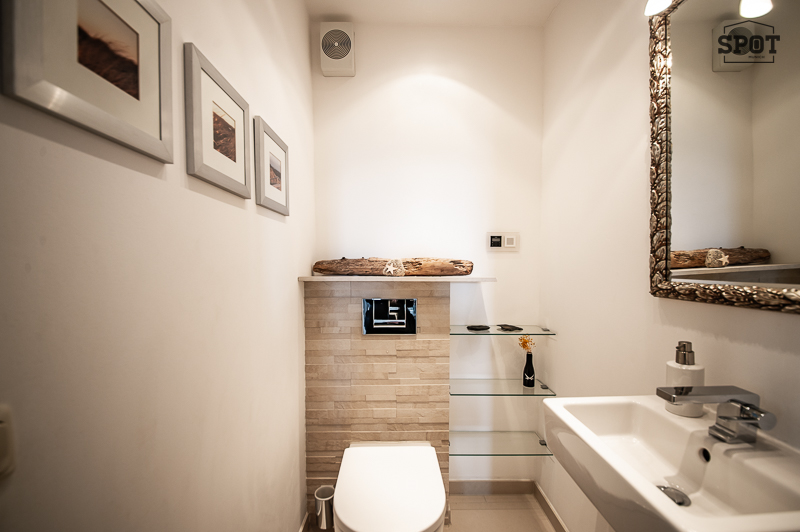– Gäste WC mit Waschbecken, Spiegel, Regalen
