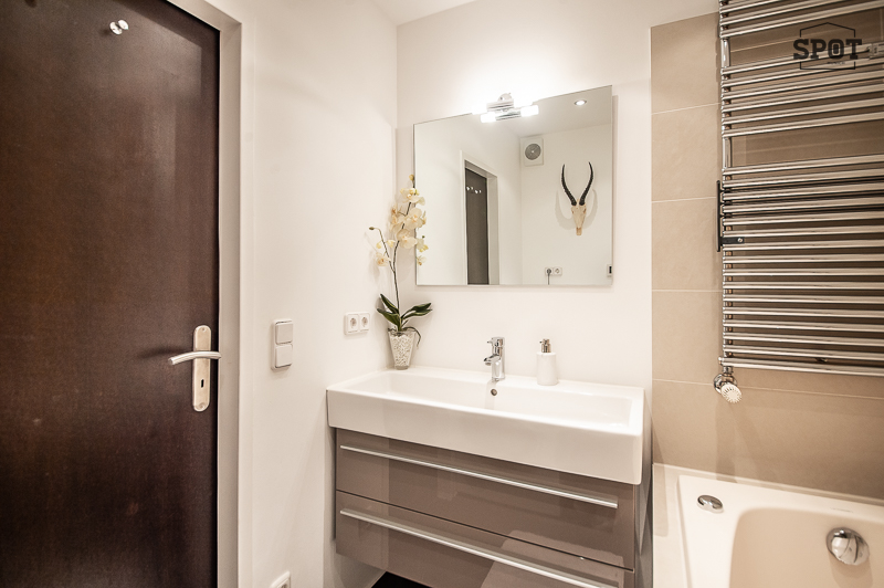 – Bathroom 1 with bathtub with whirlpool function, washbasin with vanity unit, towel warmer, tumble dryer