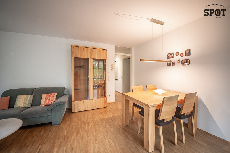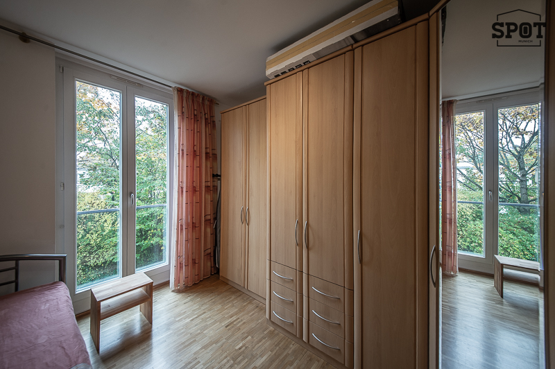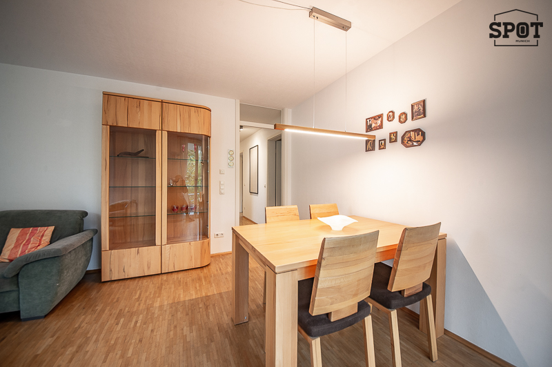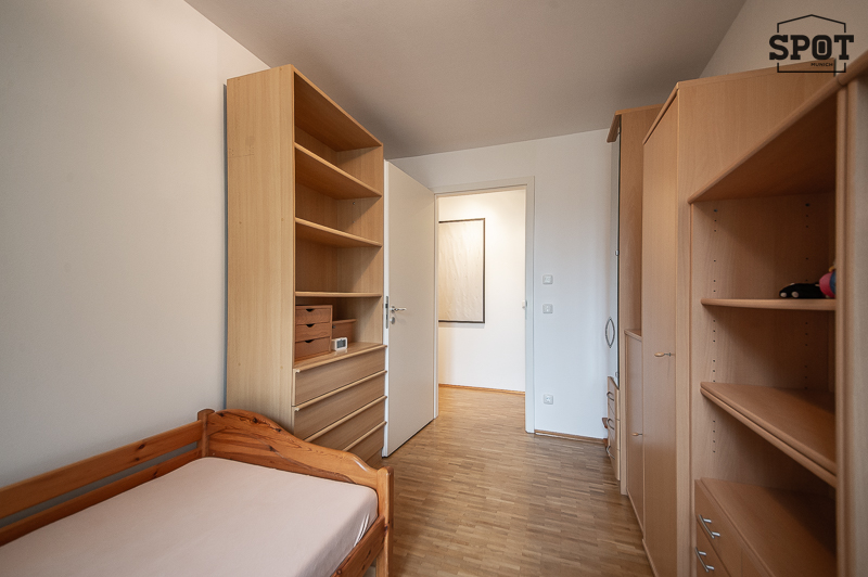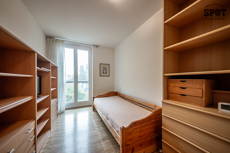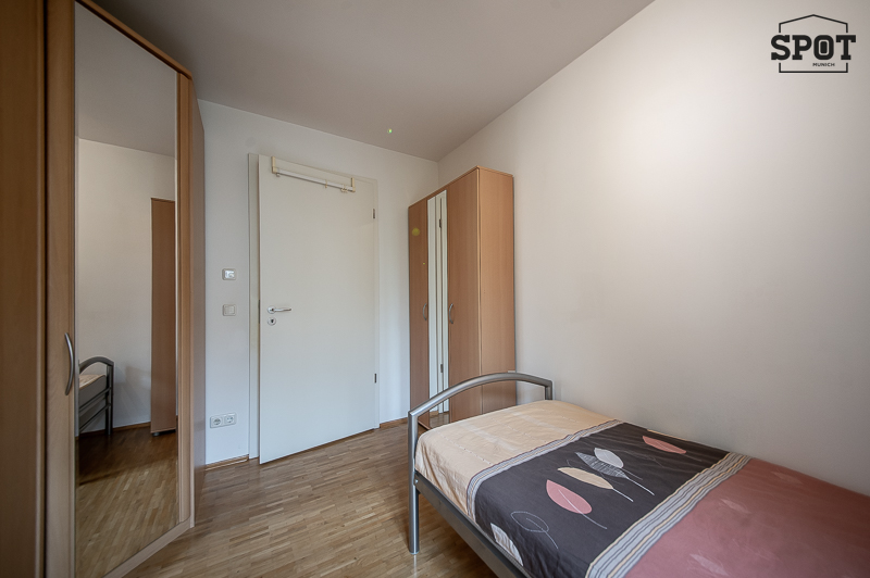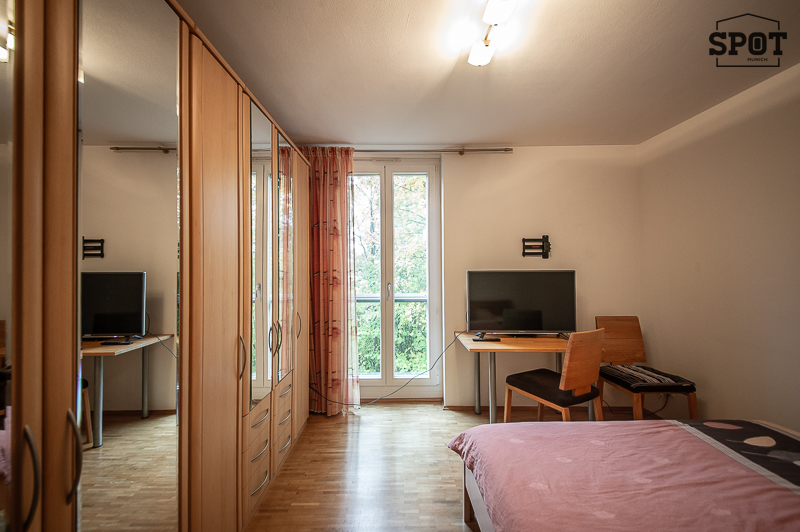 Freundliche 4 Zimmer Wohnung mit großem Balkon und drei separaten Schlafmöglichkeiten in Riem. 1. Stock mit Aufzug. Sehr gepflegtes Mehrfamilienhaus mit wenigen Wohneinheiten. Guter Grundriss, der eine optimale Aufteilung ermöglicht. Der Flur ist mit einer Garderobe mit Staumöglichkeit und einem großen Einbauschrank mit Schiebetüren ausgestattet. Von hier betritt man den hellen Wohnraum mit Zugang zum überdachten Balkon. Er ist ausgestattet mit Sofa, Couchtisch, Esstisch für 4 bis 6 Personen, Sideboard, Vitrinenschrank und Regalen, sowie Flatscreen TV. Der großzügige nahezu quadratische Balkon ist überdacht und mit Tisch und zwei Stühlen möbliert. Die separate Küche hat ein Fenster und ist sehr gut mit allem ausgestattet, was man täglich benötigt. Das Hauptschlafzimmer ist mit Doppelbett (1,60 x 2,00 m) und verfügt über einen großen Kleiderschrank und einen Arbeitsplatz. Im zweiten Zimmer steht ein Einzelbett und ein geräumiger Kleiderschrank zur Verfügung. Eine dritte separate Schlafmöglichkeit bietet das Gästezimmer. Das große Duschbad mit Fenster ist modern, mit großer Glas Eckdusche, Waschtisch mit Unterbau, Spiegelschrank und WC. Hier gibt es auch einen Anschluss für die Waschmaschine. Extra Gäst-WC vorhanden. Die Wohnung eignet sich ideal für Kollegen einer Firma. english Friendly 4-room apartment with large balcony and three separate sleeping areas in Riem. 1st floor with elevator. Very well-maintained apartment building with few residential units. Good floor plan, allowing for optimal layout. The hallway is equipped with a coat rack with storage space and a large built-in closet with sliding doors. From here, you enter the bright living room with access to the covered balcony. It is equipped with a sofa, coffee table, dining table for 4 to 6 people, sideboard, display cabinet, and shelves, as well as a flat-screen TV. The spacious, almost square balcony is covered and furnished with a table and two chairs. The separate kitchen has a window and is very well equipped with everything you need on a daily basis. The master bedroom has a double bed (1.60 x 2.00 m) and features a large wardrobe and a workspace. The second room has a single bed and a spacious wardrobe. The guest room offers a third separate sleeping option. The large shower room with window is modern, with a large glass corner shower, vanity unit, mirror cabinet, and toilet. There is also a connection for a washing machine. Extra guest toilet available. The apartment is ideal for colleagues from the same company.