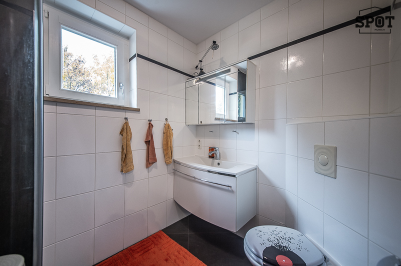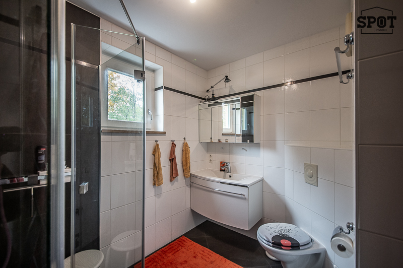 – Bathroom with window, large glass shower, vanity with base cabinet, mirror cabinet, toilet, connection for washing machine