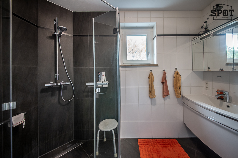 – Bad mit Fenster, großer Glasdusche, Waschtisch mit Unterbau, Spiegelschrank, WC, Anschluß für Waschmaschine