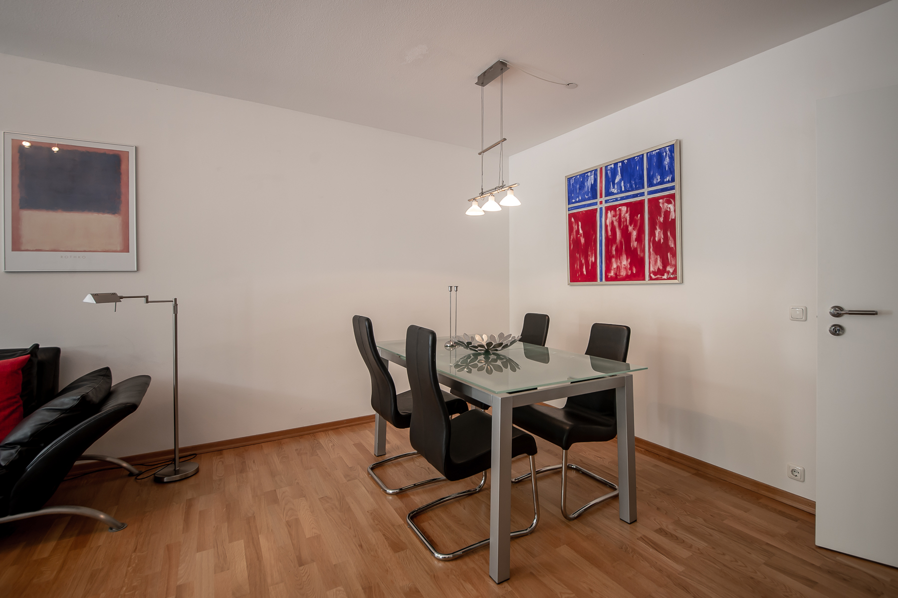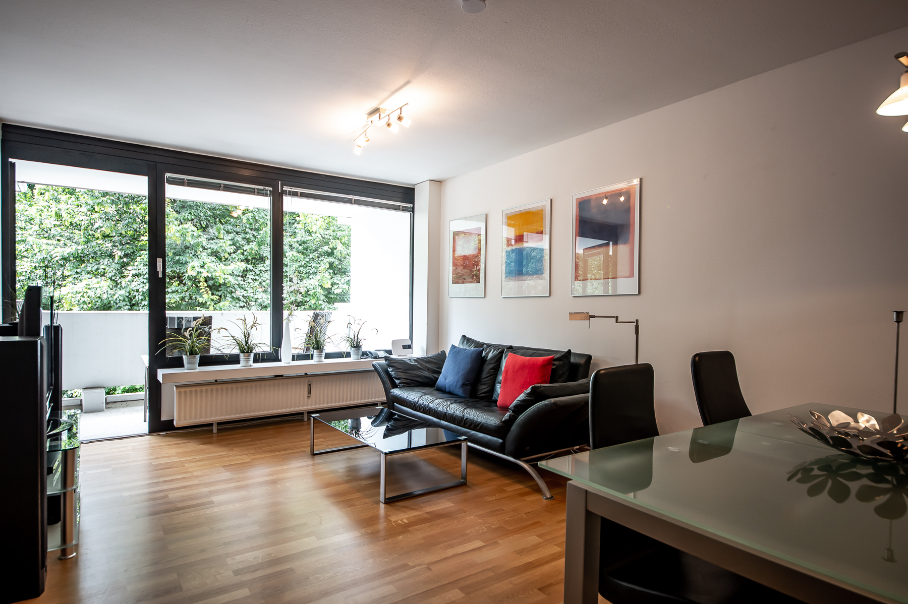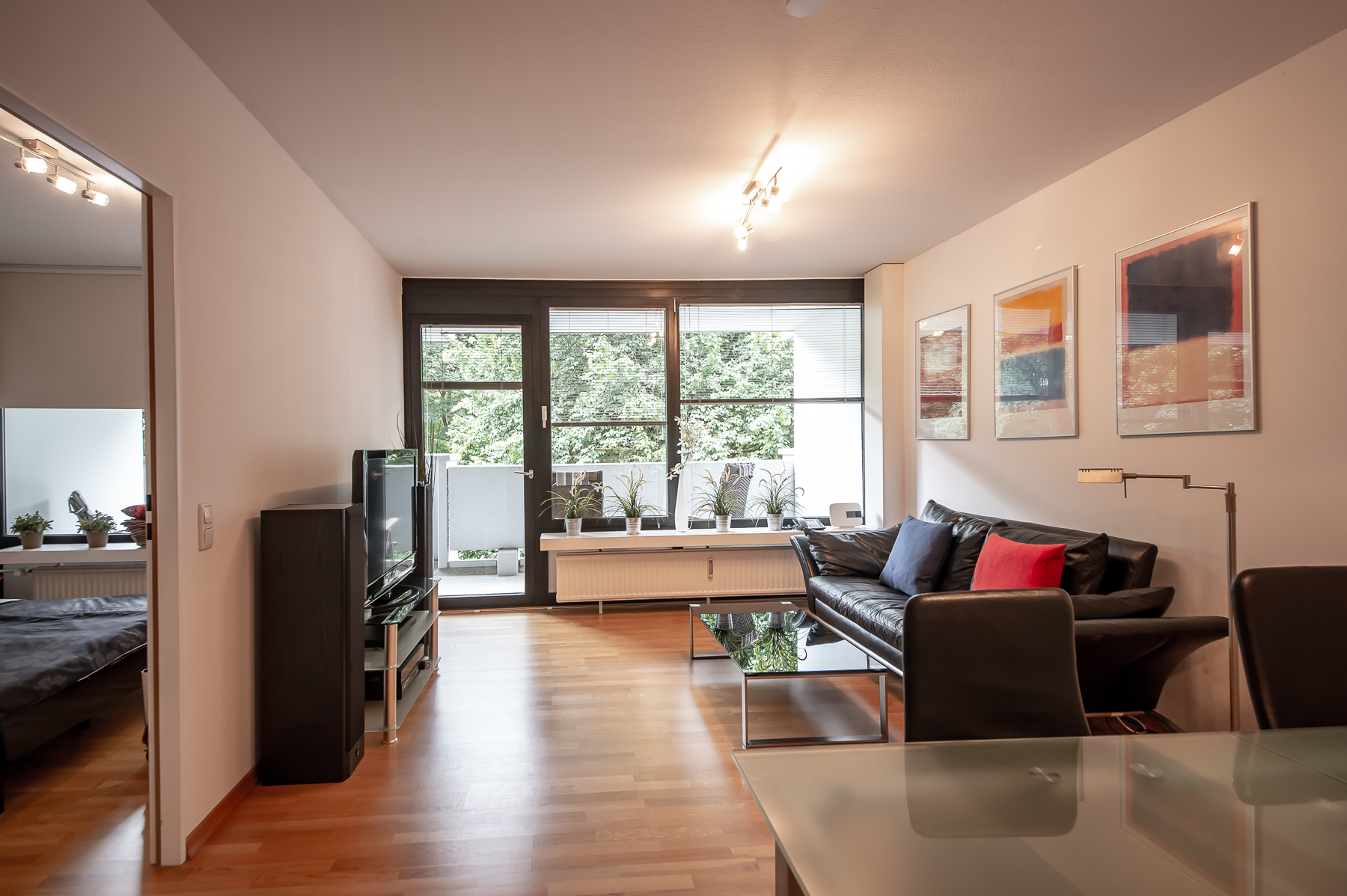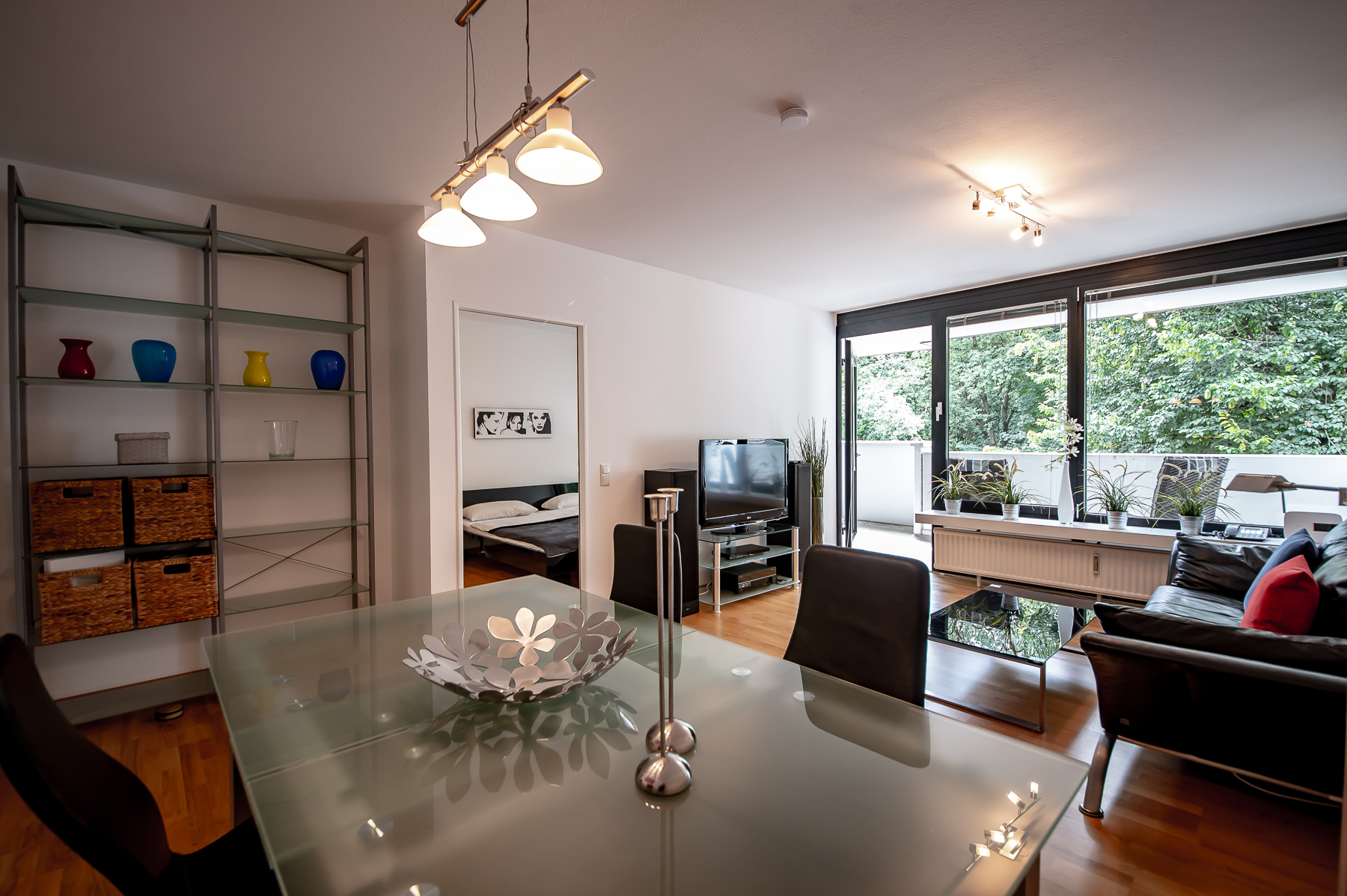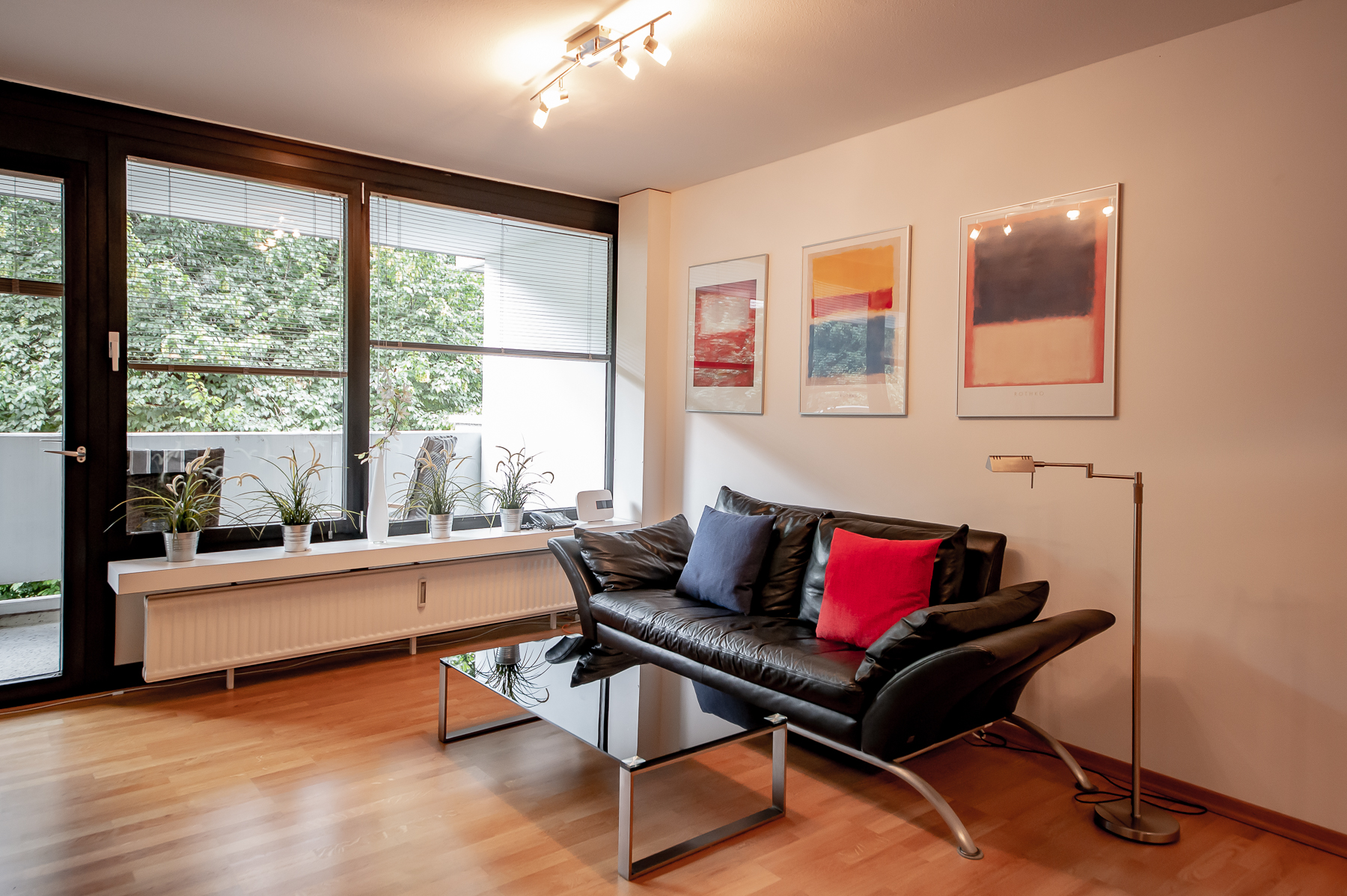 Helle, modern möblierte 2 Zimmer Wohnung mit großem überdachten Balkon an der Grenze Haidhausen/Au. Ruhiges Rückgebäude mit Blick ins Grüne, 1. Stock mit Lift. In der gesamten Wohnung befinden sich außer der modernen Möblierung schöne Leuchten und ausgesuchte Bilder. Der Wohnraum mit Zugang zur Loggia (ca. 14 qm, ausgestattet mit zwei Sitzgruppen) ist mit schwarzem Ledersofa, Glasesstisch mit 4 Lederstühlen, schönem Glasregal, Couchtisch und Lowboard mit Flatscreen TV und Musikanlage möbliert. Das angrenzende Schlafzimmer hat ein großes Doppelbett in den Maßen 1,80 x 2 m, einen Schiebetüren-Schrank mit einer Breite von 2 m, einen Sessel, eine Kommode und zwei Nachttische. Wohnzimmer wie auch Schlafzimmer haben Fenster über die gesamte Breite des Raumes, welche die Wohnung sehr hell und freundlich machen. Hier sind Innenjalousien in beiden Räumen angebracht. Die Küche mit Fenster ist separat und sehr gut ausgestattet mit allem, was man täglich benötigt. Das großzügige Bad hat ebenfalls ein Fenster und verfügt über eine Badewanne mit Glas-Duschabtrennung, einen Schrank für Bad-Utensilien, einen Waschtrockner, Waschbecken und WC. Im Eingangsbereich sind ein Spiegelschrank mit Stauraum, die Garderobe sowie ein Schuhschrank untergebracht. Neuer Parkettboden findet sich in Wohn- und Schlafzimmer; Eingangsbereich, Küche und Bad sind mit elegantem hellem Feinsteinzeug gefliest. Ein trockenes Kellerabteil im Untergeschoss gehört zur Wohnung und kann als Abstellfläche genutzt werden. english Bright, modernly furnished 2 room apartment with large covered balcony on the border Haidhausen/Au. Quiet rear building with view into the greenery, 1st floor with elevator. In the whole apartment there are, apart from the modern furnishing, beautiful lamps and selected pictures. The living room with access to the loggia (approx. 14 sqm, equipped with two seating groups) is furnished with black leather sofa, glass dining table with 4 leather chairs, beautiful glass shelf, coffee table and lowboard with flatscreen TV and music system. The adjoining bedroom has a large double bed measuring 1.80 x 2 m, a sliding door wardrobe with a width of 2 m, an armchair, a chest of drawers and two bedside tables. The living room as well as the bedroom have windows over the whole width of the room, which make the apartment very bright and friendly. There are interior blinds in both rooms. The kitchen with window is separate and very well equipped with everything you need daily. The spacious bathroom also has a window and is equipped with a bathtub with glass shower partition, a cupboard for bathroom utensils, a washer-dryer combination, washbasin and toilet. In the entrance area there is a mirror cabinet with storage space, the panel and a shoe cupboard. New parquet flooring can be found in the living room and bedroom; entrance area, kitchen and bathroom are tiled with elegant light-coloured porcelain stoneware. A dry cellar compartment in the basement belongs to the apartment and can be used as storage space.