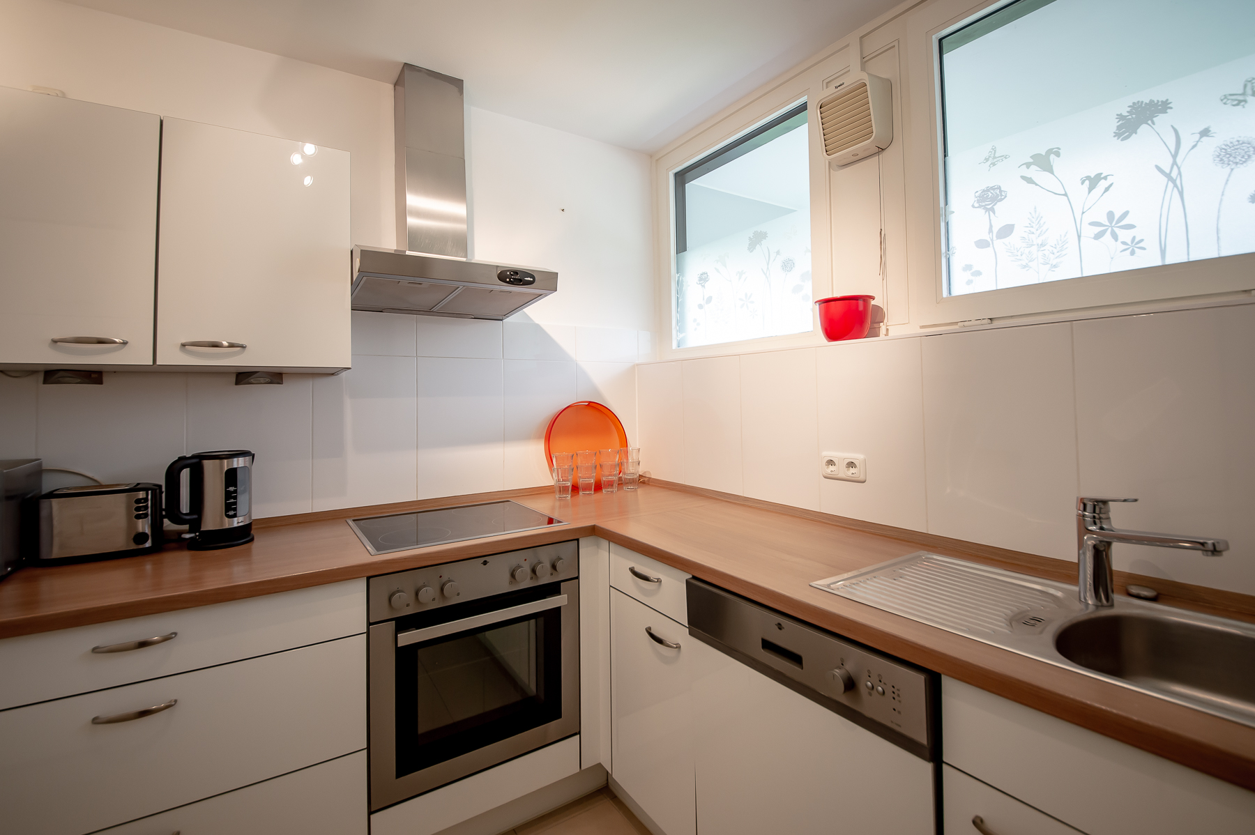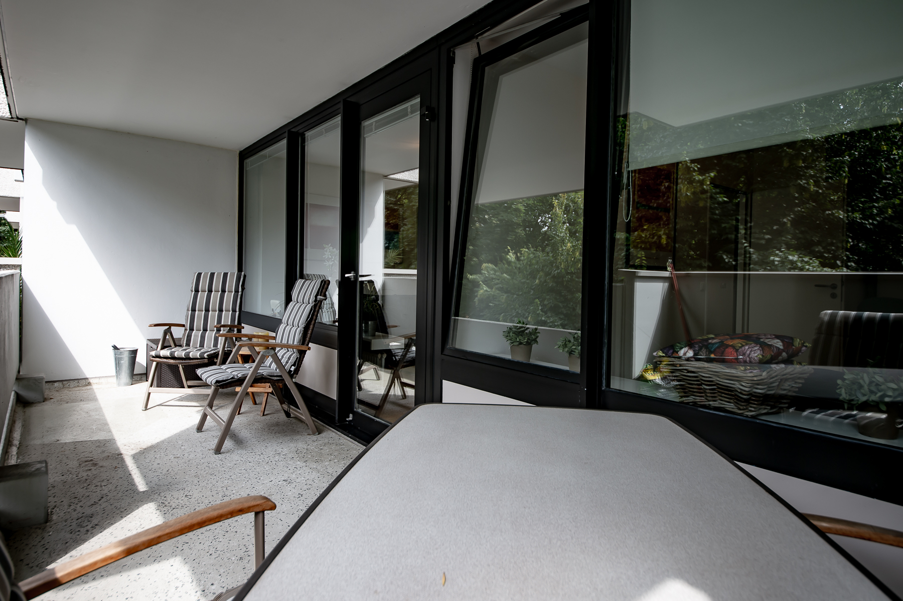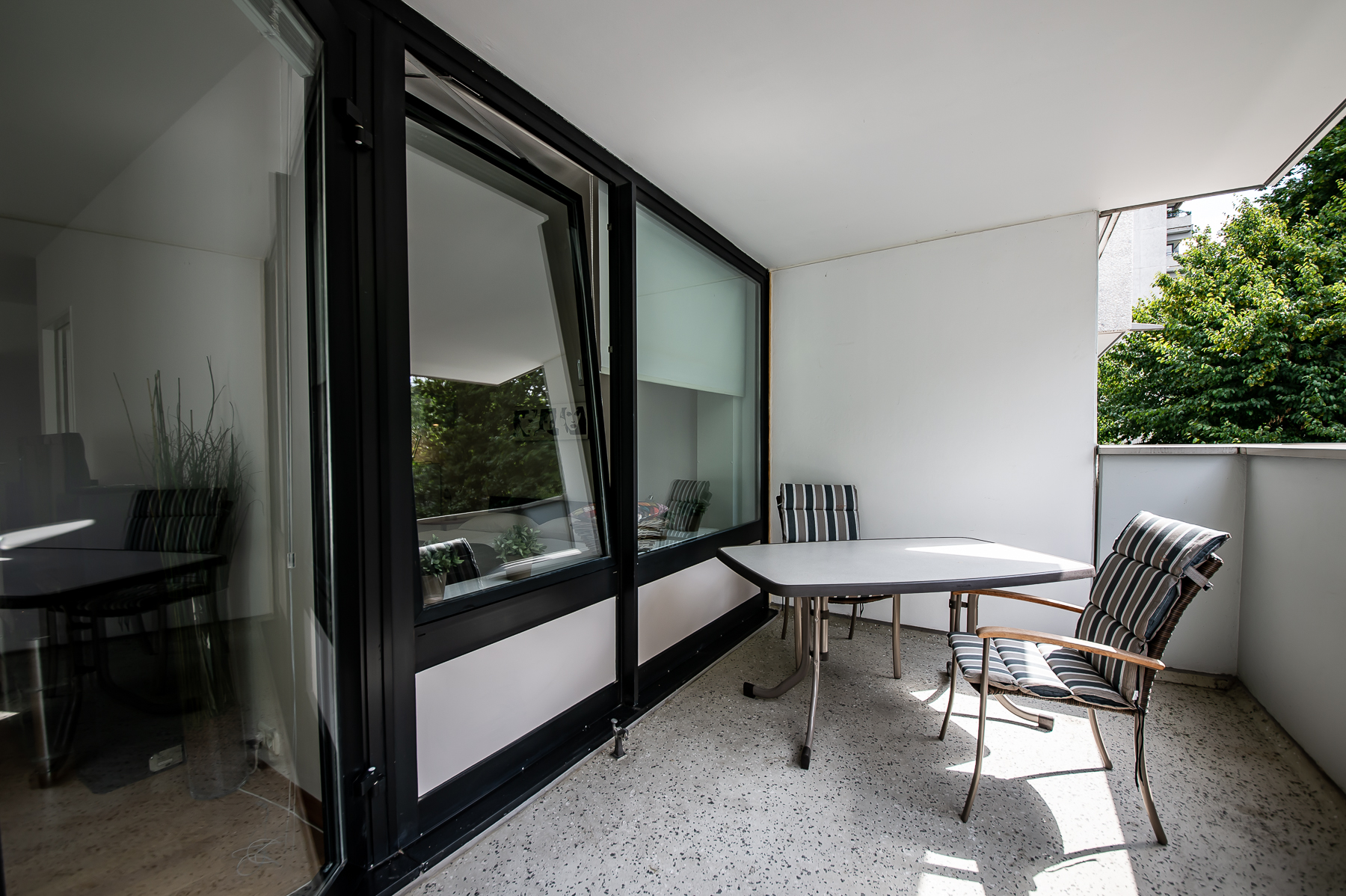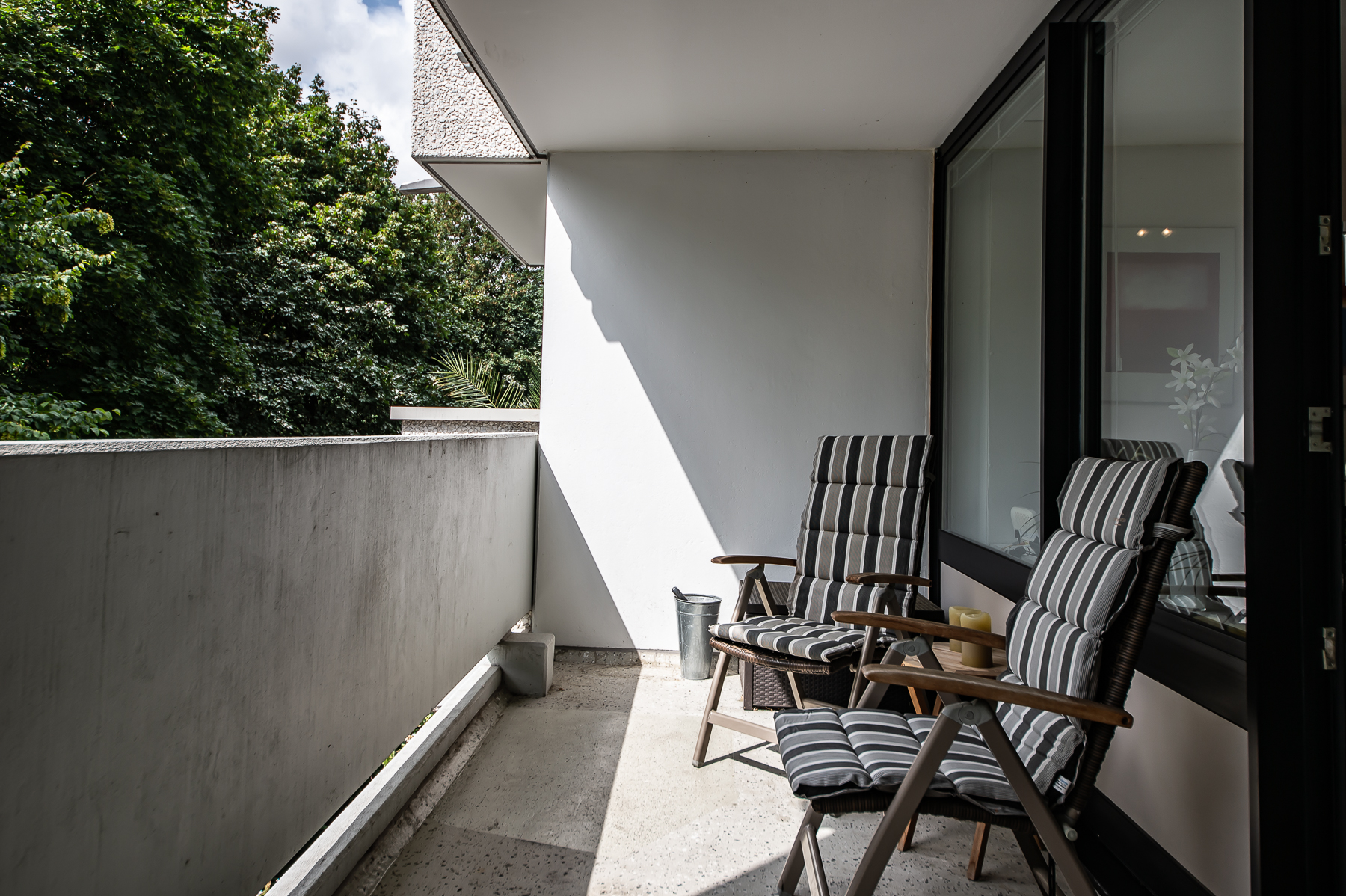 Helle, modern möblierte 2 Zimmer Wohnung mit großem überdachten Balkon an der Grenze Haidhausen/Au. Ruhiges Rückgebäude mit Blick ins Grüne, 1. Stock mit Lift. In der gesamten Wohnung befinden sich außer der modernen Möblierung schöne Leuchten und ausgesuchte Bilder. Der Wohnraum mit Zugang zur Loggia (ca. 14 qm, ausgestattet mit zwei Sitzgruppen) ist mit schwarzem Ledersofa, Glasesstisch mit 4 Lederstühlen, schönem Glasregal, Couchtisch und Lowboard mit Flatscreen TV und Musikanlage möbliert. Das angrenzende Schlafzimmer hat ein großes Doppelbett in den Maßen 1,80 x 2 m, einen Schiebetüren-Schrank mit einer Breite von 2 m, einen Sessel, eine Kommode und zwei Nachttische. Wohnzimmer wie auch Schlafzimmer haben Fenster über die gesamte Breite des Raumes, welche die Wohnung sehr hell und freundlich machen. Hier sind Innenjalousien in beiden Räumen angebracht. Die Küche mit Fenster ist separat und sehr gut ausgestattet mit allem, was man täglich benötigt. Das großzügige Bad hat ebenfalls ein Fenster und verfügt über eine Badewanne mit Glas-Duschabtrennung, einen Schrank für Bad-Utensilien, einen Waschtrockner, Waschbecken und WC. Im Eingangsbereich sind ein Spiegelschrank mit Stauraum, die Garderobe sowie ein Schuhschrank untergebracht. Neuer Parkettboden findet sich in Wohn- und Schlafzimmer; Eingangsbereich, Küche und Bad sind mit elegantem hellem Feinsteinzeug gefliest. Ein trockenes Kellerabteil im Untergeschoss gehört zur Wohnung und kann als Abstellfläche genutzt werden. english Bright, modernly furnished 2 room apartment with large covered balcony on the border Haidhausen/Au. Quiet rear building with view into the greenery, 1st floor with elevator. In the whole apartment there are, apart from the modern furnishing, beautiful lamps and selected pictures. The living room with access to the loggia (approx. 14 sqm, equipped with two seating groups) is furnished with black leather sofa, glass dining table with 4 leather chairs, beautiful glass shelf, coffee table and lowboard with flatscreen TV and music system. The adjoining bedroom has a large double bed measuring 1.80 x 2 m, a sliding door wardrobe with a width of 2 m, an armchair, a chest of drawers and two bedside tables. The living room as well as the bedroom have windows over the whole width of the room, which make the apartment very bright and friendly. There are interior blinds in both rooms. The kitchen with window is separate and very well equipped with everything you need daily. The spacious bathroom also has a window and is equipped with a bathtub with glass shower partition, a cupboard for bathroom utensils, a washer-dryer combination, washbasin and toilet. In the entrance area there is a mirror cabinet with storage space, the panel and a shoe cupboard. New parquet flooring can be found in the living room and bedroom; entrance area, kitchen and bathroom are tiled with elegant light-coloured porcelain stoneware. A dry cellar compartment in the basement belongs to the apartment and can be used as storage space.
