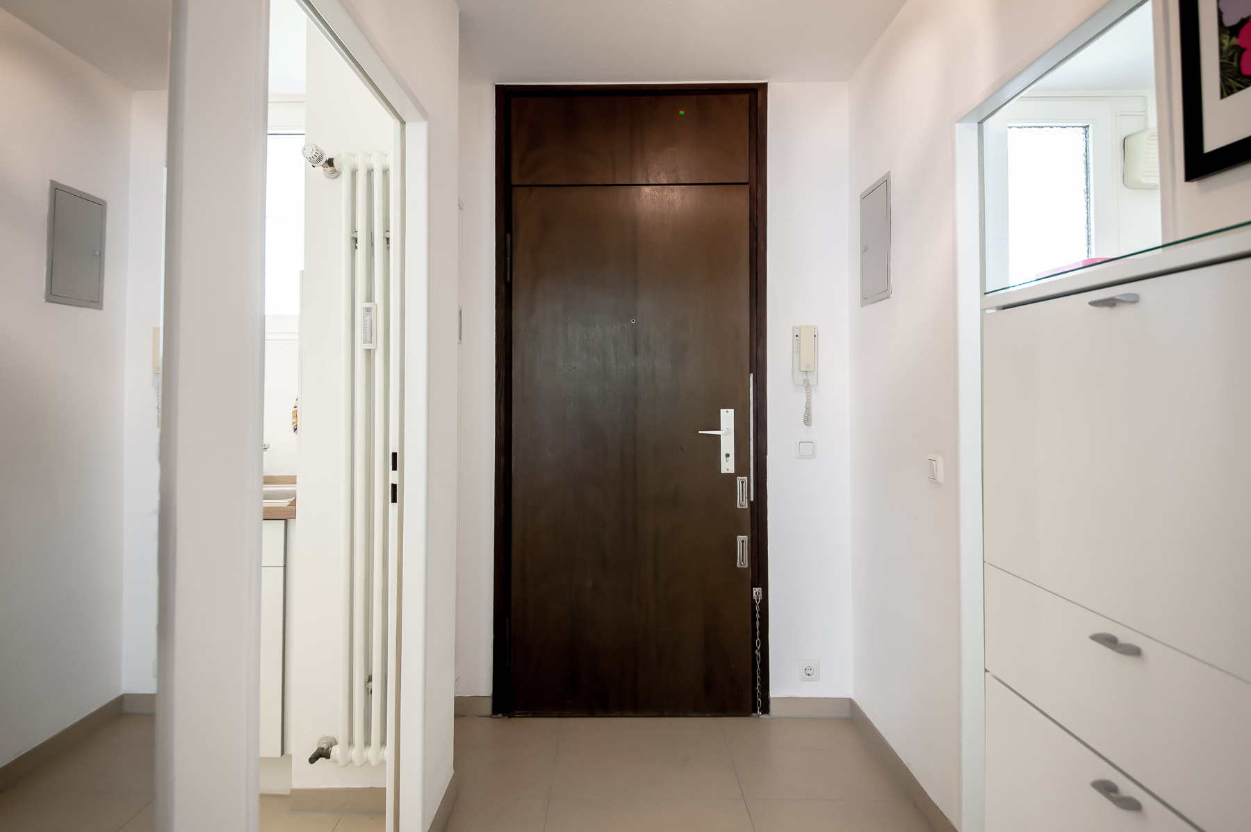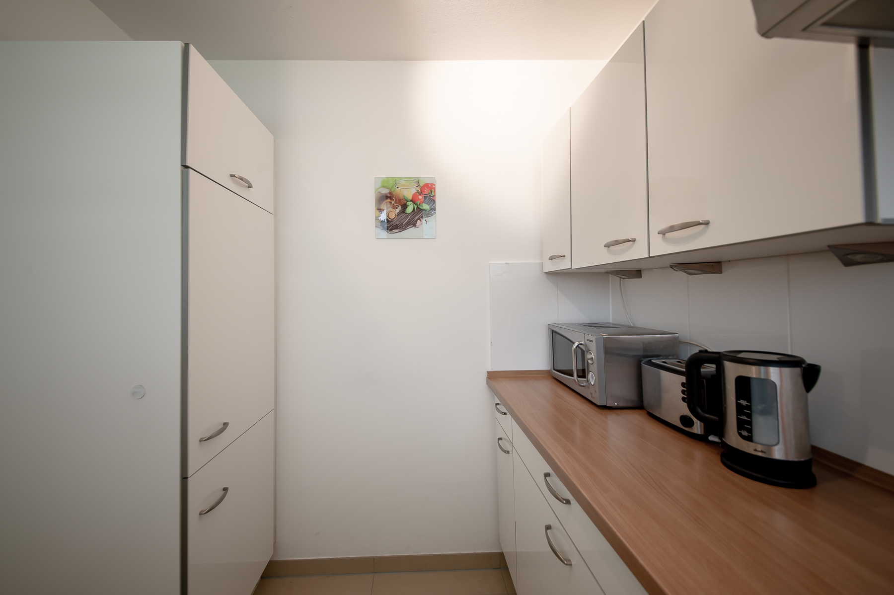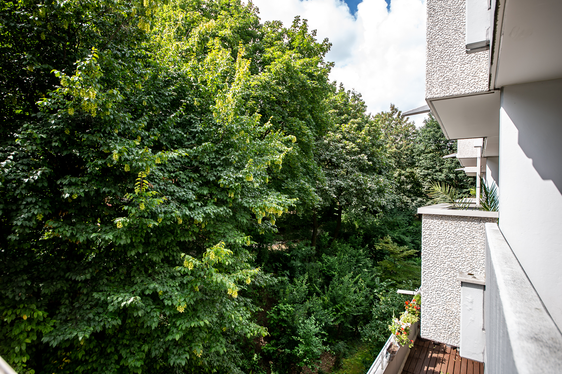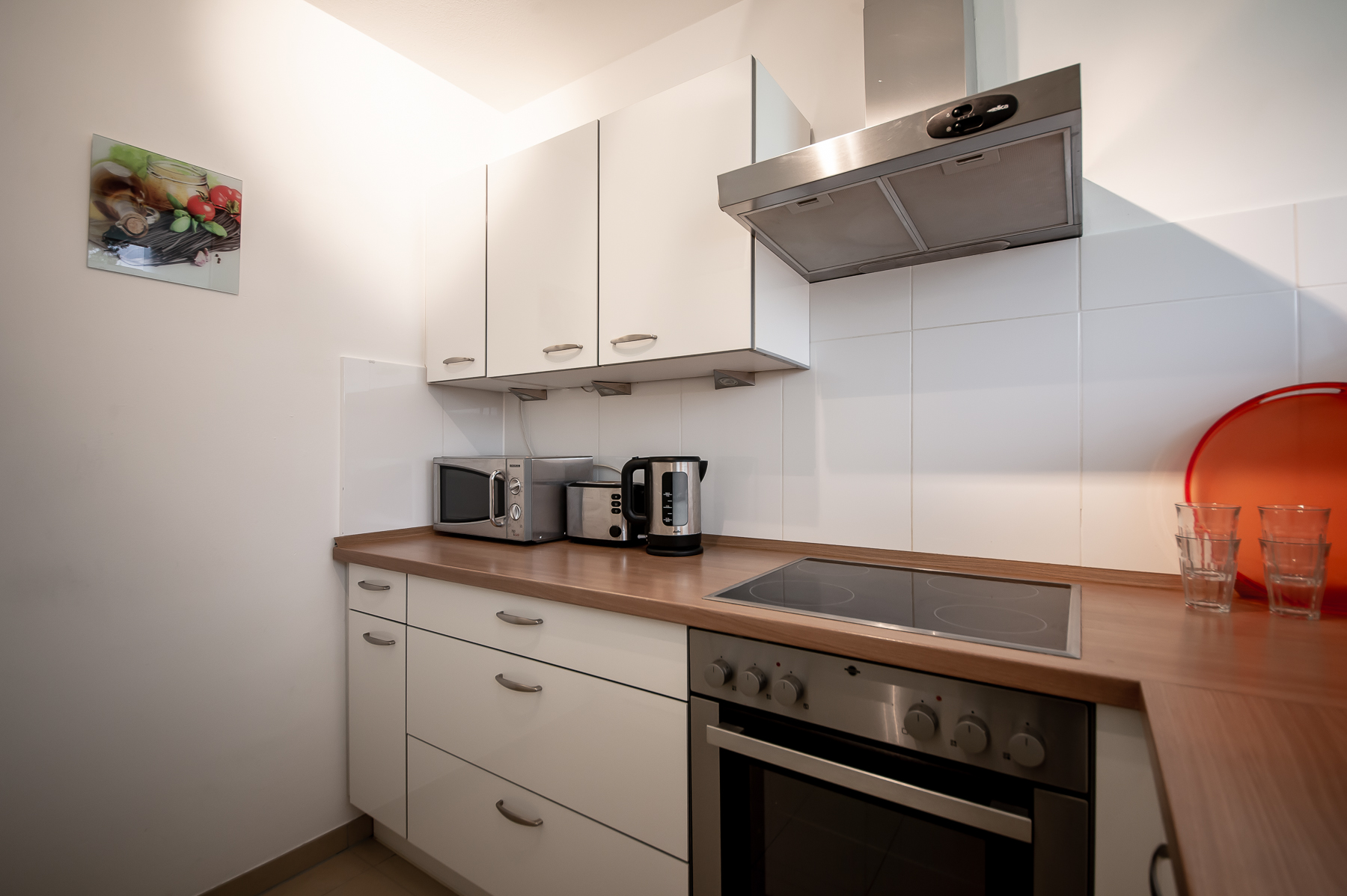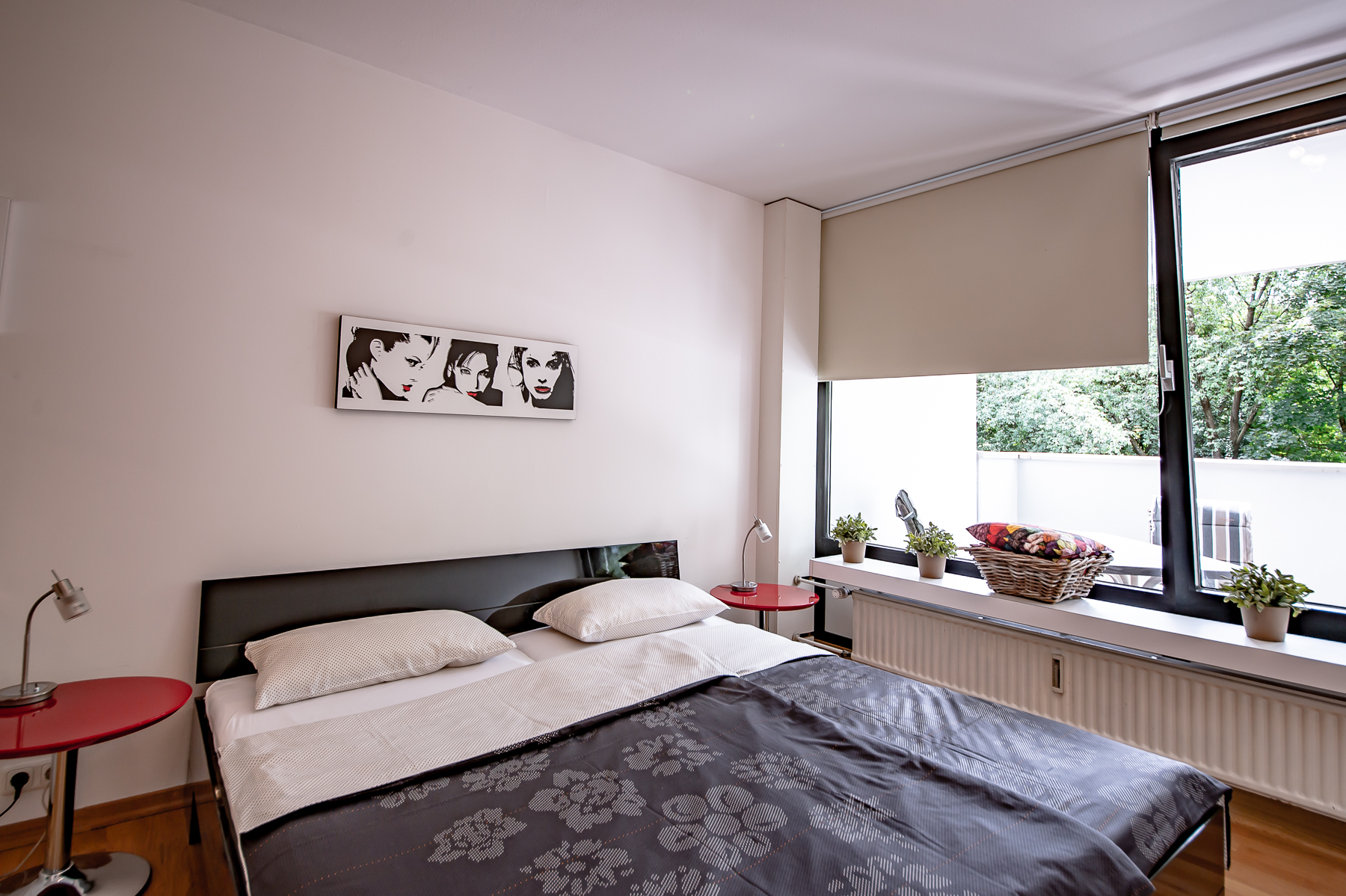 Helle, modern möblierte 2 Zimmer Wohnung mit großem überdachten Balkon an der Grenze Haidhausen/Au. Ruhiges Rückgebäude mit Blick ins Grüne, 1. Stock mit Lift. In der gesamten Wohnung befinden sich außer der modernen Möblierung schöne Leuchten und ausgesuchte Bilder. Der Wohnraum mit Zugang zur Loggia (ca. 14 qm, ausgestattet mit zwei Sitzgruppen) ist mit schwarzem Ledersofa, Glasesstisch mit 4 Lederstühlen, schönem Glasregal, Couchtisch und Lowboard mit Flatscreen TV und Musikanlage möbliert. Das angrenzende Schlafzimmer hat ein großes Doppelbett in den Maßen 1,80 x 2 m, einen Schiebetüren-Schrank mit einer Breite von 2 m, einen Sessel, eine Kommode und zwei Nachttische. Wohnzimmer wie auch Schlafzimmer haben Fenster über die gesamte Breite des Raumes, welche die Wohnung sehr hell und freundlich machen. Hier sind Innenjalousien in beiden Räumen angebracht. Die Küche mit Fenster ist separat und sehr gut ausgestattet mit allem, was man täglich benötigt. Das großzügige Bad hat ebenfalls ein Fenster und verfügt über eine Badewanne mit Glas-Duschabtrennung, einen Schrank für Bad-Utensilien, einen Waschtrockner, Waschbecken und WC. Im Eingangsbereich sind ein Spiegelschrank mit Stauraum, die Garderobe sowie ein Schuhschrank untergebracht. Neuer Parkettboden findet sich in Wohn- und Schlafzimmer; Eingangsbereich, Küche und Bad sind mit elegantem hellem Feinsteinzeug gefliest. Ein trockenes Kellerabteil im Untergeschoss gehört zur Wohnung und kann als Abstellfläche genutzt werden. english Bright, modernly furnished 2 room apartment with large covered balcony on the border Haidhausen/Au. Quiet rear building with view into the greenery, 1st floor with elevator. In the whole apartment there are, apart from the modern furnishing, beautiful lamps and selected pictures. The living room with access to the loggia (approx. 14 sqm, equipped with two seating groups) is furnished with black leather sofa, glass dining table with 4 leather chairs, beautiful glass shelf, coffee table and lowboard with flatscreen TV and music system. The adjoining bedroom has a large double bed measuring 1.80 x 2 m, a sliding door wardrobe with a width of 2 m, an armchair, a chest of drawers and two bedside tables. The living room as well as the bedroom have windows over the whole width of the room, which make the apartment very bright and friendly. There are interior blinds in both rooms. The kitchen with window is separate and very well equipped with everything you need daily. The spacious bathroom also has a window and is equipped with a bathtub with glass shower partition, a cupboard for bathroom utensils, a washer-dryer combination, washbasin and toilet. In the entrance area there is a mirror cabinet with storage space, the panel and a shoe cupboard. New parquet flooring can be found in the living room and bedroom; entrance area, kitchen and bathroom are tiled with elegant light-coloured porcelain stoneware. A dry cellar compartment in the basement belongs to the apartment and can be used as storage space.