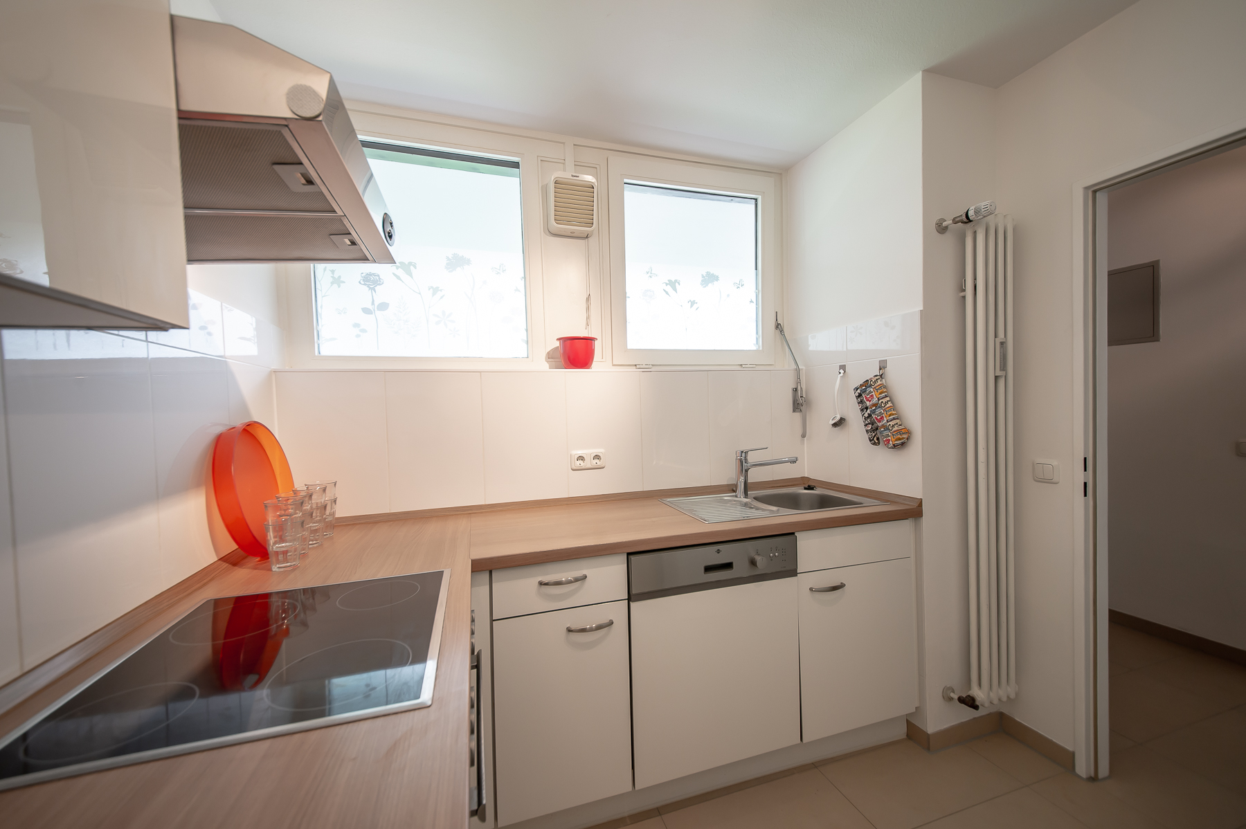 separate Küche mit Fenster, Geschirrspüler, Herd, Backofen, Dunstabzug, Mikrowelle, Kühl-Gefrier-Kombination