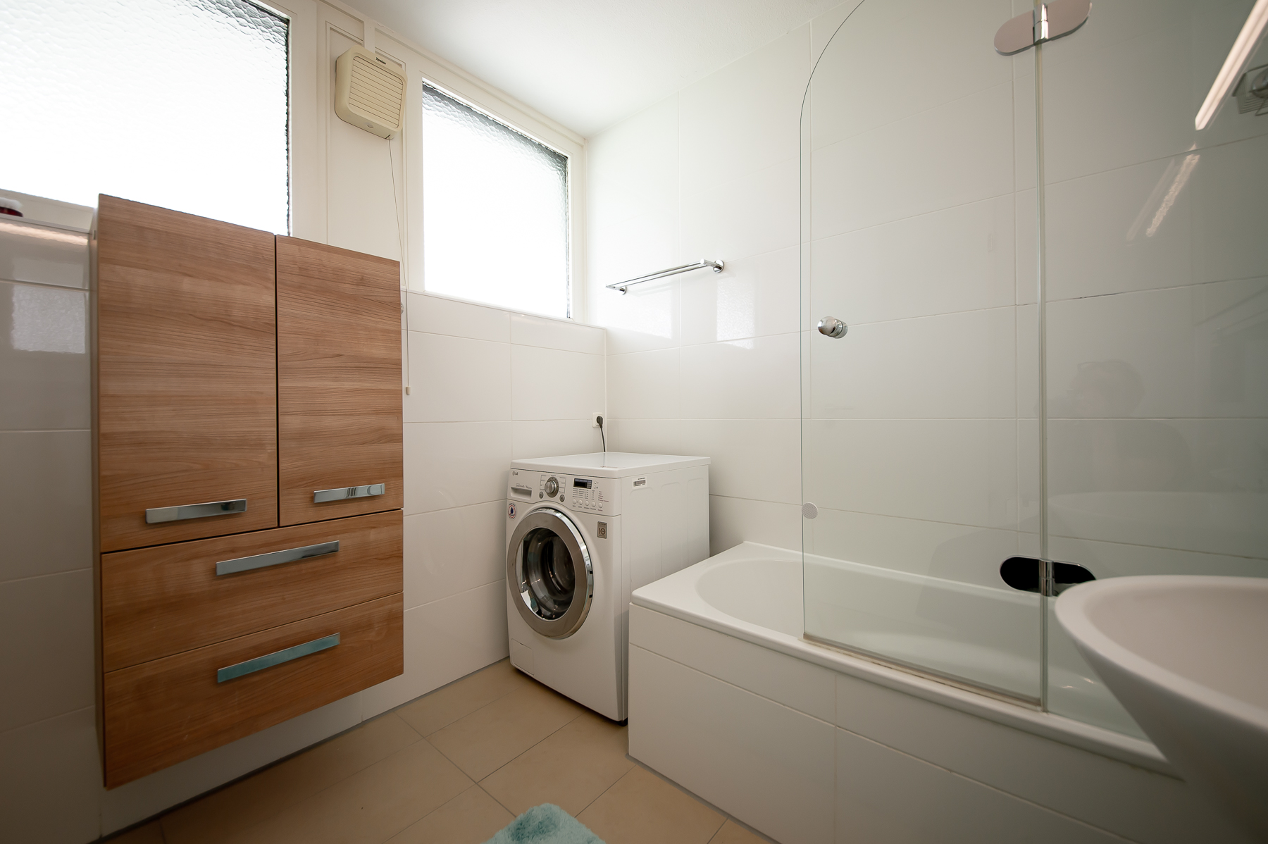 Bathroom with window, bathtub with glass shower partition, cabinet for bathroom utensils, washer-dryer combination, washbasin, WC
