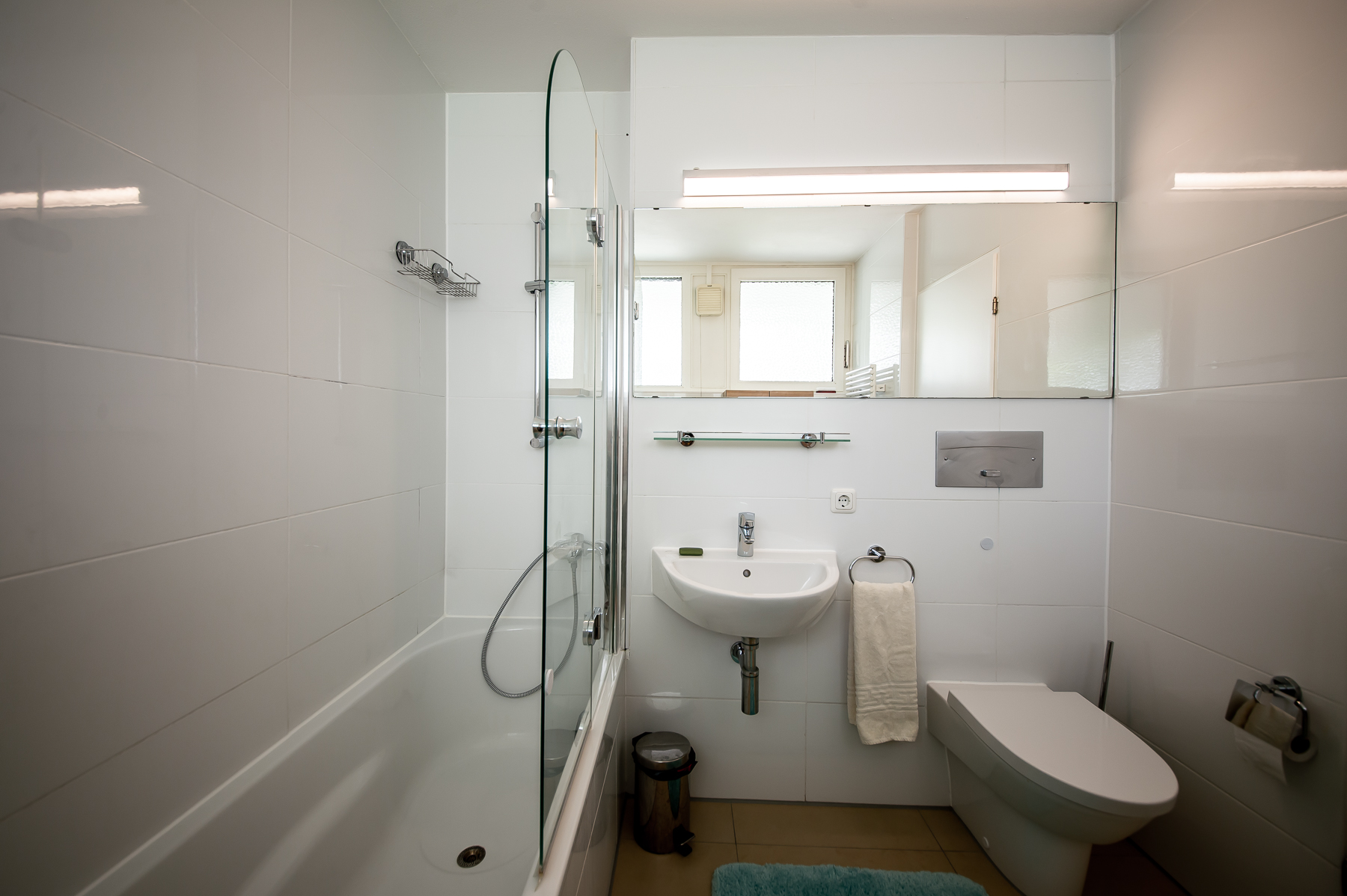 Bad mit Fenster, Badewanne mit Glas-Duschabtrennung, Schrank für Bad-Utensilien, Wasch-Trockenkombination, Waschbecken, WC