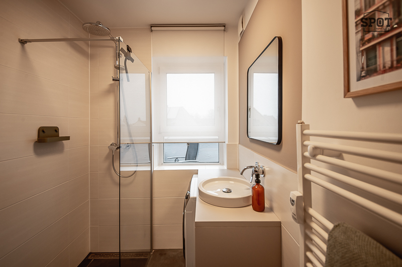 Bad mit Fenster, Bodengleicher Dusche mit Glaswand, Waschtisch, Badschrank, WC, Wasch-Trockner-Kombination