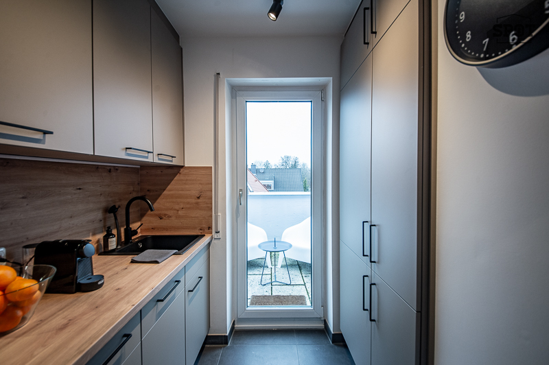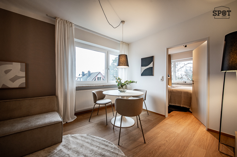 Erstbezug! Komplett neu renovierte und möblierte 2 Zimmer Wohnung mit Dachterrasse in Obermenzing. Die Wohnung befindet sich in einem kleinen Mehrfamilienhaus aus den 70iger Jahren im 2. Stock. Die hübsche Dachterrasse ist mit zwei Lounge-Sesseln ausgestattet und bietet Nachmittags- und Abendsonne. Die Möblierung sowie die Lampen sind modern, mit hübschen Details und wurden mit Geschmack ausgewählt. Das Wohnzimmer ist mit edlem beigem Sofa, rundem Ess-Arbeitstisch mit 3 Stühlen, Lowboard und Flat Screen TV möbliert. Die separate Einbauküche ist sehr gut ausgestattet u.a. mit Spülmaschine, Backofen, Kühl-Gefrier-Kombination etc. Von hier aus Zugang zur Dachterrasse. Im separaten Schlafzimmer findet sich ein Doppelbett in den Maßen 1,60 x 2 m, ein Nachttisch, hübsche Lampen und ein geräumiger Kleiderschrank. Das moderne weiße Bad mit Fenster hat eine bodengleiche Dusche mit Glaswand, einen Waschtisch mit rundem Becken, WC und Handtuchwärmer. Hier ist auch die eigene Wasch-Trocken-Kombination untergebracht. Im Eingangsbereich stehen ein Schuhschrank und eine Garderobe zur Verfügung. Boden: hochwertiger Vinylboden im Wohn- und Schlafraum, anthrazitfarbene Fliesen in Küche, Bad und Flur. english First occupancy! Completely newly renovated and furnished 2-room apartment with roof terrace in Obermenzing. The apartment is located in a small apartment building from the 70s on the 2nd floor. The pretty roof terrace is furnished with two lounge chairs and offers afternoon and evening sun. The furnishings and lamps are modern, with pretty details and have been chosen with taste. The living room is furnished with an elegant beige sofa, round dining table with 3 chairs, lowboard and flat screen TV. The separate fitted kitchen is very well equipped with a dishwasher, oven, fridge-freezer etc. From here you have access to the roof terrace. The separate bedroom has a double bed measuring 1.60 x 2 m, a bedside table, pretty lamps and a spacious closet. The modern white bathroom with window has a floor-level shower with glass wall, a washbasin with round basin, WC and towel warmer. Here you will also find your own washer-dryer combination. There is a shoe cupboard and checkroom in the entrance area. Flooring: high-quality vinyl flooring in the living room and bedroom, anthracite-colored tiles in the kitchen, bathroom and hallway.