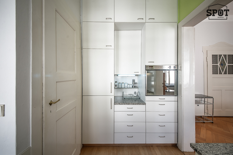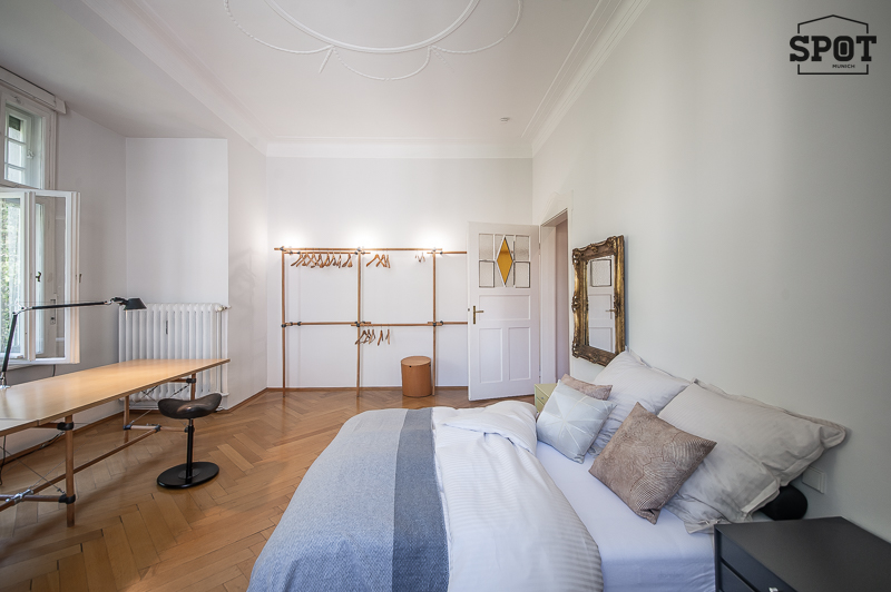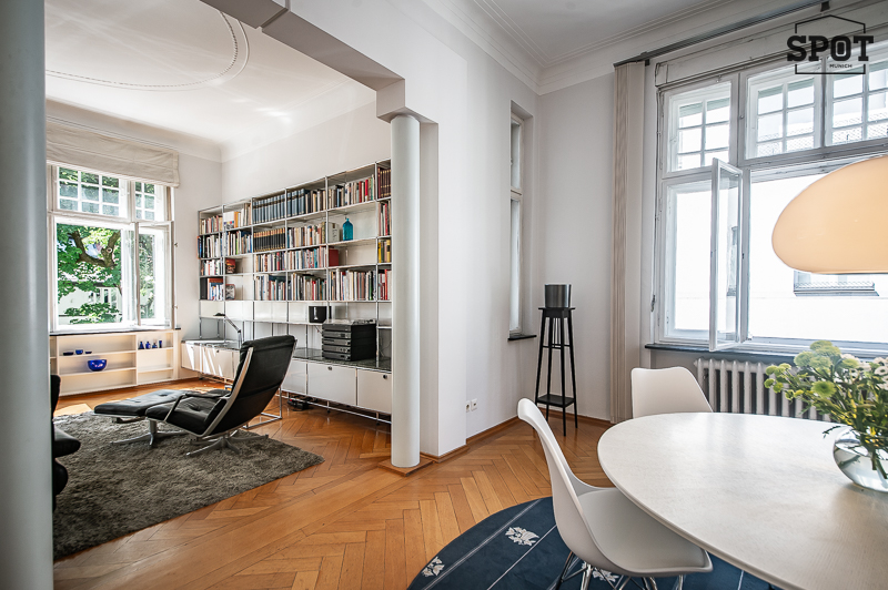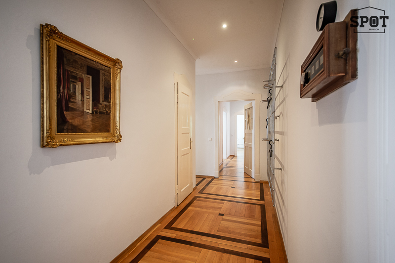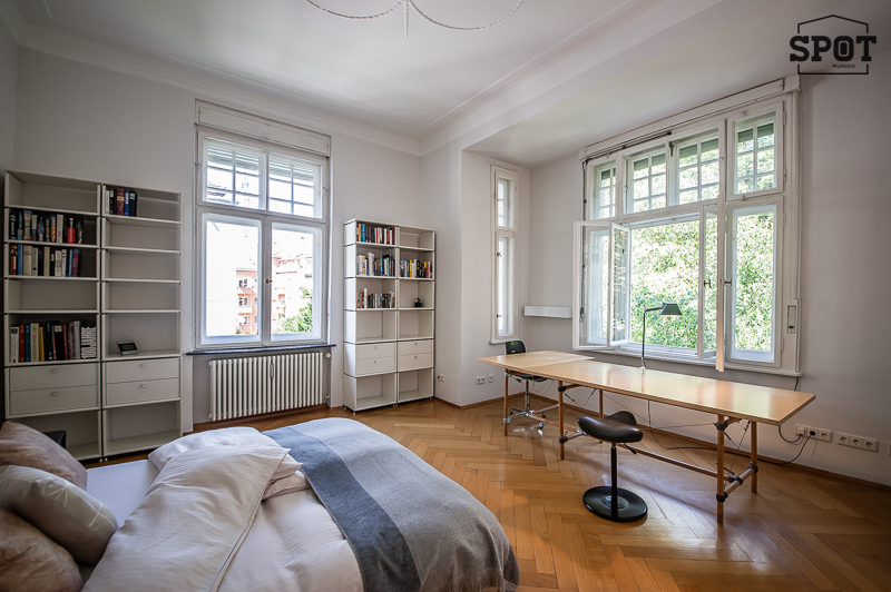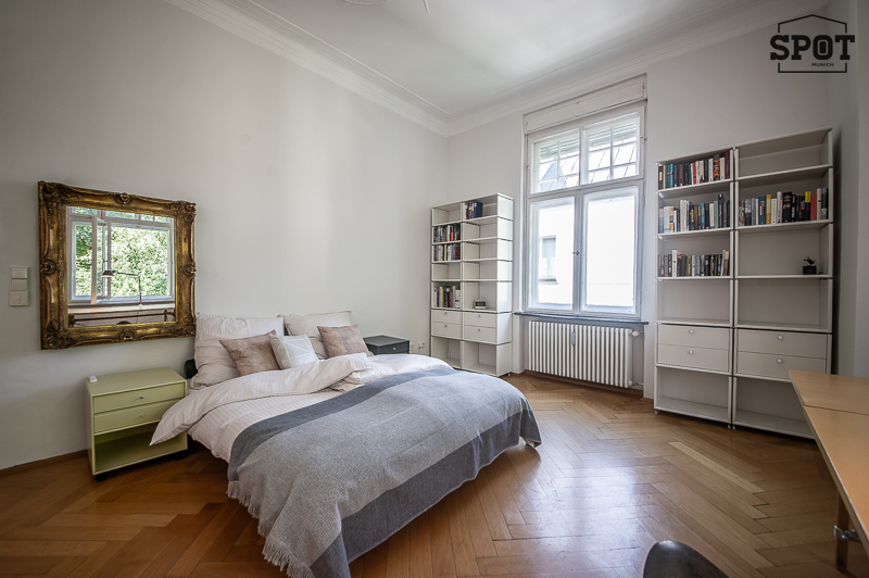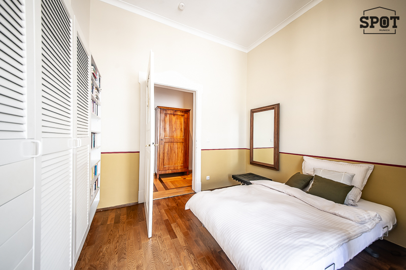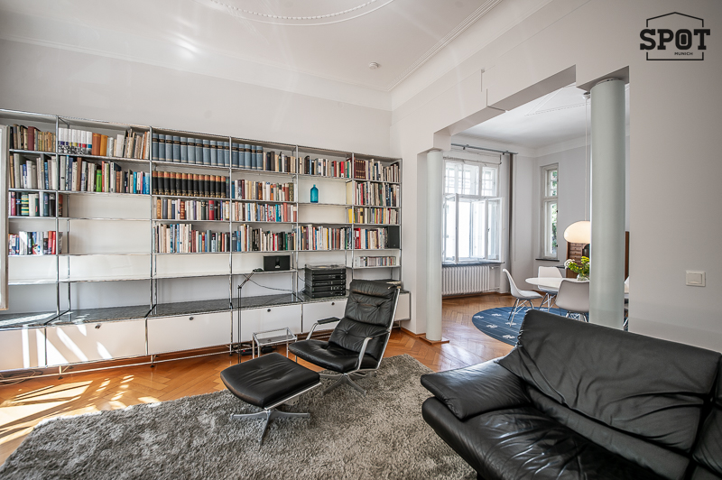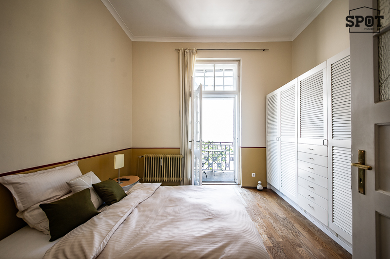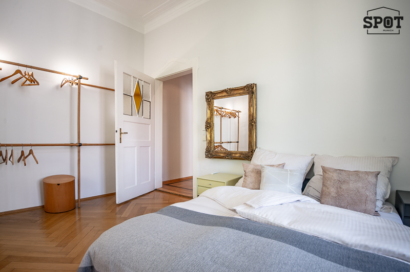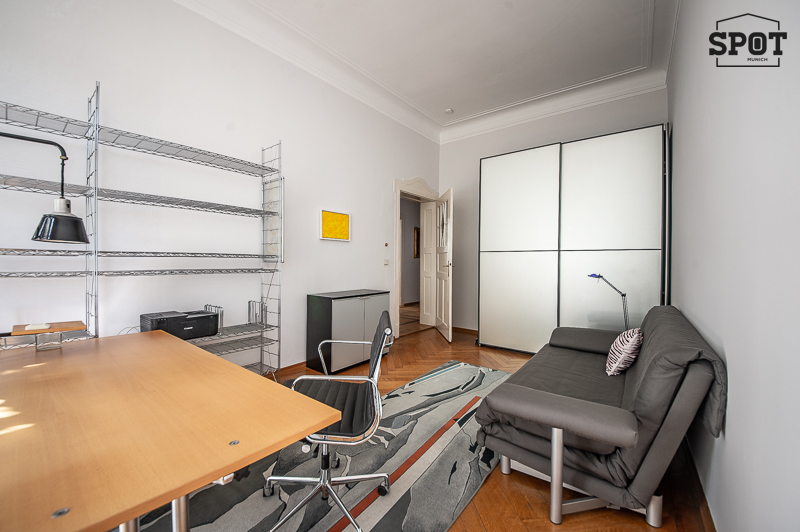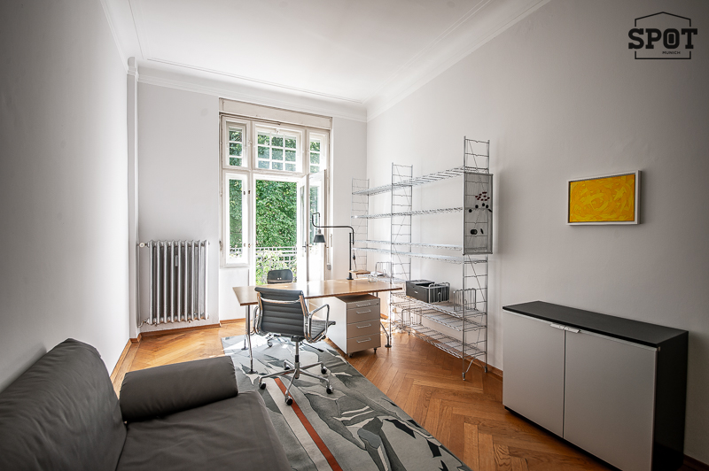 Die schön geschnittene 5 Zimmer Wohnung befindet sich in einem repräsentativen Altbau in Bogenhausen-Herzogpark, 2. Obergeschoss mit Lift. Sie bietet 2 Schlafzimmer, 2 Bäder, 1 Arbeits-/Gästezimmer und 2 Balkone. Der Altbau aus dem Jahre 1911 (später Jugendstil) besticht durch die Deckenhöhe und den großzügigen Grundriss. Die Wohnung ist mit geschmackvollen hochwertigen Möbeln ausgestattet. Die Deckenhöhe von 3,80 m schafft eine Atmosphäre von Leichtigkeit und Ruhe. Der Grundriss ist typisch für Altbauwohnungen. Vom großzügigen Flur gehen links die Türen zu Wohnzimmer, Schlafzimmern, Küche und Bädern ab. Der Einrichtungsstil ist modern mit klassischen Elementen. Schöne Lampen und Bilder machen die Räume trotz ihrer Größe angenehm und gemütlich. Ein modern eingerichteter Wohnbereich ist mit 2 Sofas, Sessel mit Hocker, USM-Haller Regalen und TV Board mit Flat Screen TV möbliert. Das separate Esszimmer bietet einen großen runden Esstisch mit Platz für 5 Personen, Sideboard und einen alten Sekretär. Die Küche grenzt an das Esszimmer und ist perfekt ausgestattet mit allem, was man täglich benötigt. Die Wohnung verfügt über zwei separate Schlafzimmer. Das 1. Schlafzimmer hat ein Doppelbett in den Maßen 1,40 x 2 m, einen Kleiderschrank und Zugang zum Balkon. Das 2. Schlafzimmer ist mit Doppelbett von 1,60 x 2 m und schönem großen Schreibtisch. Das 3. Zimmer verfügt über ein Schlafsofa sowie einen Schrank, Schreibtisch und Regale. Von dort geht es zum zweiten Balkon. In der Wohnung gibt es zwei Bäder – eines mit Dusche und Waschtisch, das andere mit Dusche, Waschbecken und WC. Eine Waschmaschine-Trockner Kombination befindet sich ebenfalls in der Wohnung. Eine praktische Kammer bietet zusätzlichen Stauraum. Bodenbelag: schöner alter Fischgrät-Parkett und Fliesenboden english This beautifully laid out 5-room apartment is located in a prestigious old building in Bogenhausen-Herzogpark, on the 2nd floor with elevator. It offers 2 bedrooms, 2 bathrooms, 1 study/guest room, and 2 balconies. The old building, dating from 1911 (later Art Nouveau), impresses with its high ceilings and spacious floor plan. The apartment is furnished with tasteful, high-quality furniture. The ceiling height of 3.80 m creates an atmosphere of lightness and tranquility. The floor plan is typical for old buildings. The spacious hallway leads to the living room, bedrooms, kitchen, and bathrooms on the left. The interior design is modern with classic elements. Beautiful lamps and pictures make the rooms pleasant and cozy despite their size. The modern living area is furnished with two sofas, an armchair with footstool, USM Haller shelves, and a TV stand with flat-screen TV. The separate dining room has a large round dining table that seats five, a sideboard, and an antique secretary desk. The kitchen is adjacent to the dining room and is perfectly equipped with everything you need for everyday life. The apartment has two separate bedrooms. The first bedroom has a double bed measuring 1.40 x 2 m, a wardrobe, and access to the balcony. The second bedroom has a double bed measuring 1.60 x 2 m and a beautiful large desk. The third room has a sofa bed, a wardrobe, a desk, and shelves. From there, you can access the second balcony. The apartment has two bathrooms – one with a shower and washbasin, the other with a shower, washbasin, and toilet. A washer-dryer combination is also available in the apartment. A practical storage room provides additional storage space. Flooring: beautiful old herringbone parquet and tile flooring