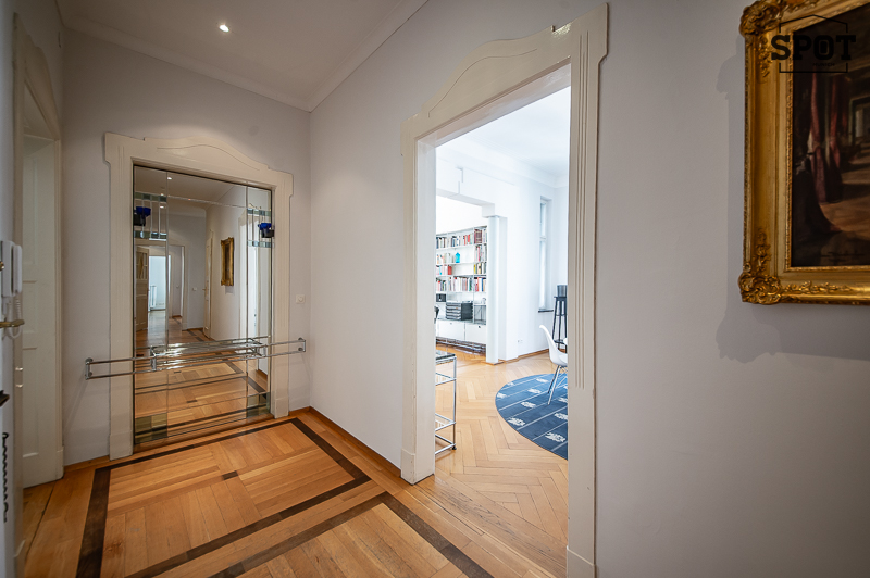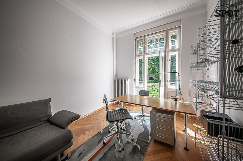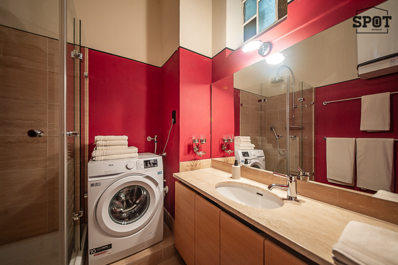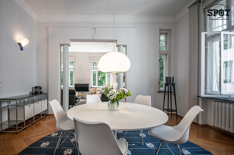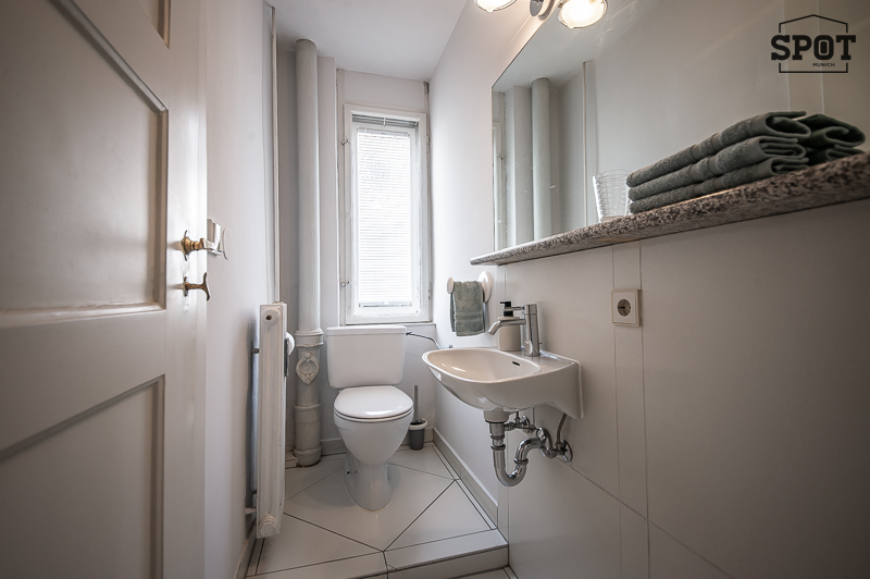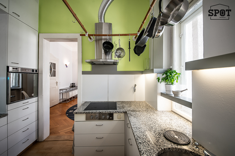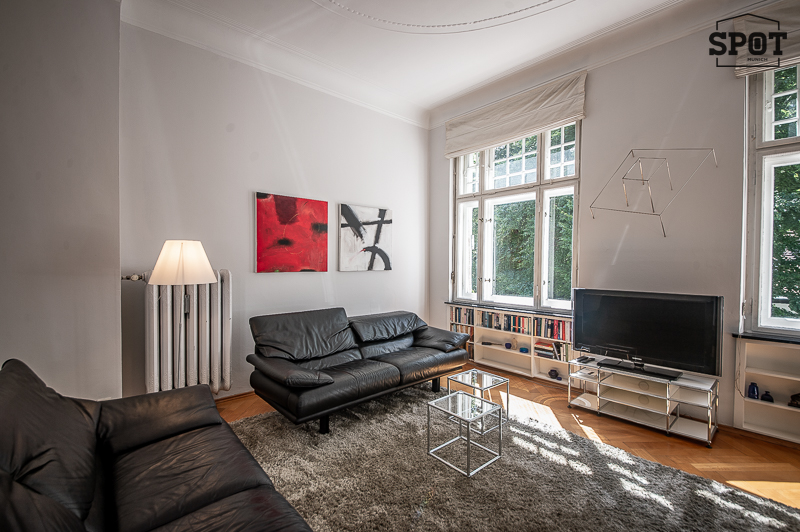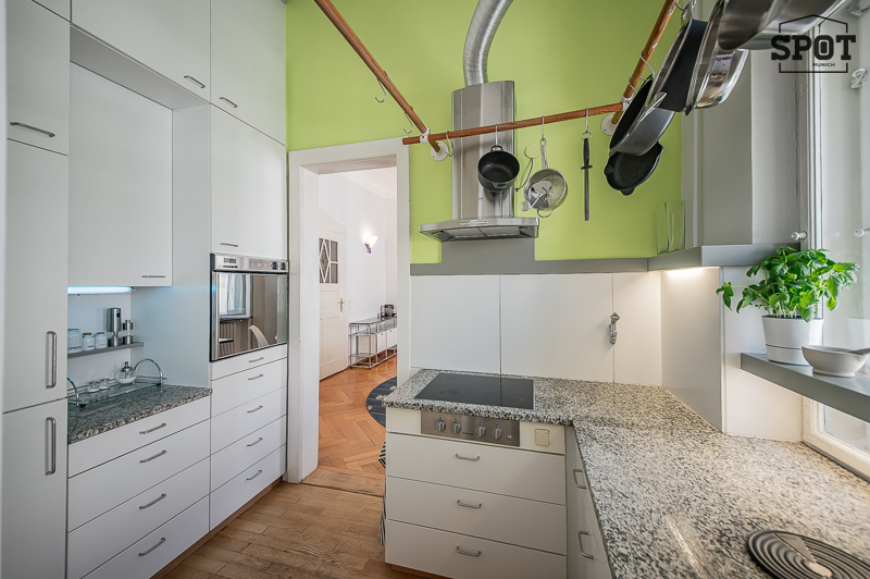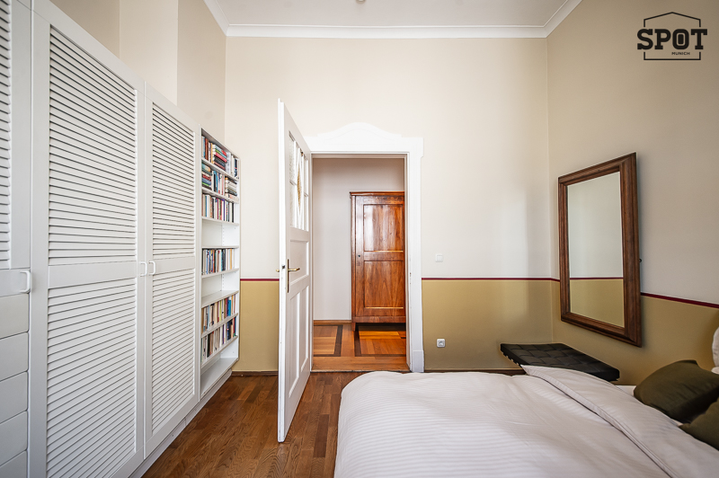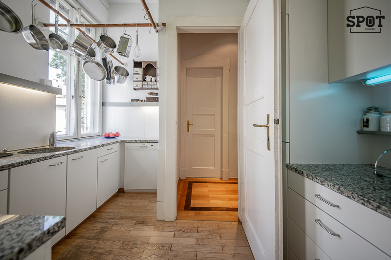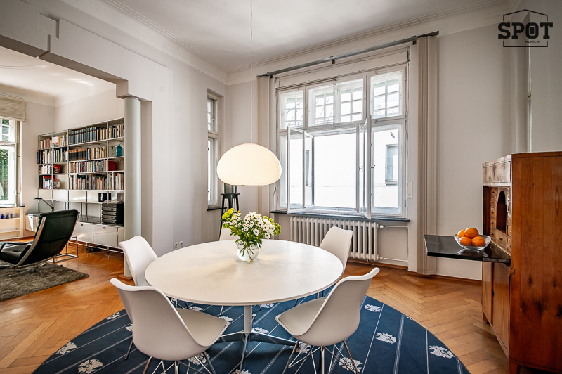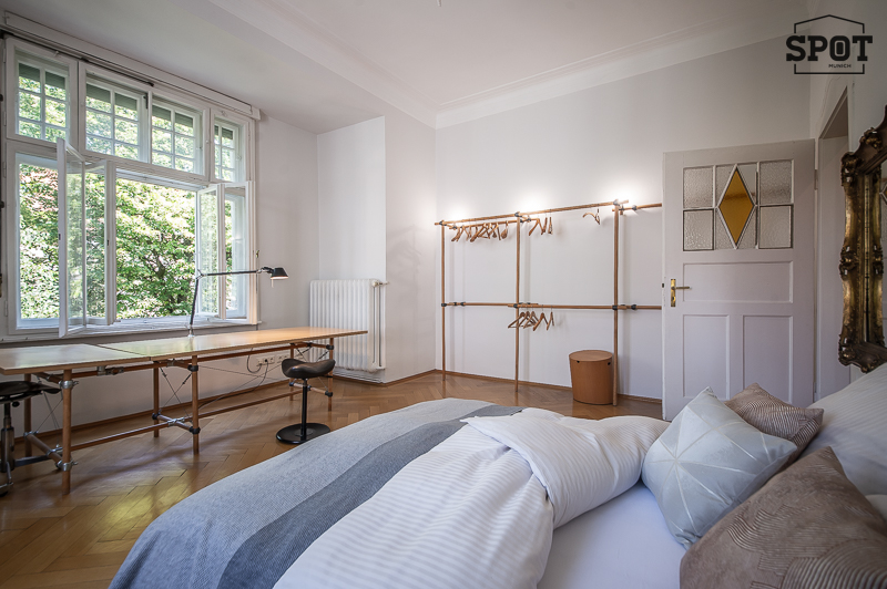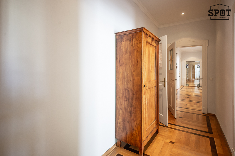 Die schön geschnittene 5 Zimmer Wohnung befindet sich in einem repräsentativen Altbau in Bogenhausen-Herzogpark, 2. Obergeschoss mit Lift. Sie bietet 2 Schlafzimmer, 2 Bäder, 1 Arbeits-/Gästezimmer und 2 Balkone. Der Altbau aus dem Jahre 1911 (später Jugendstil) besticht durch die Deckenhöhe und den großzügigen Grundriss. Die Wohnung ist mit geschmackvollen hochwertigen Möbeln ausgestattet. Die Deckenhöhe von 3,80 m schafft eine Atmosphäre von Leichtigkeit und Ruhe. Der Grundriss ist typisch für Altbauwohnungen. Vom großzügigen Flur gehen links die Türen zu Wohnzimmer, Schlafzimmern, Küche und Bädern ab. Der Einrichtungsstil ist modern mit klassischen Elementen. Schöne Lampen und Bilder machen die Räume trotz ihrer Größe angenehm und gemütlich. Ein modern eingerichteter Wohnbereich ist mit 2 Sofas, Sessel mit Hocker, USM-Haller Regalen und TV Board mit Flat Screen TV möbliert. Das separate Esszimmer bietet einen großen runden Esstisch mit Platz für 5 Personen, Sideboard und einen alten Sekretär. Die Küche grenzt an das Esszimmer und ist perfekt ausgestattet mit allem, was man täglich benötigt. Die Wohnung verfügt über zwei separate Schlafzimmer. Das 1. Schlafzimmer hat ein Doppelbett in den Maßen 1,40 x 2 m, einen Kleiderschrank und Zugang zum Balkon. Das 2. Schlafzimmer ist mit Doppelbett von 1,60 x 2 m und schönem großen Schreibtisch. Das 3. Zimmer verfügt über ein Schlafsofa sowie einen Schrank, Schreibtisch und Regale. Von dort geht es zum zweiten Balkon. In der Wohnung gibt es zwei Bäder – eines mit Dusche und Waschtisch, das andere mit Dusche, Waschbecken und WC. Eine Waschmaschine-Trockner Kombination befindet sich ebenfalls in der Wohnung. Eine praktische Kammer bietet zusätzlichen Stauraum. Bodenbelag: schöner alter Fischgrät-Parkett und Fliesenboden english This beautifully laid out 5-room apartment is located in a prestigious old building in Bogenhausen-Herzogpark, on the 2nd floor with elevator. It offers 2 bedrooms, 2 bathrooms, 1 study/guest room, and 2 balconies. The old building, dating from 1911 (later Art Nouveau), impresses with its high ceilings and spacious floor plan. The apartment is furnished with tasteful, high-quality furniture. The ceiling height of 3.80 m creates an atmosphere of lightness and tranquility. The floor plan is typical for old buildings. The spacious hallway leads to the living room, bedrooms, kitchen, and bathrooms on the left. The interior design is modern with classic elements. Beautiful lamps and pictures make the rooms pleasant and cozy despite their size. The modern living area is furnished with two sofas, an armchair with footstool, USM Haller shelves, and a TV stand with flat-screen TV. The separate dining room has a large round dining table that seats five, a sideboard, and an antique secretary desk. The kitchen is adjacent to the dining room and is perfectly equipped with everything you need for everyday life. The apartment has two separate bedrooms. The first bedroom has a double bed measuring 1.40 x 2 m, a wardrobe, and access to the balcony. The second bedroom has a double bed measuring 1.60 x 2 m and a beautiful large desk. The third room has a sofa bed, a wardrobe, a desk, and shelves. From there, you can access the second balcony. The apartment has two bathrooms – one with a shower and washbasin, the other with a shower, washbasin, and toilet. A washer-dryer combination is also available in the apartment. A practical storage room provides additional storage space. Flooring: beautiful old herringbone parquet and tile flooring