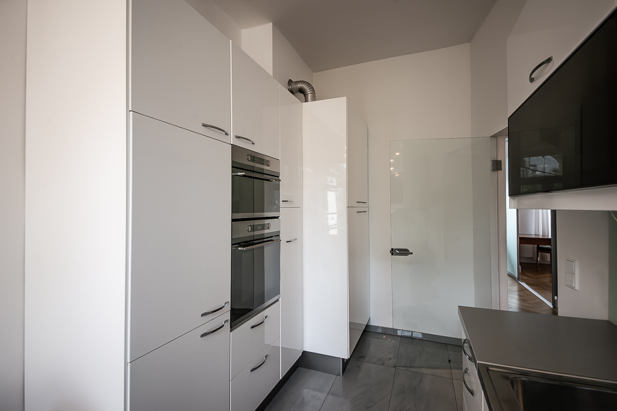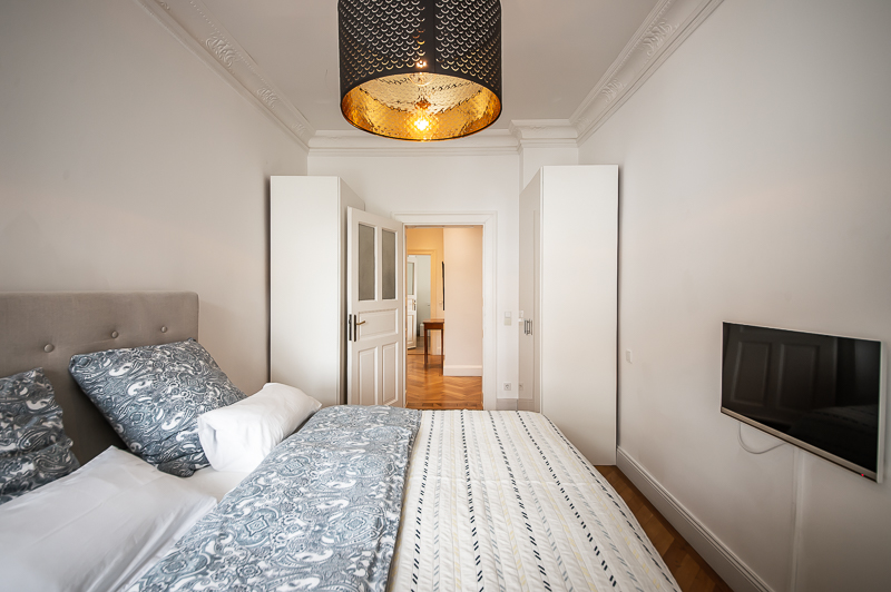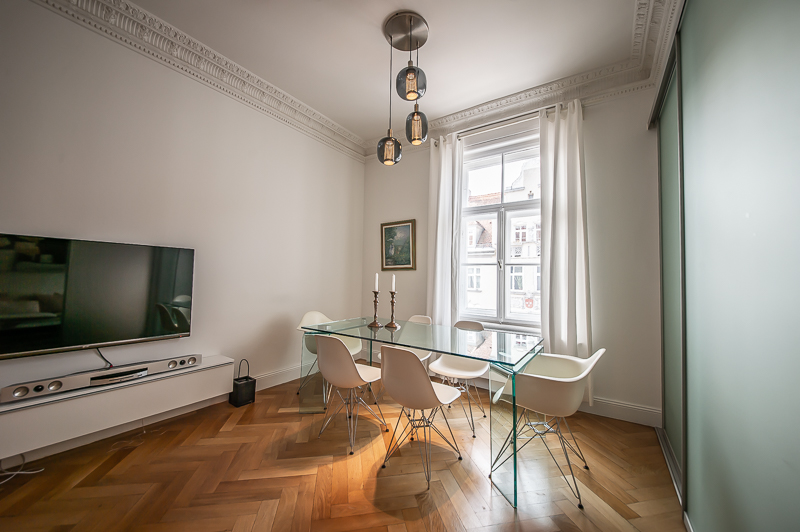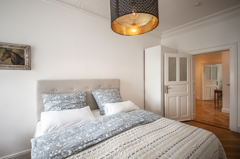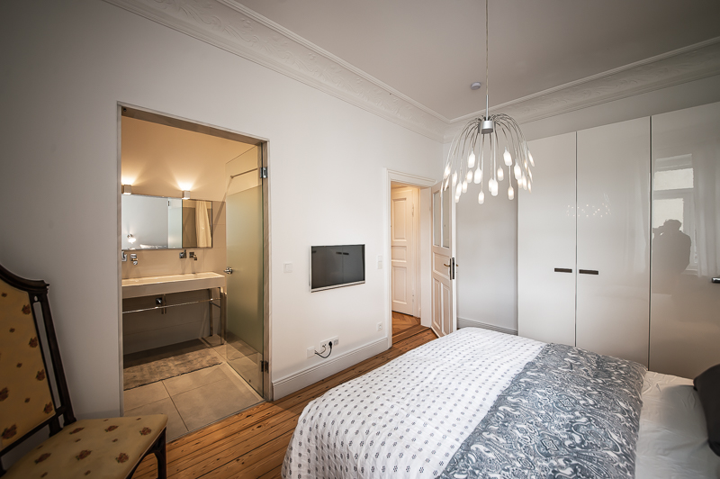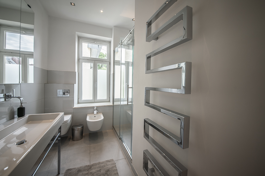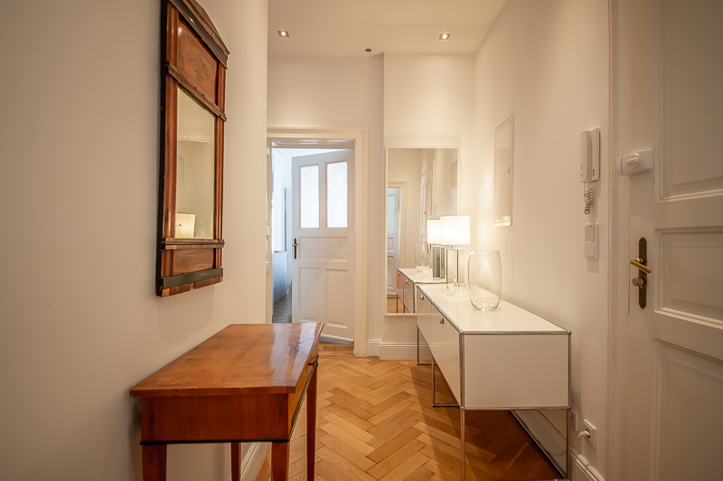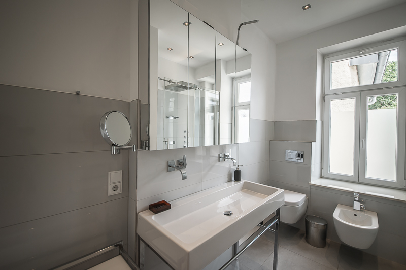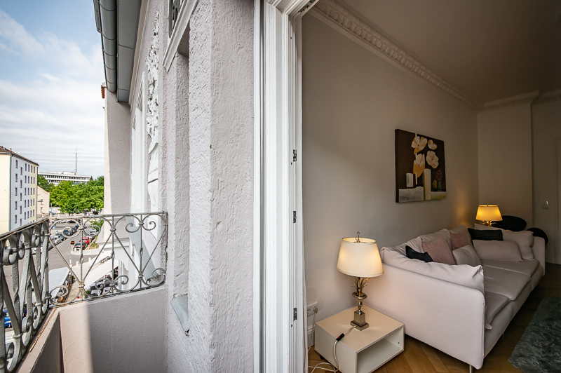 Hochwertige 4 Zimmer Altbauwohnung mit Balkon in Maxvorstadt. Die Wohnung ist im 3. Stock (mit Lift) eines gepflegten Altbaus gelegen. Ruhig und doch sehr zentral. Sie bietet zwei Schlafzimmer und zwei Badezimmer. Die Räume haben hohe Decken, verziert mit original Stuckarbeiten. Die Möblierung ist eine gelungene Mischung zwischen modernen Möbeln, Design-Klassikern und ausgewählten antiken Stücken. Der Wohnbereich ist durch eine Milchglas-Schiebetüre vom Esszimmer getrennt. Es ist mit hellem großem Sofa, Lounge-Chairs und einem antiken Schreibtisch mit passendem Stuhl möbliert. Von hier aus hat man Zugang zum hübschen Balkon. Im Essbereich befindet sich ein großer Glastisch mit 6 Stühlen und eine stylische Liege. Zudem gibt es hier einen schönen alten Kaminofen. Die Wohnung bietet zwei separate Schlafzimmer: eines ausgestattet mit Doppelbett (180 x 200), großem Kleiderschrank und Flatscreen TV. Von hier Zugang zum En-suite-Bad mit Badewanne, Doppel Waschtisch, Handtuchwärmer und WC. Das zweite Schlafzimmer ist mit einem Doppelbett in der Größe 160 x 200, Sessel, Arbeitsplatz, Kleiderschrank und Flatscreen TV möbliert. Ein zweites Badezimmer mit Fenster ist mit Spiegelschrank, großer Glasdusche mit Regenschauer-Duschkopf, Doppel Waschtisch, Handtuchwärmer, Flatscreen TV in der Dusche, Bidet und WC. Die separate moderne weiße Wohnküche mit Fenster ist perfekt ausgestattet und hat einen zusätzlichen Essplatz für 4 Personen. Die Küchentüre aus Glas lässt auch Tageslicht in den schönen Eingangsbereich. Dieser ist mit einem Sofa aus der Bidermeierzeit, Sideboards von USM Haller und Konsolentisch mit Spiegel eingerichtet. Waschmaschine und Trockner befinden sich in einer kleinen Wirtschaftskammer. Alle Fenster der Wohnung sind mit Rollläden versehen. Boden: gepflegter Parkettboden, Holzdielen, Fliesenboden, Marmorfliesen Miete zuzüglich Strom + Gas english High-quality 4 room old building apartment with balcony in Maxvorstadt. The apartment is located on the 3rd floor (with elevator) of a well-kept old building. Quiet and yet very central. It offers two bedrooms and two bathrooms. The rooms have high ceilings, decorated with original stucco work. The furnishing is a successful mix between modern furniture, design classics and selected antique pieces. The living area is separated from the dining room by a sliding frosted glass door. It is furnished with bright large sofa, lounge chairs and an antique desk with matching chair. From here you have access to the pretty balcony. In the dining area there is a large glass table with 6 chairs and a stylish chaise longue. In addition, there is a beautiful old fireplace here. The apartment offers two separate bedrooms: one equipped with double bed (180 x 200), large closet and flat screen TV. From here access to the en-suite bathroom with bath, double vanity, towel warmer and toilet. The second bedroom is furnished with a double bed in size 160 x 200, armchair, workstation, closet and flat screen TV. A second bathroom with window is furnished with mirrored cabinet, large glass shower with rain shower head, double washbasin, towel warmer, flat screen TV in the shower, bidet and toilet. The separate modern white eat-in kitchen with window is perfectly equipped and has an additional dining area for 4 people. The glass kitchen door also allows daylight into the beautiful entrance area. This is furnished with a Bidermeier era sofa, sideboards from USM Haller and console table with mirror. Washing machine and dryer are located in a small utility closet. All windows of the apartment are equipped with shutters. Floors: well-kept parquet floor, wooden floorboards, tiled floor, marble tiles. Rent plus electricity and gas