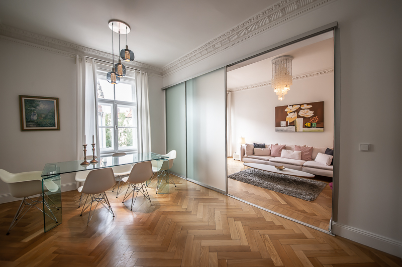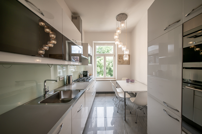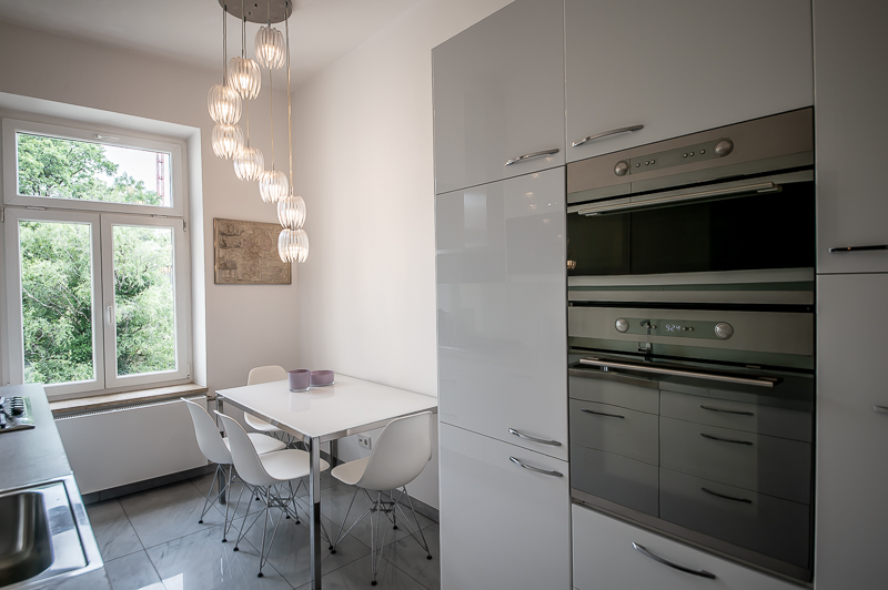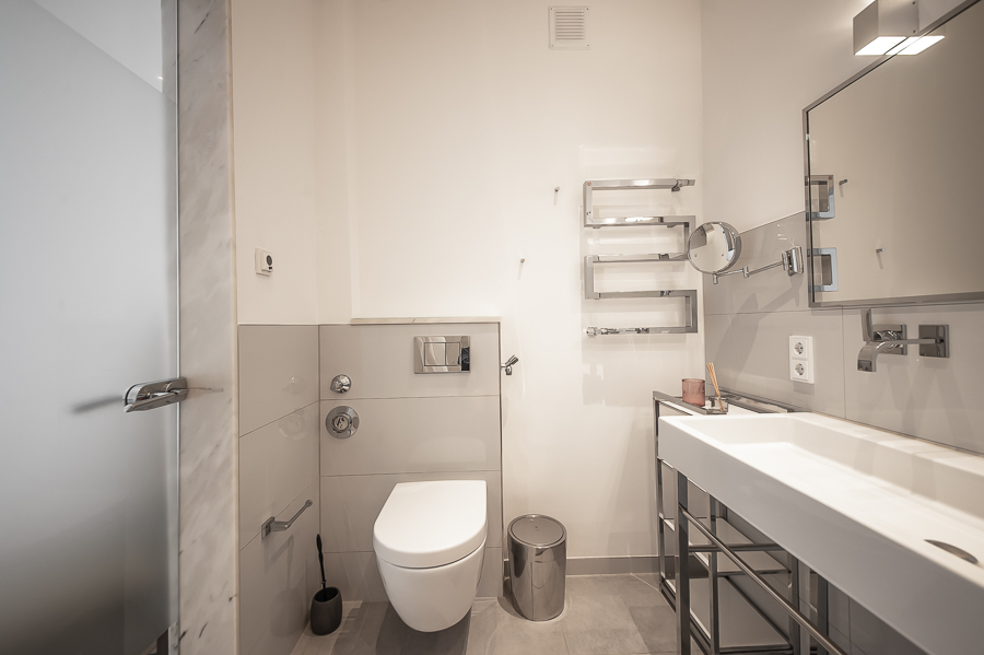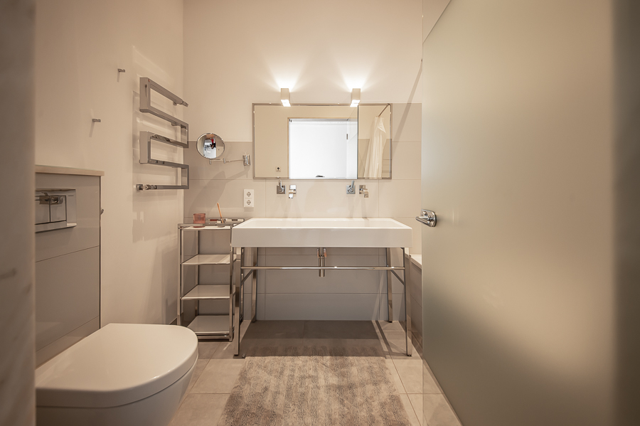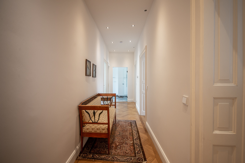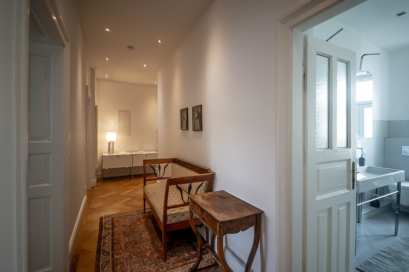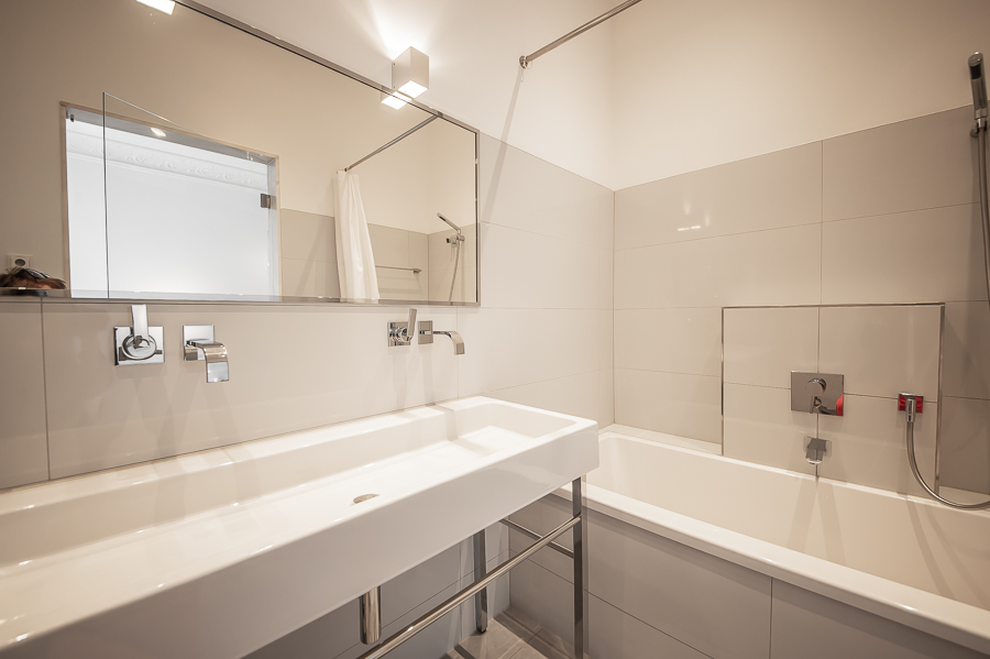 Hochwertige 4 Zimmer Altbauwohnung mit Balkon in Maxvorstadt. Die Wohnung ist im 3. Stock (mit Lift) eines gepflegten Altbaus gelegen. Ruhig und doch sehr zentral. Sie bietet zwei Schlafzimmer und zwei Badezimmer. Die Räume haben hohe Decken, verziert mit original Stuckarbeiten. Die Möblierung ist eine gelungene Mischung zwischen modernen Möbeln, Design-Klassikern und ausgewählten antiken Stücken. Der Wohnbereich ist durch eine Milchglas-Schiebetüre vom Esszimmer getrennt. Es ist mit hellem großem Sofa, Lounge-Chairs und einem antiken Schreibtisch mit passendem Stuhl möbliert. Von hier aus hat man Zugang zum hübschen Balkon. Im Essbereich befindet sich ein großer Glastisch mit 6 Stühlen und eine stylische Liege. Zudem gibt es hier einen schönen alten Kaminofen. Die Wohnung bietet zwei separate Schlafzimmer: eines ausgestattet mit Doppelbett (180 x 200), großem Kleiderschrank und Flatscreen TV. Von hier Zugang zum En-suite-Bad mit Badewanne, Doppel Waschtisch, Handtuchwärmer und WC. Das zweite Schlafzimmer ist mit einem Doppelbett in der Größe 160 x 200, Sessel, Arbeitsplatz, Kleiderschrank und Flatscreen TV möbliert. Ein zweites Badezimmer mit Fenster ist mit Spiegelschrank, großer Glasdusche mit Regenschauer-Duschkopf, Doppel Waschtisch, Handtuchwärmer, Flatscreen TV in der Dusche, Bidet und WC. Die separate moderne weiße Wohnküche mit Fenster ist perfekt ausgestattet und hat einen zusätzlichen Essplatz für 4 Personen. Die Küchentüre aus Glas lässt auch Tageslicht in den schönen Eingangsbereich. Dieser ist mit einem Sofa aus der Bidermeierzeit, Sideboards von USM Haller und Konsolentisch mit Spiegel eingerichtet. Waschmaschine und Trockner befinden sich in einer kleinen Wirtschaftskammer. Alle Fenster der Wohnung sind mit Rollläden versehen. Boden: gepflegter Parkettboden, Holzdielen, Fliesenboden, Marmorfliesen Miete zuzüglich Strom + Gas english High-quality 4 room old building apartment with balcony in Maxvorstadt. The apartment is located on the 3rd floor (with elevator) of a well-kept old building. Quiet and yet very central. It offers two bedrooms and two bathrooms. The rooms have high ceilings, decorated with original stucco work. The furnishing is a successful mix between modern furniture, design classics and selected antique pieces. The living area is separated from the dining room by a sliding frosted glass door. It is furnished with bright large sofa, lounge chairs and an antique desk with matching chair. From here you have access to the pretty balcony. In the dining area there is a large glass table with 6 chairs and a stylish chaise longue. In addition, there is a beautiful old fireplace here. The apartment offers two separate bedrooms: one equipped with double bed (180 x 200), large closet and flat screen TV. From here access to the en-suite bathroom with bath, double vanity, towel warmer and toilet. The second bedroom is furnished with a double bed in size 160 x 200, armchair, workstation, closet and flat screen TV. A second bathroom with window is furnished with mirrored cabinet, large glass shower with rain shower head, double washbasin, towel warmer, flat screen TV in the shower, bidet and toilet. The separate modern white eat-in kitchen with window is perfectly equipped and has an additional dining area for 4 people. The glass kitchen door also allows daylight into the beautiful entrance area. This is furnished with a Bidermeier era sofa, sideboards from USM Haller and console table with mirror. Washing machine and dryer are located in a small utility closet. All windows of the apartment are equipped with shutters. Floors: well-kept parquet floor, wooden floorboards, tiled floor, marble tiles. Rent plus electricity and gas