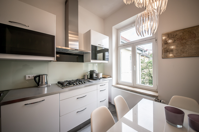 Kitchen with window, gas stove, extractor hood, dishwasher, microwave, electric oven, dining table for 4 persons