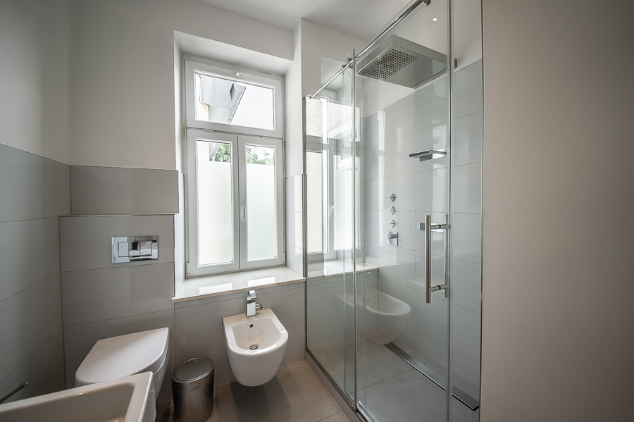 Bathroom 2 with window, glass shower, double washbasin, bidet, WC
