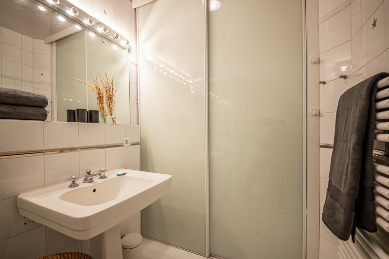 Bathroom 2 with glass shower, washbasin, WC, washing machine, dryer