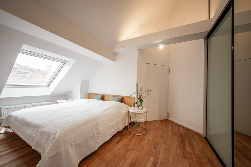 Großzügige 3 Zimmer Maisonette-Altbauwohnung mit Balkon in Neuhausen. Die Wohnung erstreckt sich über zwei Ebenen (4. und 5. Stock) und befindet sich in einem repräsentativen Altbau – mit Personenaufzug – in zentraler Lage fußläufig zum Rotkreuzplatz. Die Wohnung verfügt über zwei separate Schlafzimmer und zwei Bäder. Im 4. Stock gelangt man über einen Eingangsbereich mit großem Spiegeltüren-Einbauschrank in Wohnbereich, Essbereich sowie Küche und ein Bad (Dusche, WC, Waschbecken). In diesem Bad sind auch Waschmaschine und Trockner hinter Schiebetüren untergebracht. Der Wohnbereich ist modern möbliert mit edlen Sofas, Flat Screen TV und Bücherregal. Ein Esstisch vor dem Kamin bietet Platz für 6 Personen. Vom Wohn-/Essbereich hat man einen Zugang zum möblierten Balkon (mit Sonnenjalousie) mit Blick in den ruhigen Innenhof und über die Dächer Neuhausens. Auf dieser Etage ist im Anschluss an den Essbereich die Küche mit Fenster. Sie ist ausgestattet mit allem, was man benötigt (Spülmaschine, Kühl-Gefrierkombination, Ceranfeld, etc.). Über eine Treppe kommt man in die obere Etage. Auf der Galerie ist ein Arbeitsplatz mit Schreibtisch, Lesesessel, Regalen und Schrank eingerichtet. Ein Einbauschrank bietet zusätzlichen Stauraum. Im Haupt-Schlafzimmer findet sich ein großes Doppelbett (2 x 2 m) und ein Einbauschrank. Der zweite Raum kann als Gäste- oder Kinderzimmer genutzt werden. Dieser wurde mit Stapelbett, welches in ein Doppelbett verwandelt werden kann, Kommode und Einbauschrank möbliert. Das zweite Bad mit Fenster in der oberen Etage verfügt über eine Glasdusche, Handtuchtrockner, Waschtisch und WC. Bodenbelag ist schöner, neu aufbereiteter Kirschholzparkett in Wohn-, Ess- und Schlafräumen, Fliesenboden und Naturstein in den Bädern. english Spacious 3 room maisonette old building apartment with balcony in Neuhausen. The apartment extends over two levels (4th and 5th floor) and is located in a representative old building – with passenger elevator – in a central location within walking distance to Rotkreuzplatz. The apartment has two separate bedrooms and two bathrooms. On the 4th floor you enter via an entrance area with a large mirrored door built-in wardrobe in the living area, dining area as well as kitchen and a bathroom (shower, toilet, sink). This bathroom also houses a washing machine and dryer behind sliding doors. The living area is modernly furnished with fine sofas, flat screen TV and bookcase. A dining table in front of the fireplace seats 6 people. From the living/dining area there is access to the furnished balcony (with sun blinds) with views of the quiet courtyard and over the rooftops of Neuhausen. On this floor, adjacent to the dining area is the kitchen with window. It is equipped with everything you need (dishwasher, fridge-freezer, ceramic hob, etc.). A staircase leads to the upper floor. On the gallery there is a workstation with a desk, reading chair, shelves and wardrobe. A built-in wardrobe provides additional storage space. In the master bedroom you will find a large double bed (2 x 2 m) and a built-in wardrobe. The second room can be used as a guest room or children's room. This one was furnished with stacking bed which can be transformed into a double bed, dresser and built-in wardrobe. The second bathroom with window on the upper floor has a glass shower, towel dryer, vanity and toilet. Flooring is beautiful, newly refinished cherry wood parquet in living, dining and bedrooms, tile flooring and natural stone in the bathrooms.