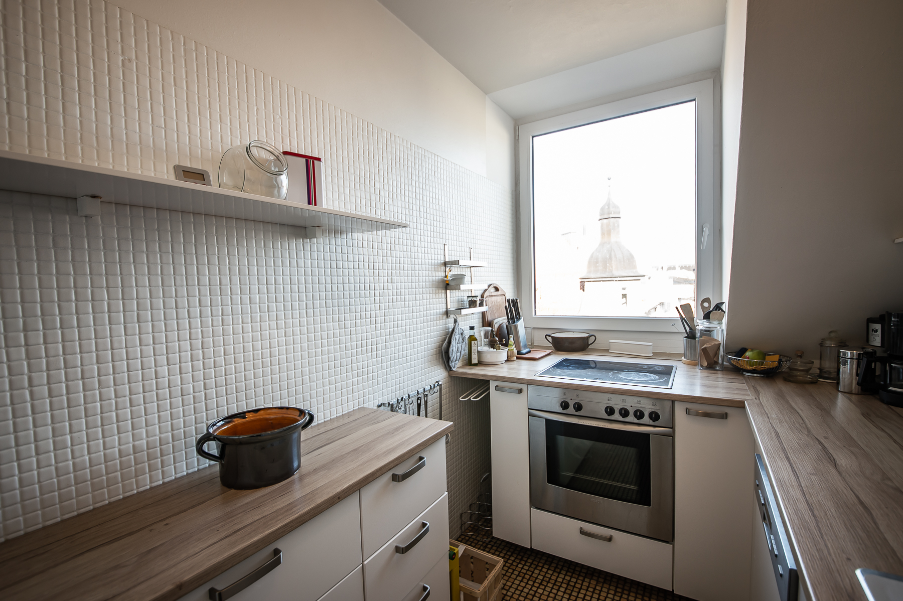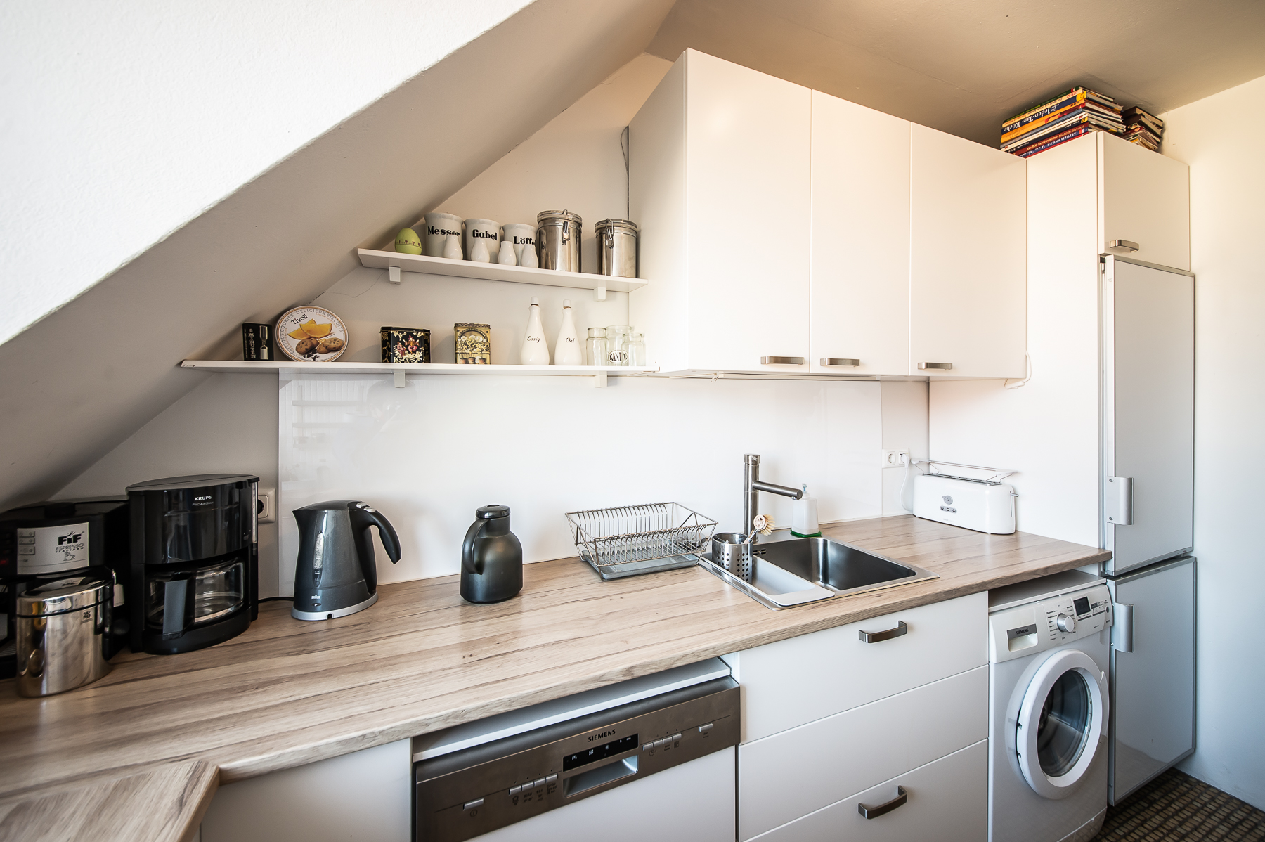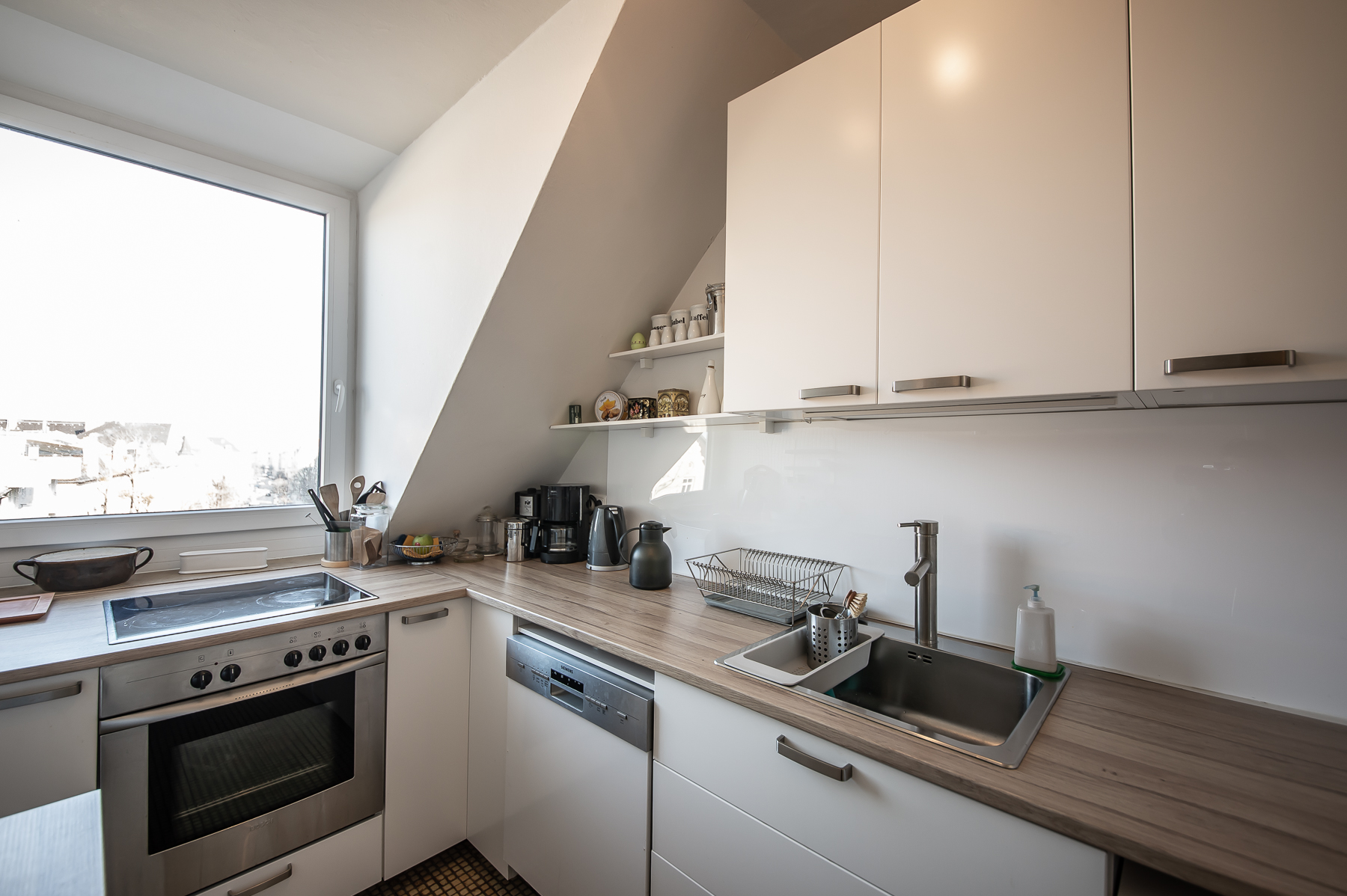 Küche mit Fenster, Cerankochfeld, Kühl-Gefrierkombination, Spülmaschine, Waschmaschine