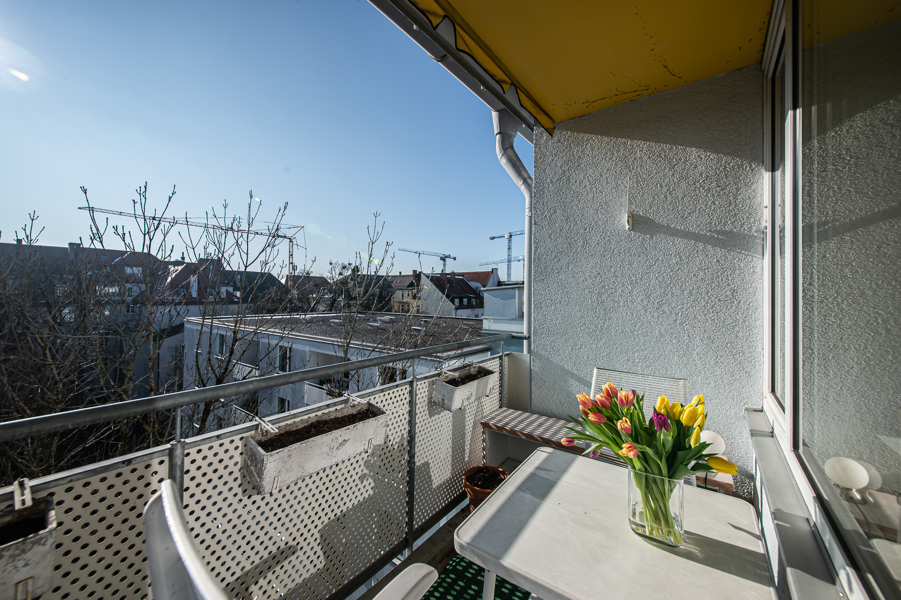 Balcony with table, 2 chairs, sunbed, sun umbrella