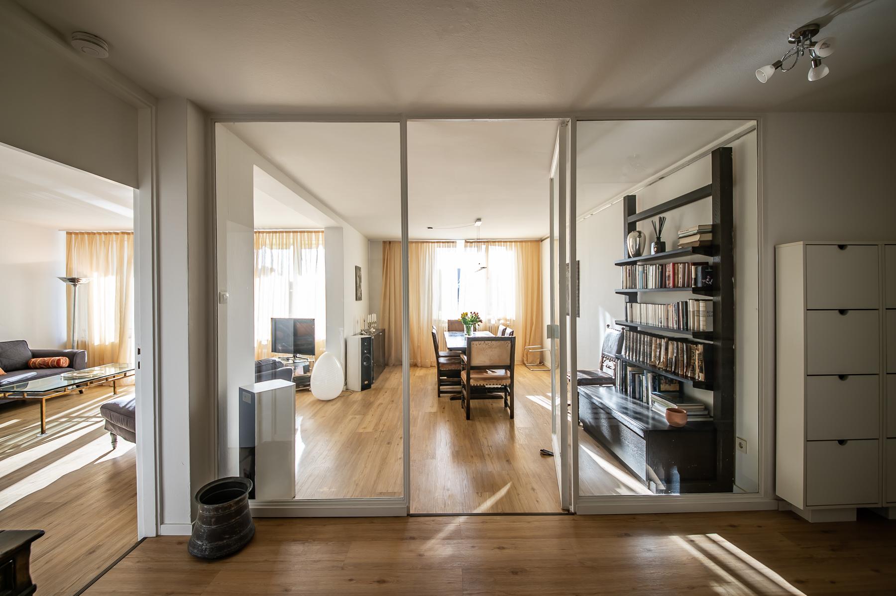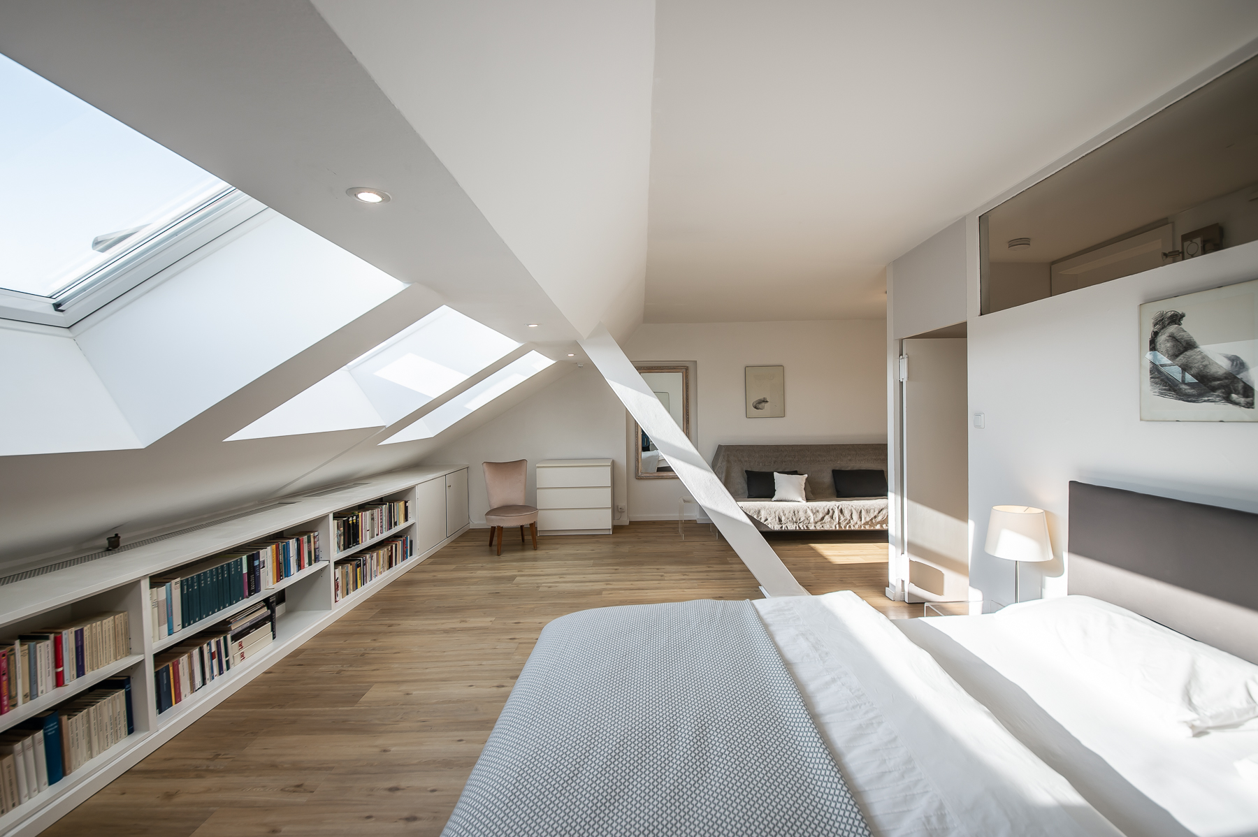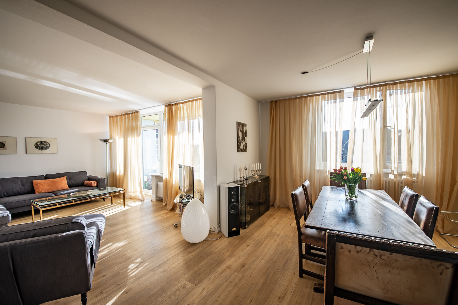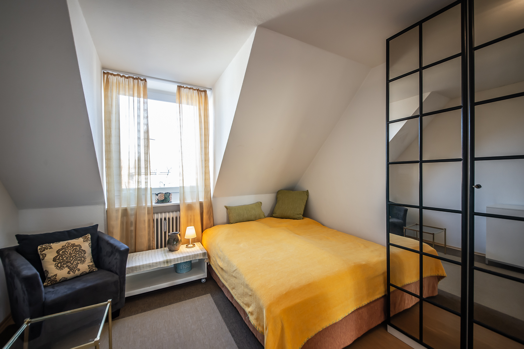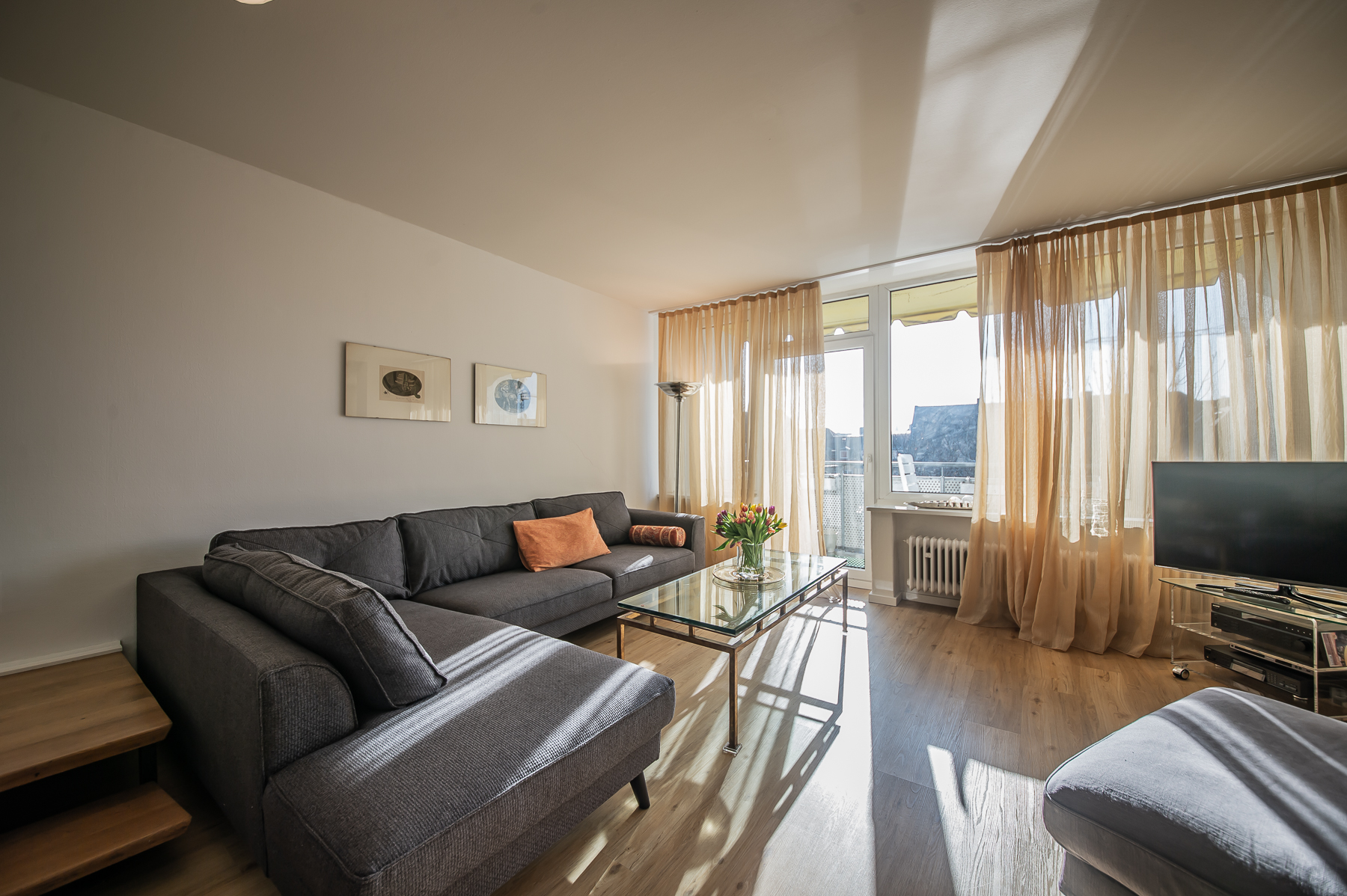 Großartige 4 Zimmer Maisonette Wohnung mit Schwabinger Flair mit Balkon. Über zwei Ebenen – 6. und 7. Stock in Bestlage Schwabings. Mit dem Personenaufzug gelangt man in den 6. Stock. Hier befinden sich der Wohnbereich, Essbereich, ein zweites Schlafzimmer, ein Gästezimmer sowie Küche und ein Bad. Über den Eingangsbereich mit großer Garderobe mit viel Stauraum, einem Einbauschrank und einem Schuhschrank betritt man den Wohn- und Essbereich, möbliert mit grauem Ecksofa, Ottomane, TV Board mit Flat Screen TV, Esstisch für 6 Personen und diversen Lowboards und Regalen. Vom Wohnbereich aus Zugang zum möblierten Balkon (mit Sonnenschirm) in den Innenhof mit großem altem Baumbestand. Auf dieser Etage ist auch die Küche mit Fenster, ausgestattet mit allem, was man benötigt (Spülmaschine, Waschmaschine etc.). Ein Schlafzimmer mit Französischem Bett, Sessel, Sideboard sowie einem Kleiderschrank und ein kleines Gästezimmer mit Einzelbett und Kommode bieten separate Schlafmöglichkeiten. Das Bad verfügt über eine Badewanne mit Glasduschabtrennung, Waschtisch und WC. Eine Holztreppe führt in das obere Geschoss. Hier ist das lichtdurchflutete Hauptschlafzimmer mit Doppelbett und Schlafsofa, welches an eine Ankleide angrenzt. Über diese Ankleide kommt man in das zweite Bad mit Fenster, Duschkabine, Waschtisch und WC. Bodenbelag ist schöner Parkettboden in Wohn-, Ess- und Schlafräumen, Fliesenboden in der Küche und den Bädern. english Great 4 room maisonette with Schwabing flair with balcony. Over two levels – 6th and 7th floor in best location Schwabing. With the passenger elevator you get to the 6th floor. Here are the living area, dining area, a second bedroom, a guest room as well as kitchen and a bathroom. Through the entrance area with a large wardrobe with plenty of storage space, a built-in wardrobe and a shoe cabinet, you enter the living and dining area, furnished with gray corner sofa, ottoman, TV board with flat screen TV, dining table for 6 people and various lowboards and shelves. From the living area access to the furnished balcony (with sun umbrella) into the courtyard with large old trees. On this floor is also the kitchen with window, equipped with everything you need (dishwasher, washing machine, etc.). A bedroom with French bed, armchair, sideboard as well as a closet and a small guest room with single bed and chest of drawers offer separate sleeping possibilities. The bathroom has a bathtub with glass shower partition, washbasin and toilet. A wooden staircase leads to the upper floor. Here is the light-filled master bedroom with double bed and sofa bed, which is adjacent to a dressing room. Through this dressing room you enter the second bathroom with window, shower cubicle, washbasin and toilet. Flooring is beautiful parquet flooring in living, dining and bedrooms, tile flooring in the kitchen and bathrooms.