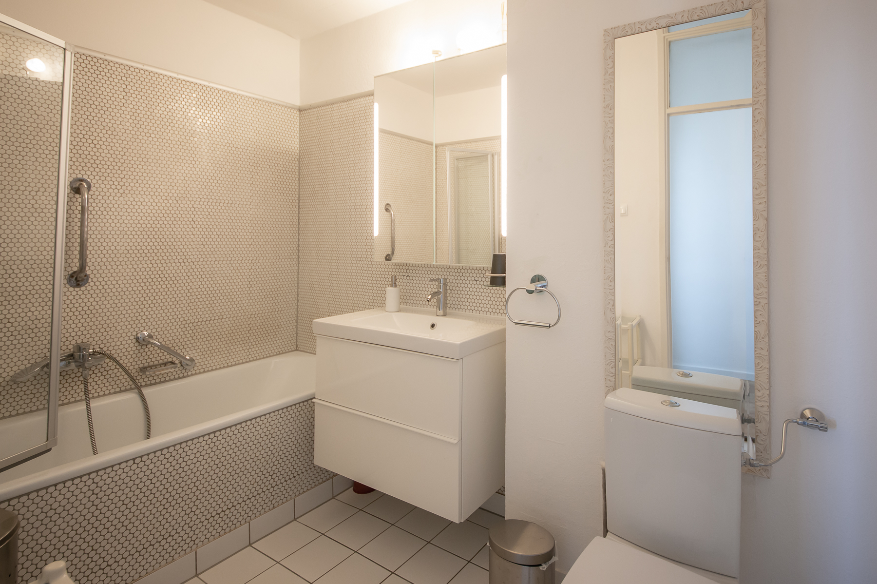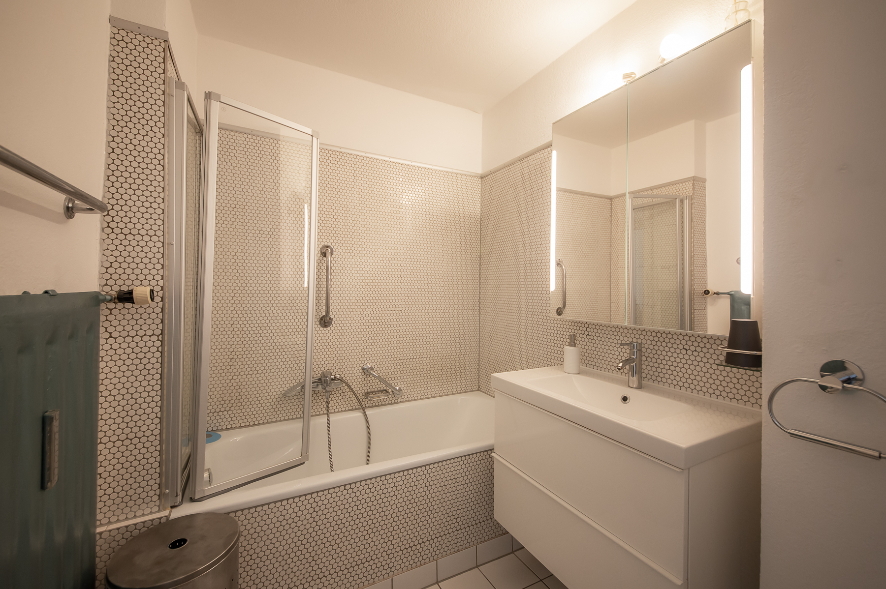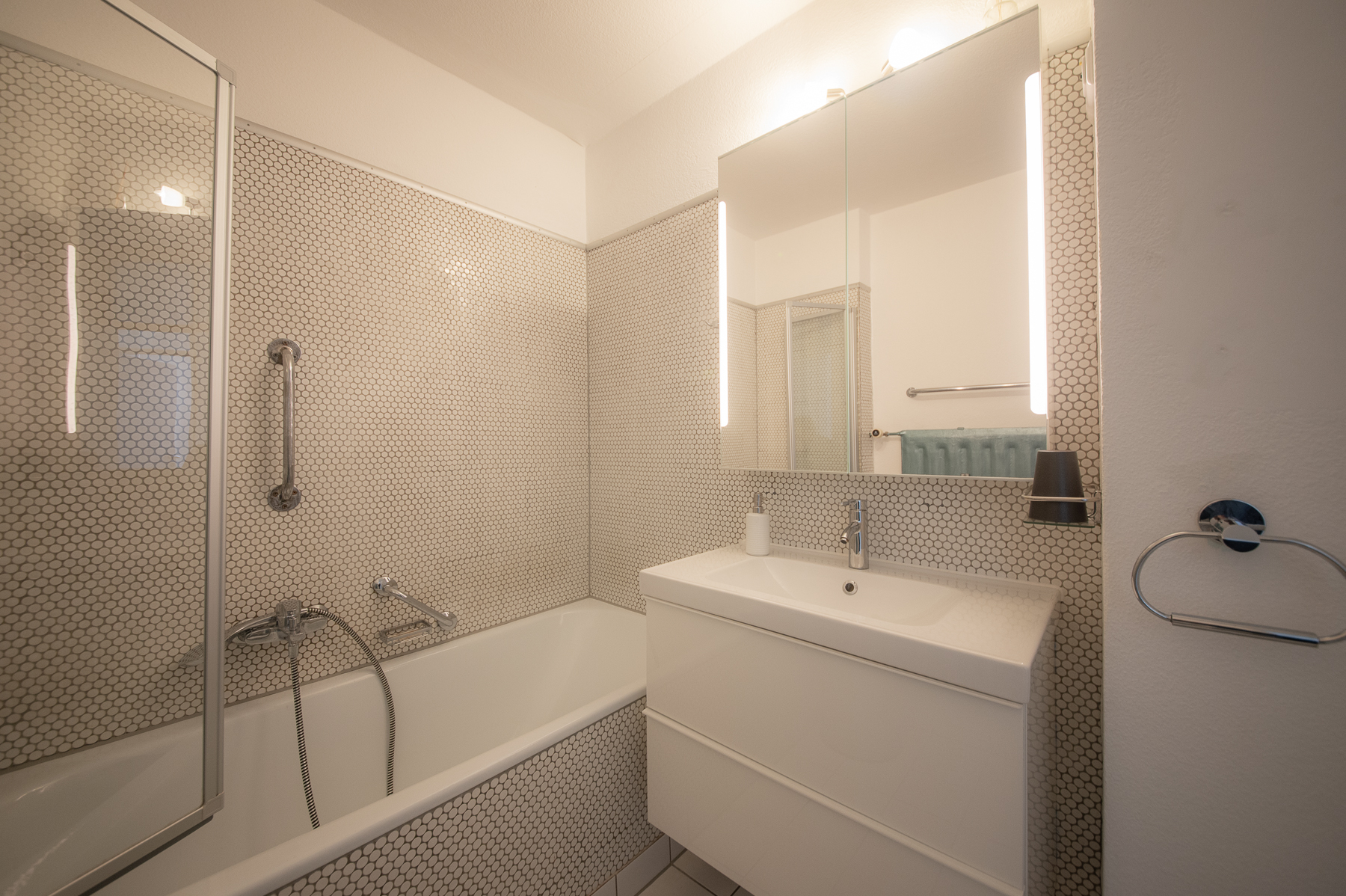 Bad 1 mit Badewanne mit Duschabtrennung, Waschtisch, WC