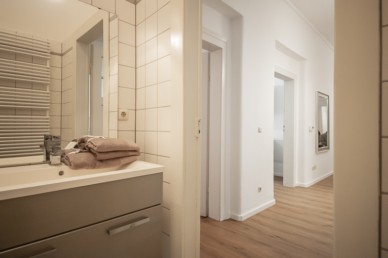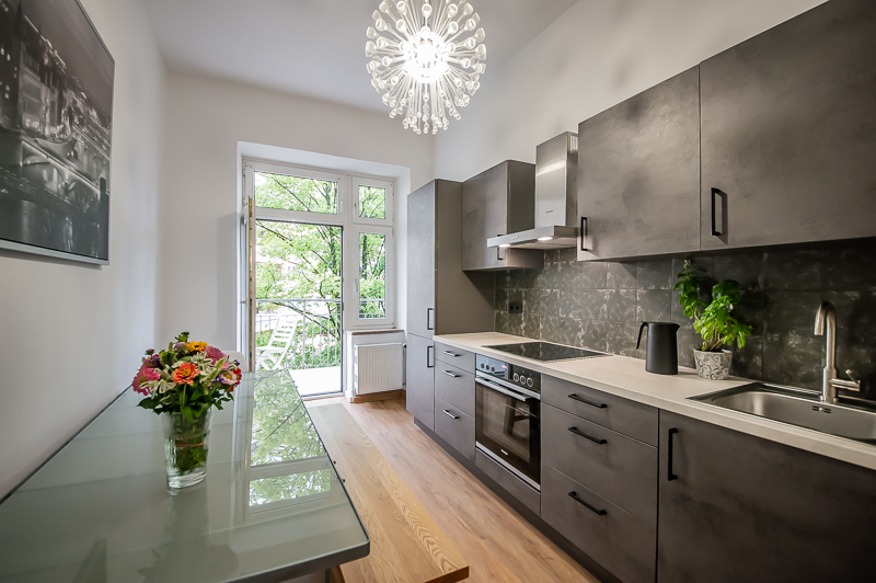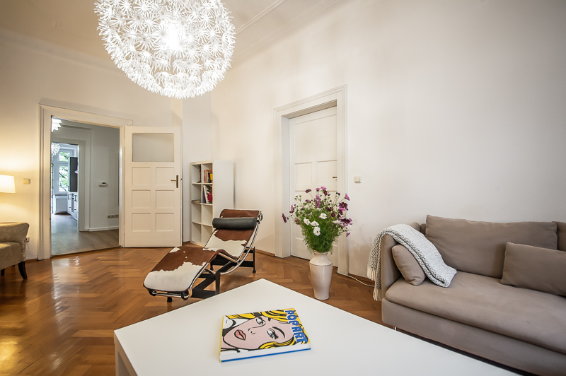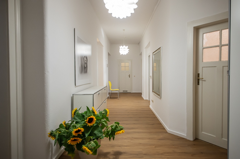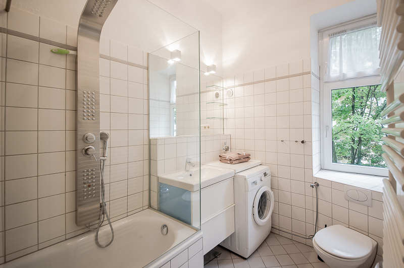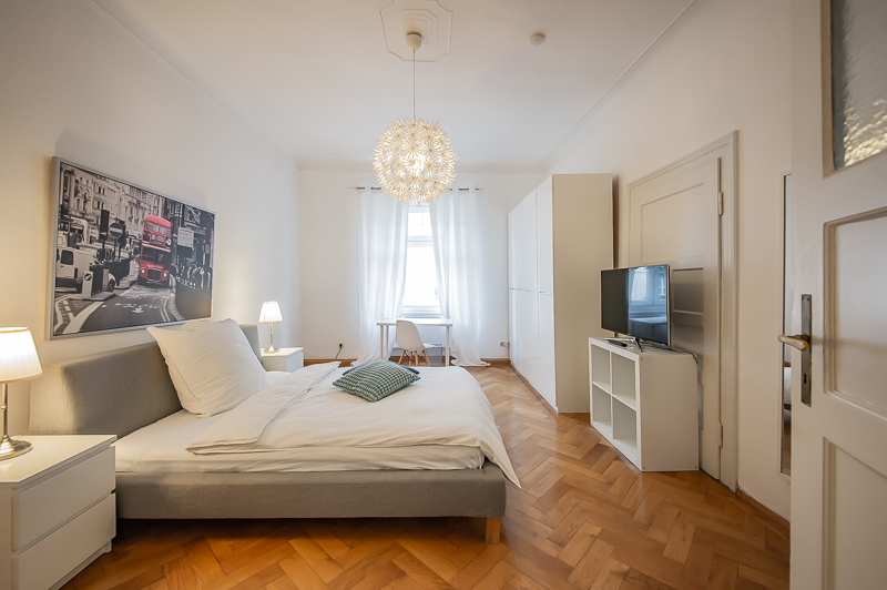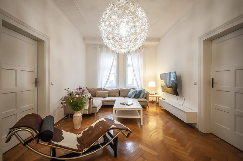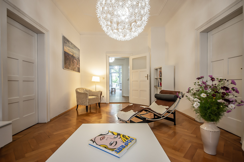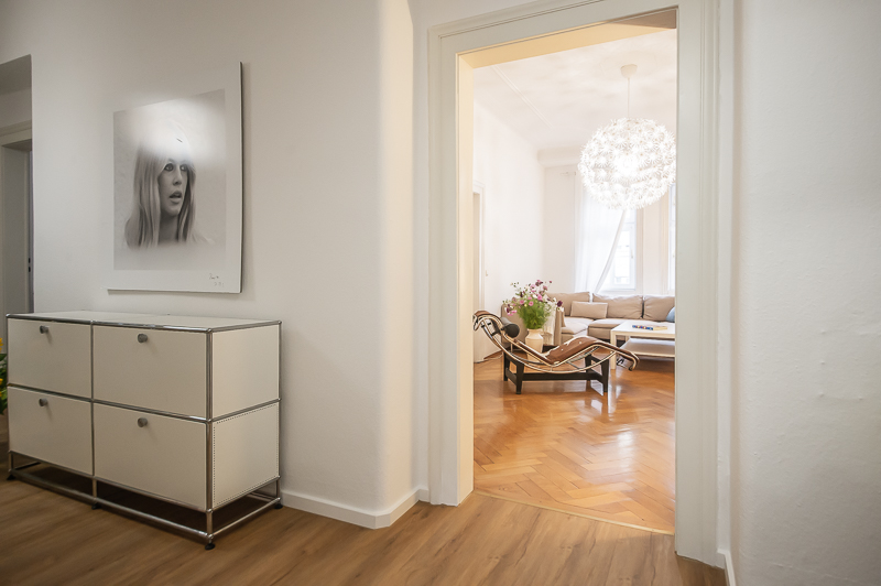 Die großzügige 4 Zimmer Wohnung mit Balkon und 3 Schlafzimmern befindet sich in einem schönen Gebäude in Neuhausen im 1. Obergeschoss. Der Altbau aus der Jahrhundertwende um 1908 besticht durch die Deckenhöhe und den großzügigen Grundriss. Im Eingangsbereich findet sich eine Garderobe, ein Sideboard und ein Spiegel. Der Grundriss ist typisch für Altbauwohnungen. Vom großzügigen Flur gehen links und rechts die Türen zu Wohnzimmer, Schlafzimmern, Wohnküche und Bädern ab. Ein geschmackvoll eingerichteter Wohnbereich ist mit beigem Ecksofa, TV Board mit Flatscreen TV, Liege (Le Corbusier), Regal, Sessel und antikem Tischchen möbliert. Der Einrichtungsstil ist modern mit klassischen Elementen. Lampen und Bilder machen die Räume trotz ihrer Größe angenehm und gemütlich. Die Wohnküche mit Zugang zum Balkon ist perfekt ausgestattet mit allem, was man täglich benötigt. Hier steht auch ein großer Esstisch mit Bank und Stühlen. Der Balkon mit Tisch und Stühlen ist zum ruhigen Innenhof mit altem Baumbestand ausgerichtet. Die Wohnung verfügt über drei separate, nahezu gleich große Schlafzimmer. Zwei der Schlafzimmer sind möbliert mit Doppelbett in der Größe (1,80 x 2 m und 1,60 x 2 m), das dritte mit zwei Einzelbetten in der Größe 1,0 x 2 m. Alle drei Schlafzimmer haben Flat Screen TV und große Kleiderschränke, welche ausreichend Stauraum bieten. In der Wohnung gibt es zwei Bäder – eines mit Fenster, Badewanne mit gläserner Duschabtrennung, Regenschauerdusche, Handtuchwärmer, Waschtisch und WC. Zudem steht ein weiteres Bad mit Wanne mit gläserner Duschabtrennung, Regenschauerdusche, Waschtisch und Handtuchwärmer zur Verfügung. Extra Gäste WC vorhanden. Eine Waschmaschine und ein Trockner befinden sich ebenfalls in der Wohnung. Eine praktische Abstellkammer bietet zusätzlichen Stauraum. Bodenbelag sind Fischgrät Parkettboden in Wohn- und Schlafräumen, Laminatboden im Flur und Fliesenboden in den Bädern. Miete zuzüglich Strom + Gas english The spacious 4 room apartment with balcony and 3 bedrooms is located in a beautiful building in Neuhausen on the 1st floor. The old building from the turn of the century around 1908 impresses with the ceiling height and the spacious floor plan. In the entrance area there is a wardrobe, a sideboard and a mirror. The floor plan is typical for apartments in old buildings. Doors to the living room, bedrooms, eat-in kitchen and bathrooms lead off from the spacious hallway on the left and right. A tastefully decorated living area is furnished with beige corner sofa, TV board with flat screen TV, couch (Le Corbusier), shelf, armchair and antique little table. The interior style is modern with classical elements. Lamps and pictures make the rooms pleasant and cozy despite their size. The kitchen-living room with access to the balcony is perfectly equipped with everything you need on a daily basis. There is also a large dining table with bench and chairs here. The balcony with table and chairs faces the quiet courtyard with old trees. The apartment has three separate bedrooms of almost the same size. Two of the bedrooms are furnished with double bed in size (1,80 x 2 m and 1,60 x 2 m), the third one with two single beds in size 1,0 x 2 m. All three bedrooms have flat screen TV and large closets, which provide ample storage space. In the apartment there are two bathrooms – one with window, bathtub with glass shower partition, rain shower, towel warmer, washbasin and toilet. In addition, there is another bathroom with bathtub with glass shower partition, rain shower, washbasin and towel warmer. Extra guest toilet available. A washing machine and dryer are also located in the apartment. A practical storage room offers additional storage space. Floors are herringbone parquet flooring in living rooms and bedrooms, laminate flooring in the hallway and tile flooring in the bathrooms. Rent plus electricity and gas
