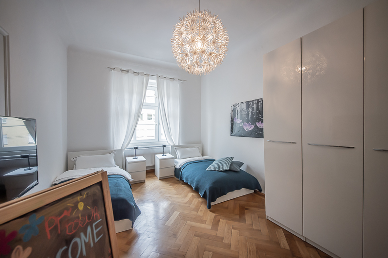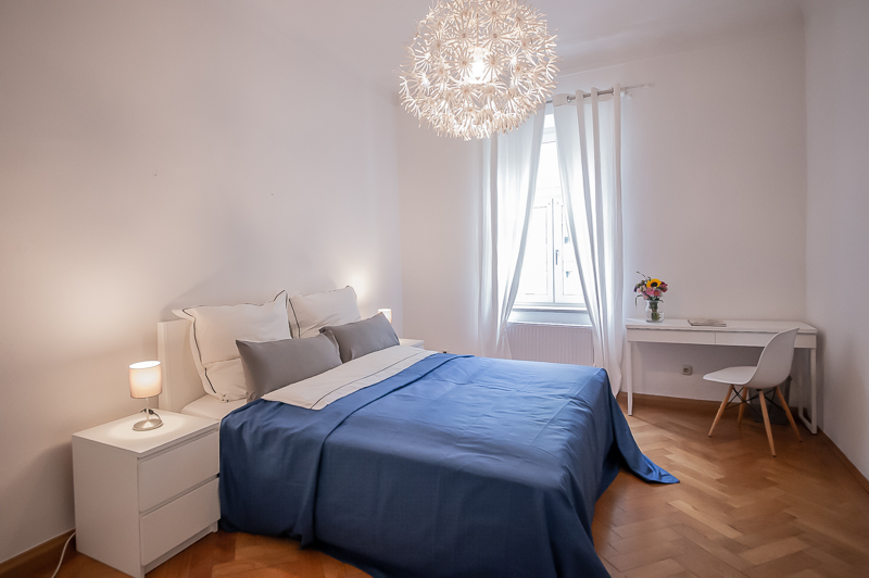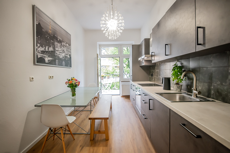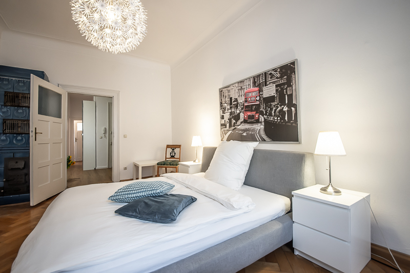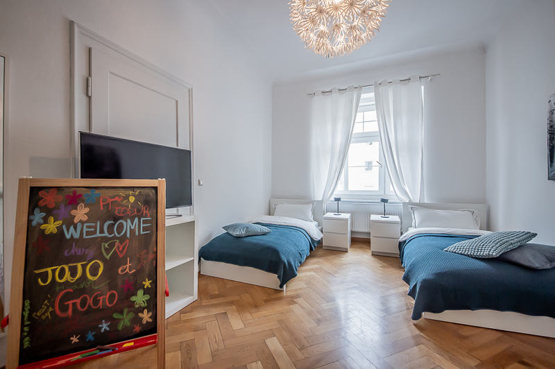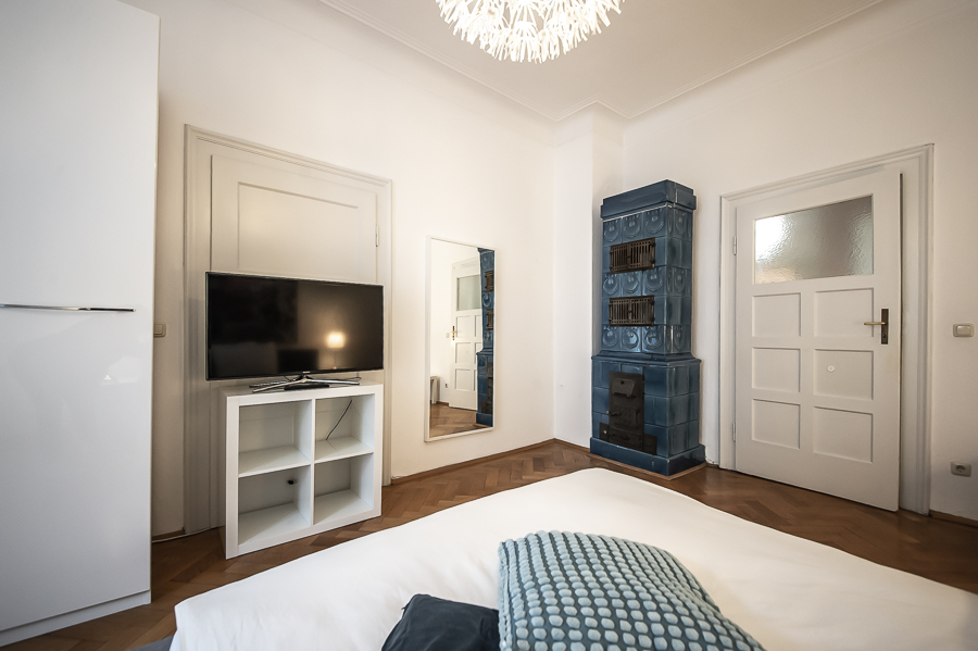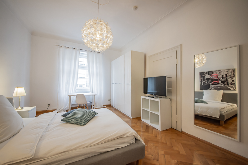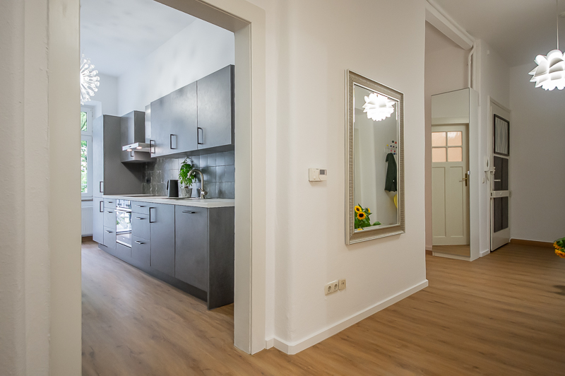 Die großzügige 4 Zimmer Wohnung mit Balkon und 3 Schlafzimmern befindet sich in einem schönen Gebäude in Neuhausen im 1. Obergeschoss. Der Altbau aus der Jahrhundertwende um 1908 besticht durch die Deckenhöhe und den großzügigen Grundriss. Im Eingangsbereich findet sich eine Garderobe, ein Sideboard und ein Spiegel. Der Grundriss ist typisch für Altbauwohnungen. Vom großzügigen Flur gehen links und rechts die Türen zu Wohnzimmer, Schlafzimmern, Wohnküche und Bädern ab. Ein geschmackvoll eingerichteter Wohnbereich ist mit beigem Ecksofa, TV Board mit Flatscreen TV, Liege (Le Corbusier), Regal, Sessel und antikem Tischchen möbliert. Der Einrichtungsstil ist modern mit klassischen Elementen. Lampen und Bilder machen die Räume trotz ihrer Größe angenehm und gemütlich. Die Wohnküche mit Zugang zum Balkon ist perfekt ausgestattet mit allem, was man täglich benötigt. Hier steht auch ein großer Esstisch mit Bank und Stühlen. Der Balkon mit Tisch und Stühlen ist zum ruhigen Innenhof mit altem Baumbestand ausgerichtet. Die Wohnung verfügt über drei separate, nahezu gleich große Schlafzimmer. Zwei der Schlafzimmer sind möbliert mit Doppelbett in der Größe (1,80 x 2 m und 1,60 x 2 m), das dritte mit zwei Einzelbetten in der Größe 1,0 x 2 m. Alle drei Schlafzimmer haben Flat Screen TV und große Kleiderschränke, welche ausreichend Stauraum bieten. In der Wohnung gibt es zwei Bäder – eines mit Fenster, Badewanne mit gläserner Duschabtrennung, Regenschauerdusche, Handtuchwärmer, Waschtisch und WC. Zudem steht ein weiteres Bad mit Wanne mit gläserner Duschabtrennung, Regenschauerdusche, Waschtisch und Handtuchwärmer zur Verfügung. Extra Gäste WC vorhanden. Eine Waschmaschine und ein Trockner befinden sich ebenfalls in der Wohnung. Eine praktische Abstellkammer bietet zusätzlichen Stauraum. Bodenbelag sind Fischgrät Parkettboden in Wohn- und Schlafräumen, Laminatboden im Flur und Fliesenboden in den Bädern. Miete zuzüglich Strom + Gas english The spacious 4 room apartment with balcony and 3 bedrooms is located in a beautiful building in Neuhausen on the 1st floor. The old building from the turn of the century around 1908 impresses with the ceiling height and the spacious floor plan. In the entrance area there is a wardrobe, a sideboard and a mirror. The floor plan is typical for apartments in old buildings. Doors to the living room, bedrooms, eat-in kitchen and bathrooms lead off from the spacious hallway on the left and right. A tastefully decorated living area is furnished with beige corner sofa, TV board with flat screen TV, couch (Le Corbusier), shelf, armchair and antique little table. The interior style is modern with classical elements. Lamps and pictures make the rooms pleasant and cozy despite their size. The kitchen-living room with access to the balcony is perfectly equipped with everything you need on a daily basis. There is also a large dining table with bench and chairs here. The balcony with table and chairs faces the quiet courtyard with old trees. The apartment has three separate bedrooms of almost the same size. Two of the bedrooms are furnished with double bed in size (1,80 x 2 m and 1,60 x 2 m), the third one with two single beds in size 1,0 x 2 m. All three bedrooms have flat screen TV and large closets, which provide ample storage space. In the apartment there are two bathrooms – one with window, bathtub with glass shower partition, rain shower, towel warmer, washbasin and toilet. In addition, there is another bathroom with bathtub with glass shower partition, rain shower, washbasin and towel warmer. Extra guest toilet available. A washing machine and dryer are also located in the apartment. A practical storage room offers additional storage space. Floors are herringbone parquet flooring in living rooms and bedrooms, laminate flooring in the hallway and tile flooring in the bathrooms. Rent plus electricity and gas