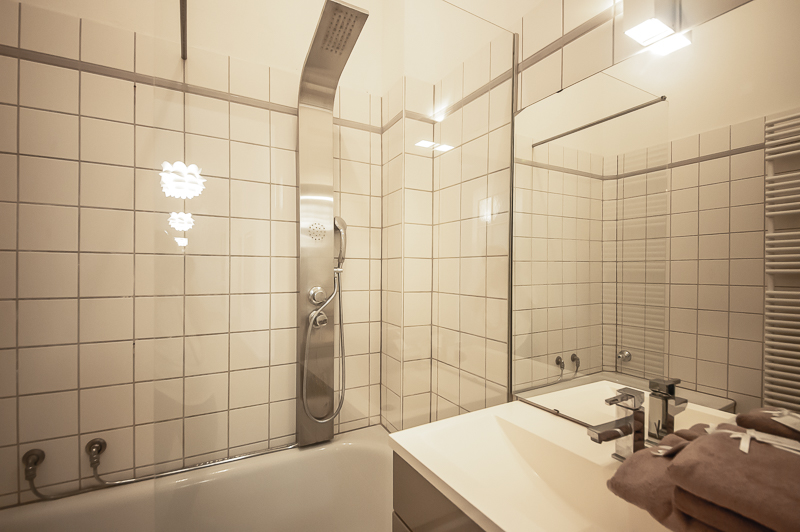 Bad 1 mit Fenster, Badewanne mit gläserner Duschabtrennung und Regenschauerdusche, Waschtisch mit Unterbau, Handtuchwärmer, WC, Waschmaschine