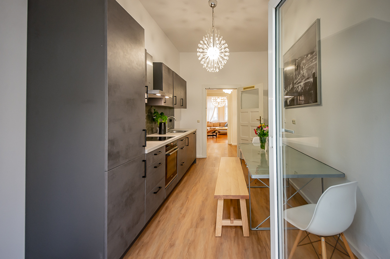 Kitchen with balcony, dining table with bench and chairs, ceramic hob, extractor fan, electric oven, fridge-freezer, dishwasher