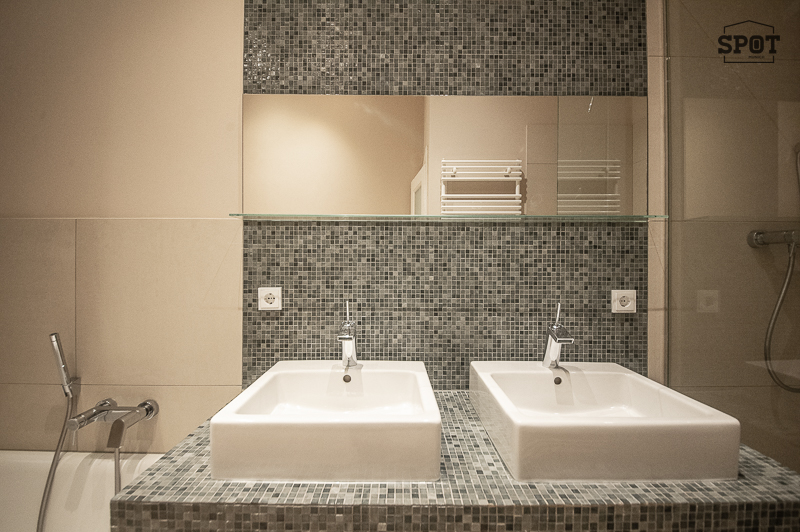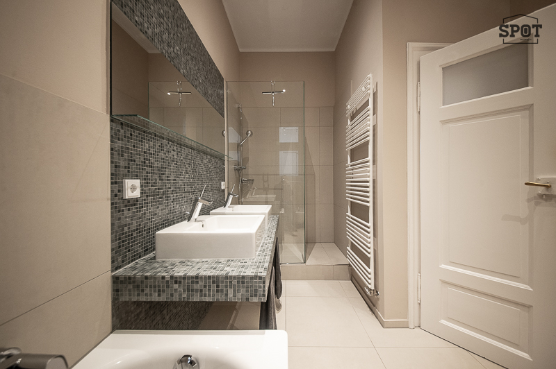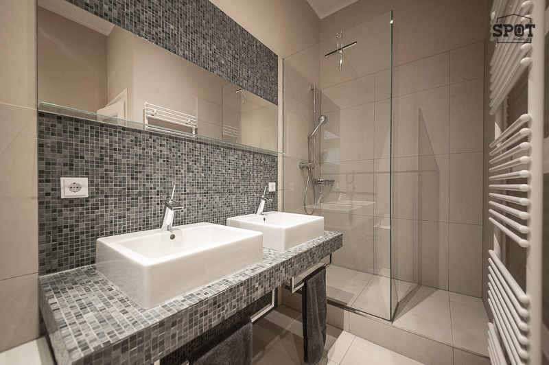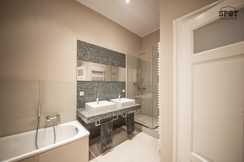 Bad mit Fenster, Badewanne, Glas Duschkabine, 2 Waschtischen, Handtuchwärmer, WC, Bidet