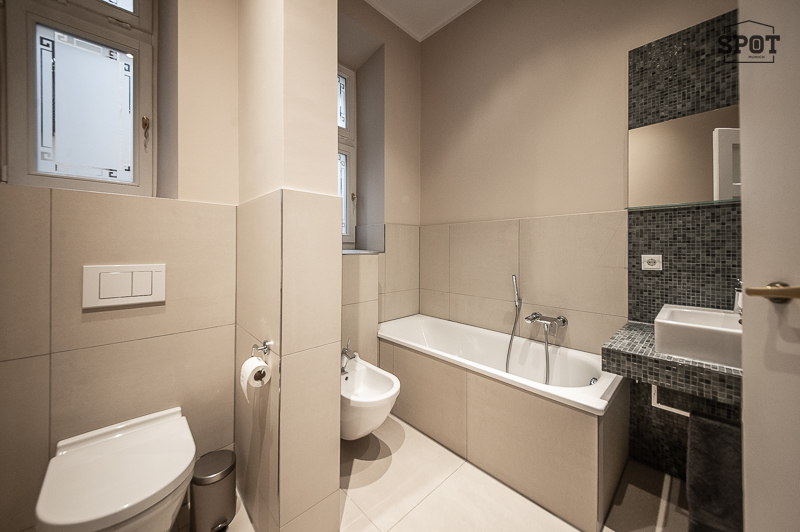 Bathroom with window, bathtub, glass shower cubicle, 2 washbasins, towel warmer, WC, bidet