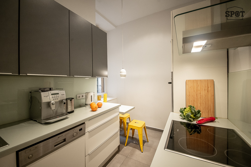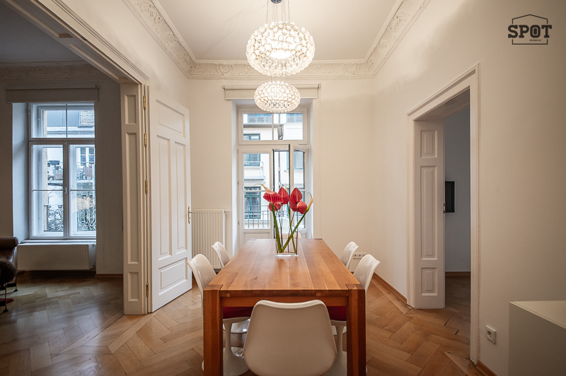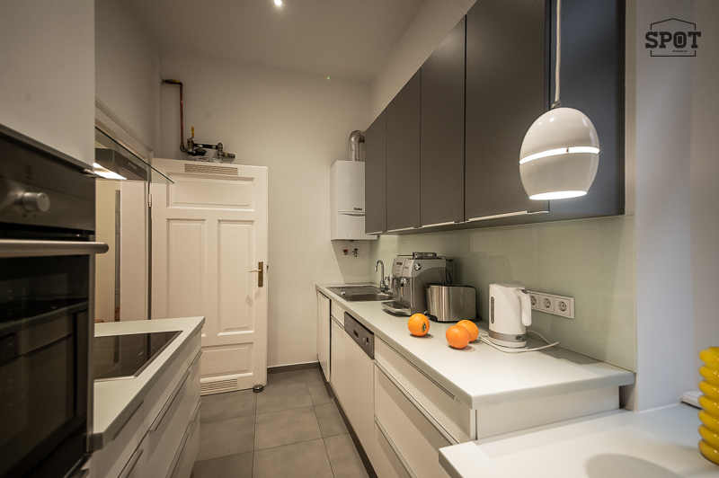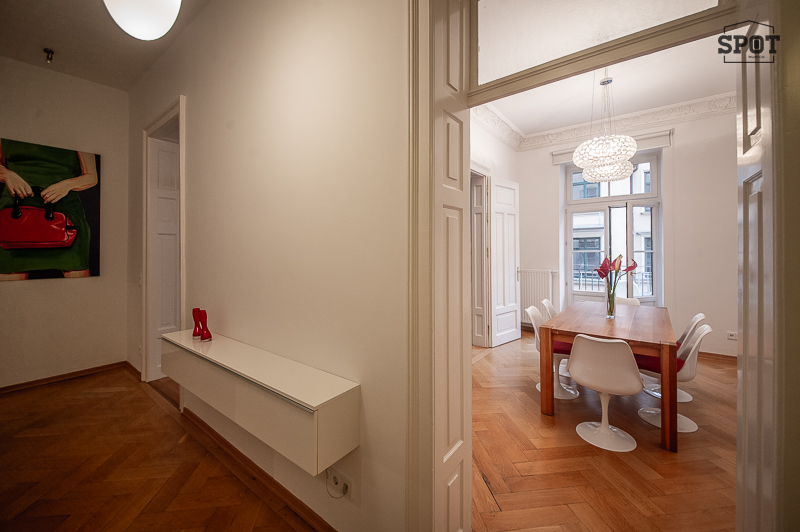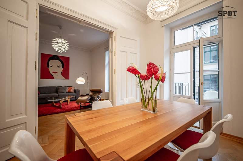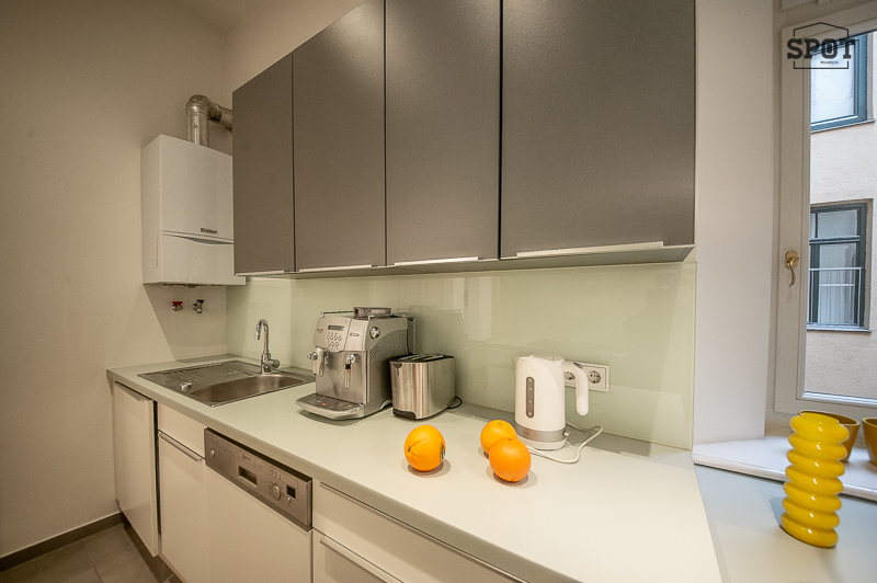 Die schöne 3 Zimmer Stadtwohnung mit Balkon befindet sich in einem gepflegten Gebäude in der lebendigen Ludwigsvorstadt/Isarvorstadt. 1. Obergeschoss mit Lift. Der renovierte Altbau aus der Jahrhundertwende um 1908 besticht durch eine Deckenhöhe von 3,30 m mit Stuck, gutem Grundriss und schöner Wohnatmosphäre. Das Wohnzimmer wurde mit einem grauen Schlafsofa, edler Liege, Couchtisch, Sideboard und Flat Screen TV geschmackvoll möbliert. Hier findet sich auch ein schöner restaurierter Kaminofen. Angrenzend, getrennt durch eine Flügeltüre, befindet sich das Esszimmer mit großem Tisch und 6 Stühlen. Die ausgewählten Lampen, Sitzmöbel und ansprechende Bilder machen die Räume angenehm und gemütlich. Die moderne Einbauküche mit Fenster und Frühstücksplatz ist perfekt ausgestattet mit allem, was man täglich benötigt, u.a. Spülmaschine und Waschtrockner. Der Balkon mit Tisch und Stühlen ist zum ruhigen Innenhof ausgerichtet. Das Schlafzimmer ist mit einem Doppelbett in der Größe 180 x 200 cm, zwei modernen Nachttischen und einem großzügigen Kleiderschrank möbliert. Das hochwertige moderne Bad mit Fenster ist mit Badewanne, Glas Duschkabine, zwei Waschtischen, Bidet und WC ausgestattet. Im großzügigen Eingangsbereich wurde eine Garderobe, ein Sideboard und eine Schuhablage als Ausstattung ausgewählt. Bodenbelag sind schöner aufbereiteter Fischgrät-Parkettboden und Feinsteinzeug. english The beautiful 3-room city apartment with balcony is located in a well-kept building in the lively Ludwigsvorstadt/Isarvorstadt. 1st floor with elevator. The renovated old building from the turn of the century around 1908 impresses with a ceiling height of 3.30 m with stucco, a good floor plan and a nice living atmosphere. The living room has been tastefully furnished with a gray sofa bed, elegant couch, coffee table, sideboard and flat screen TV. There is also a beautifully restored wood-burning stove. Adjacent, separated by a double door, is the dining room with a large table and 6 chairs. The selected lamps, seating and attractive pictures make the rooms pleasant and cozy. The modern fitted kitchen with window and breakfast area is perfectly equipped with everything you need on a daily basis, including a dishwasher and washer-dryer. The balcony with table and chairs faces the quiet inner courtyard. The bedroom is furnished with a double bed measuring 180 x 200 cm, two modern bedside tables and a spacious closet. The high-quality modern bathroom with window is equipped with a bathtub, glass shower cubicle, two washbasins, bidet and WC. In the spacious entrance area, a wardrobe, a sideboard and a shoe rack have been chosen as furnishings. The floors are beautifully finished herringbone parquet and porcelain stoneware.