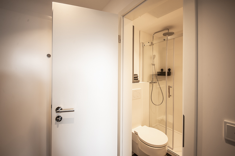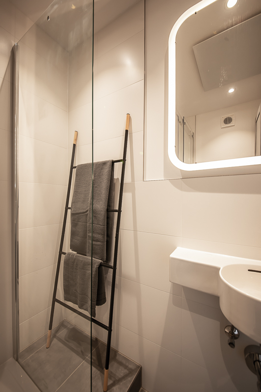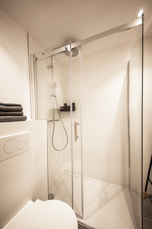 Bad mit großer Glasdusche, Waschbecken, WC, Badschrank