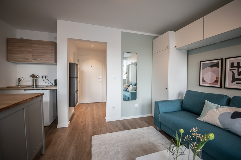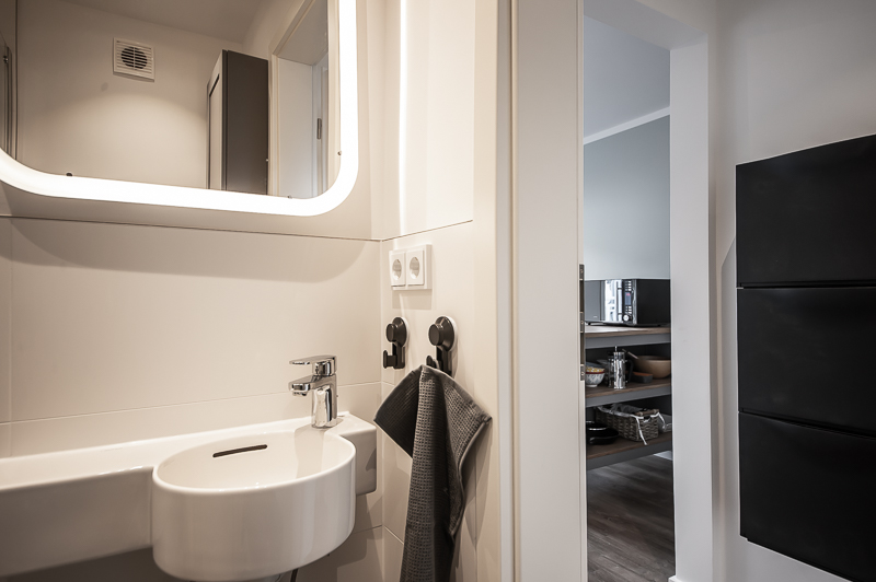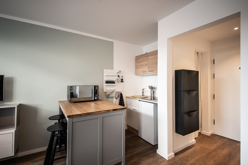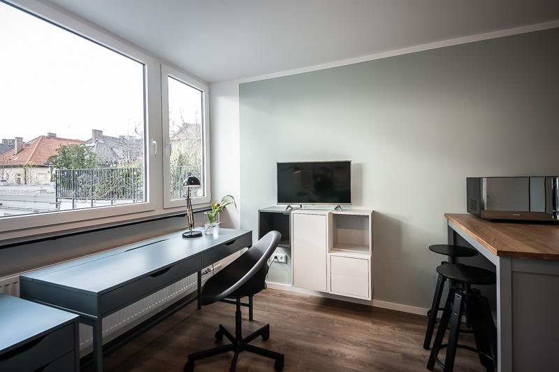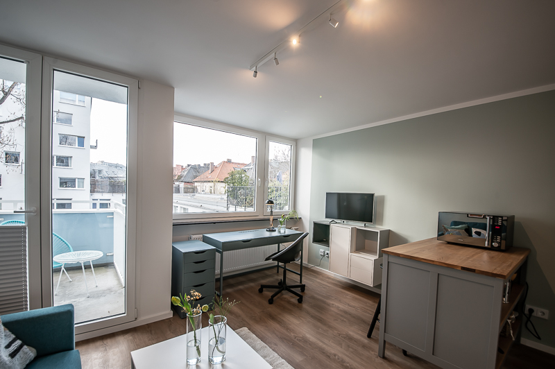 Das hübsche möblierte Apartment mit Balkon liegt in einem der beliebtesten Stadtteile Münchens, Schwabing. Wenige Gehminuten vom Kurfürstenplatz entfernt. Das Apartment befindet sich im 4. Stock eines gepflegten Gebäudes und hat einen hübschen Balkon, möbliert mit Sessel und Beistelltisch. Die Ausstattung ist modern, frisch und mit dem Farbkonzept sowie der großen Fensterfront ergibt sich eine freundliche und angenehme Atmosphäre. Im kombinierten Wohn-Schlafraum mit Vinylboden in Holzoptik steht ein sehr komfortables Schlafsofa, welches für Dauerschläfer geeignet ist, ein Sideboard, ein Flatscreen TV und ein Arbeitsplatz zur Verfügung. Die offene Küche ist mit einem Küchenblock/Esstheke mit Barhockern ausgestattet. Sie bietet alles, was man täglich benötigt, z.B. auch ein Mikrowelle/Backofen/Grill-Kombigerät. Das hübsche, weiß geflieste Bad hat eine Glasdusche (Regenschauer Duschkopf), Waschbecken, WC und Badschrank. In der praktischen Abstellkammer im Eingangsbereich ist die Waschmaschine-Trockner-Kombination untergebracht. Hier finden auch Putz-Utensilien und Garderobe Platz. Zum Apartment gehört ein Kellerabteil. Das Apartment ist neu renoviert und möbliert. english This pretty furnished flat with balcony is located in one of Munich's most popular districts, Schwabing. A few minutes' walk from Kurfürstenplatz. The flat is on the 4th floor of a well-kept building and has a nice balcony, furnished with armchair and side table. The furnishing is modern, fresh and the colour concept and the large window front create a friendly and pleasant atmosphere. In the combined living room and bedroom with vinyl flooring in a wooden look, there is a very comfortable sofa bed suitable for permanent sleepers, a sideboard, a flatscreen TV and a workstation. The open kitchen is equipped with a kitchen block/dining counter with bar stools. It offers everything you need on a daily basis, e.g. also a microwave/oven/grill combination appliance. The pretty white tiled bathroom has a glass shower (rain shower head), washbasin, WC and bathroom cabinet. The practical utility room in the entrance area houses the washing machine/dryer combination. There is also room for cleaning utensils and a wardrobe. A cellar compartment belongs to the flat. The flat is newly renovated and furnished.