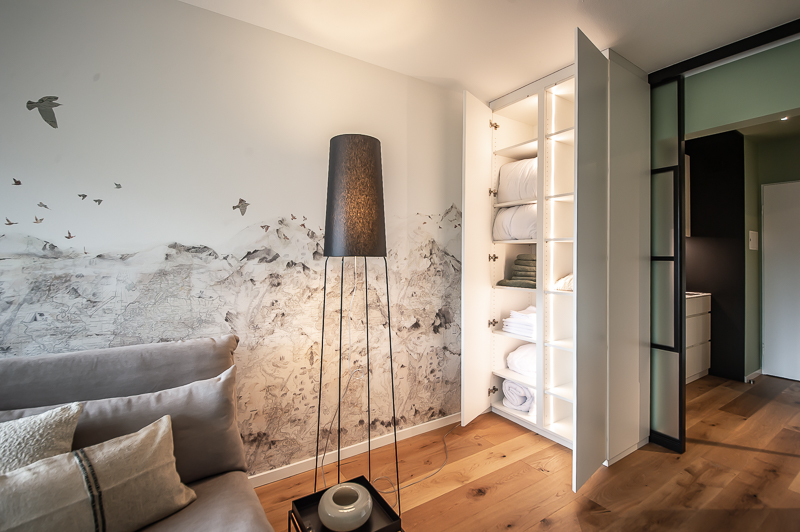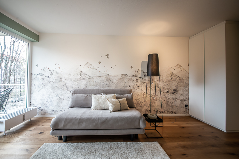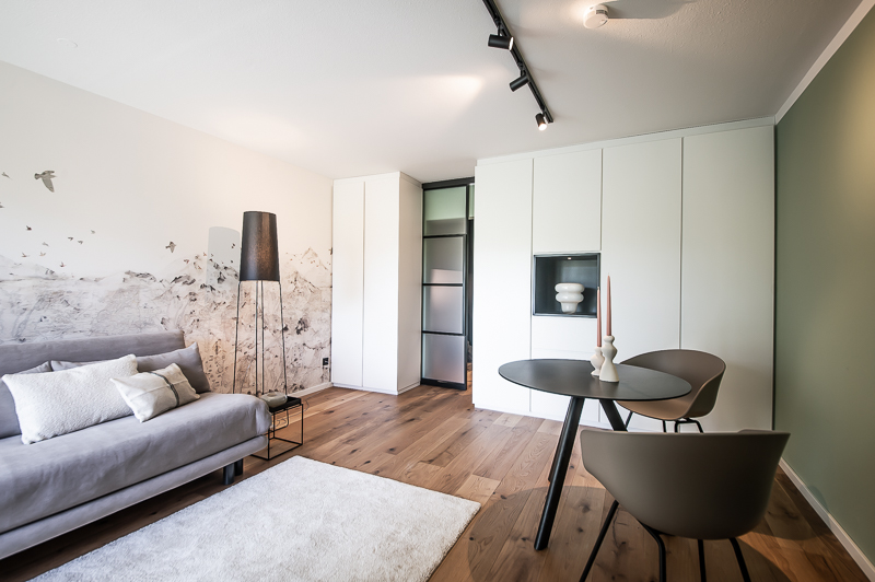 Umfang der Leistungen: • Komplettrenovierung eines 1 Zimmer Apartments in Neuhausen • Entwicklung eines Gestaltungskonzepts mit Innenausbau und Badplanung • Möblierungs- und Farbkonzept • Beleuchtungskonzept • Auswahl und Bestellung der Möbel und Ausstattung • Organisation und Umsetzung bis zur schlüsselfertigen Fertigstellung