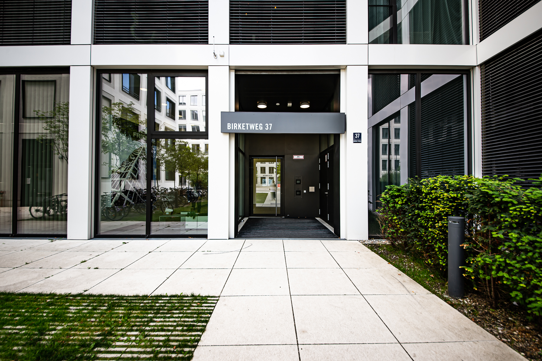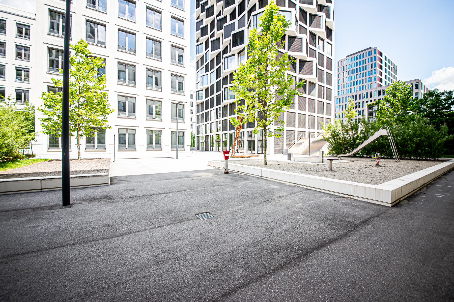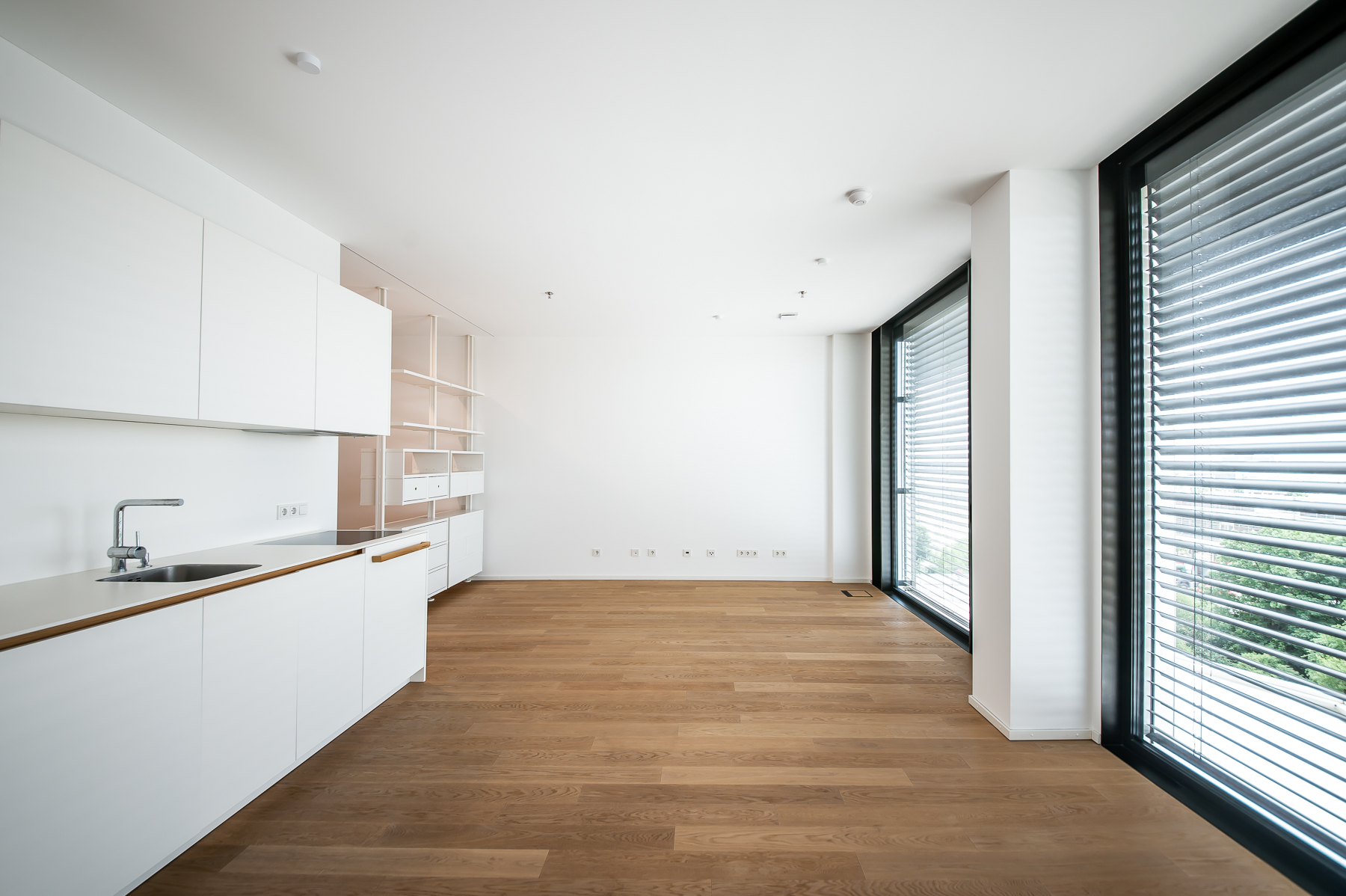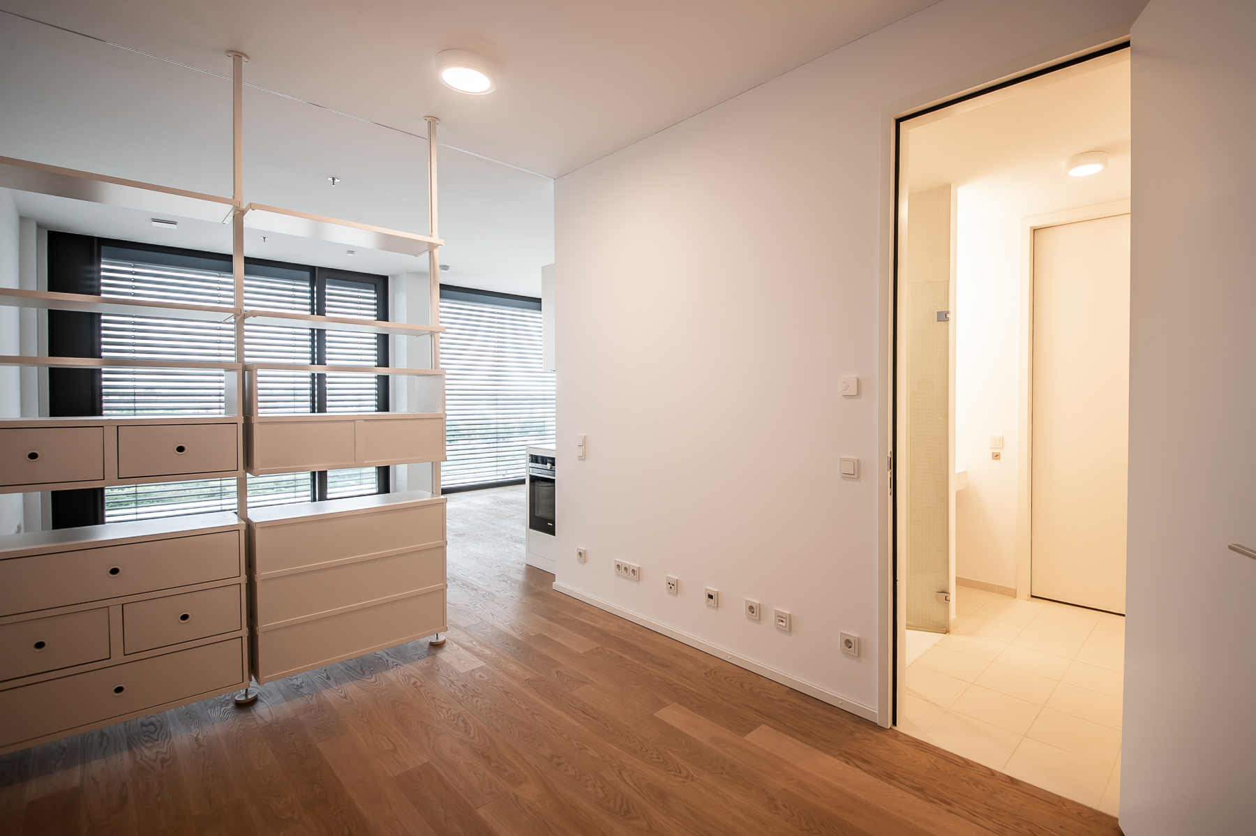 Moderne coole 1,5-Zimmer Wohnung im FRIENDS-Tower in München-Nymphenburg. Die beiden FRIENDS-Tower sind Wohn-Neubauten aus dem Jahre 2016 in Nähe des Hirschgartens. In Tower 1 befindet sich der Concierge-Service, ein Fitnessraum sowie eine Küchen-Lounge.