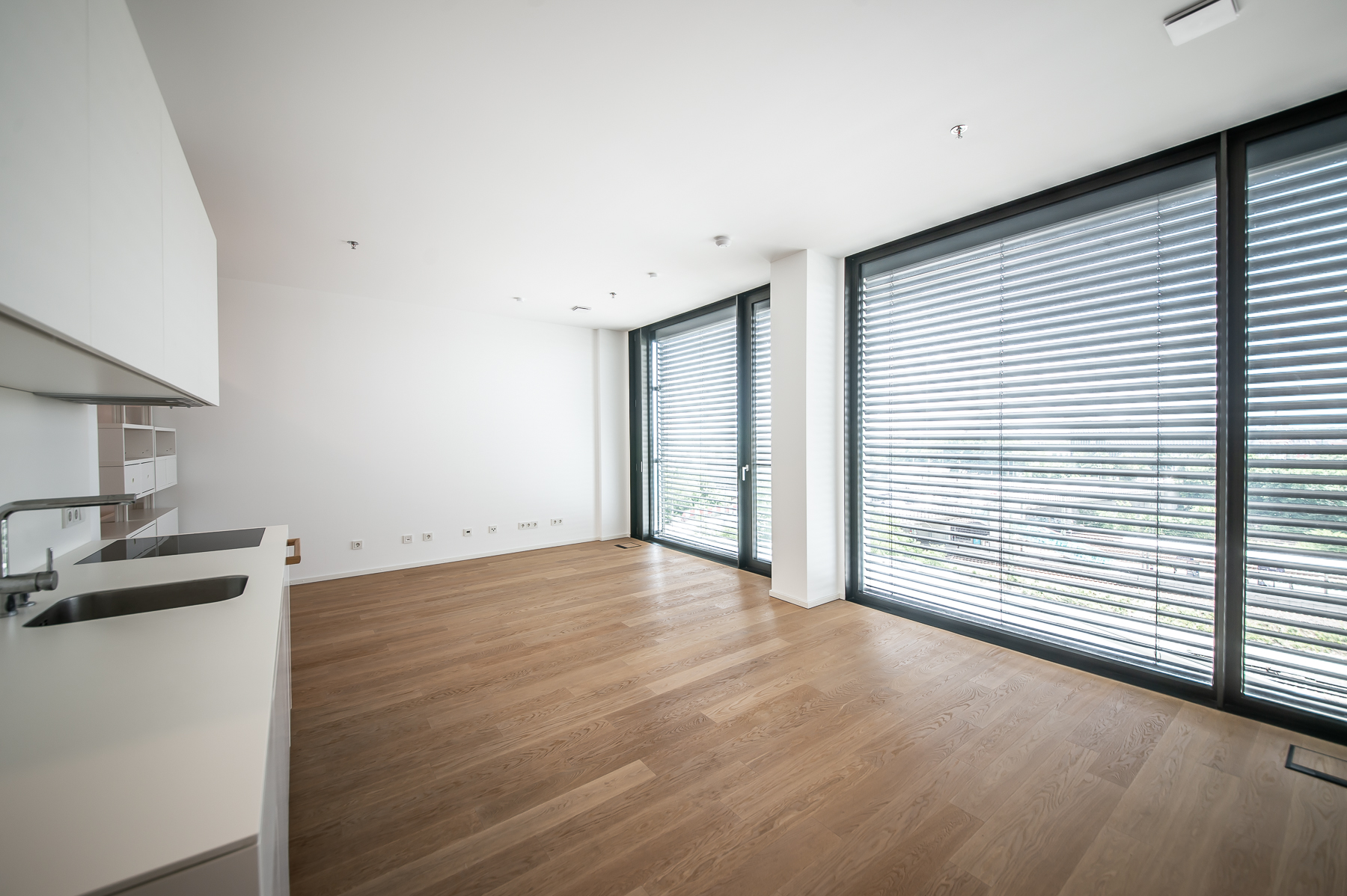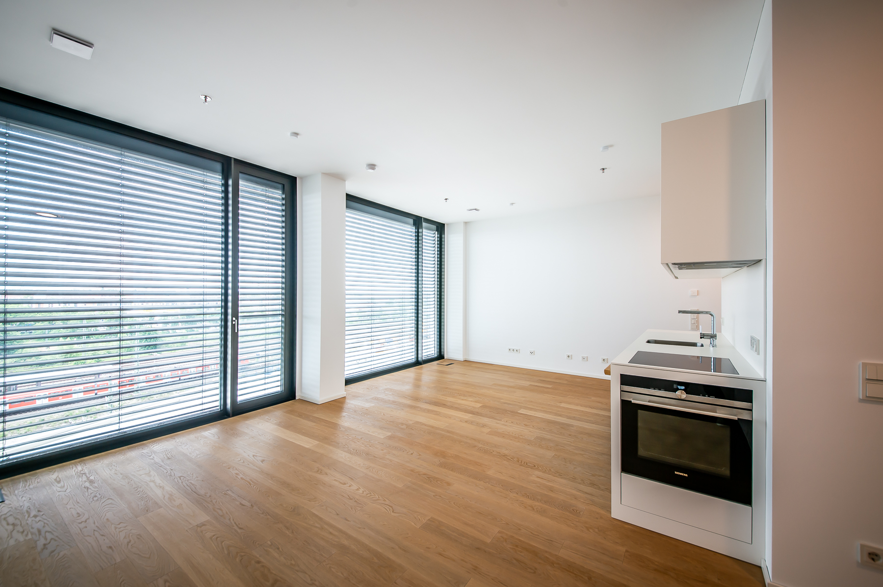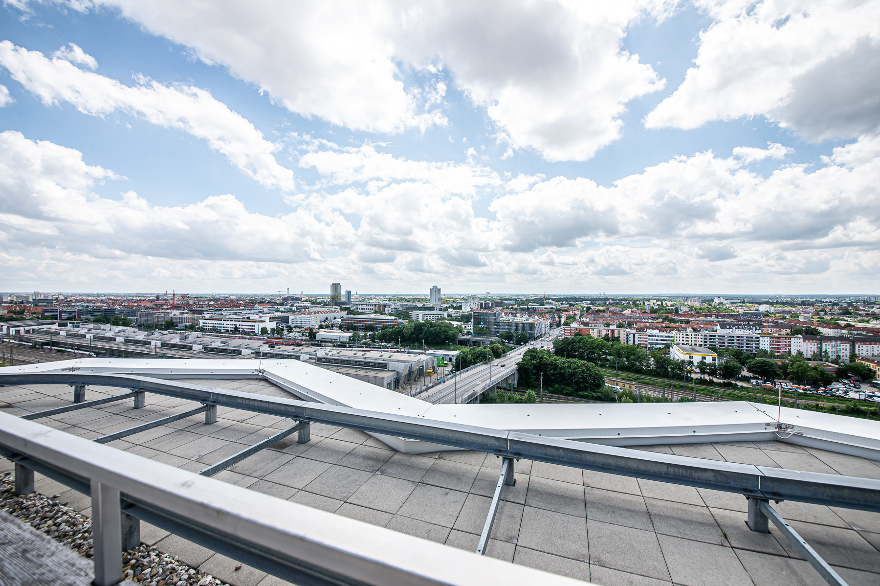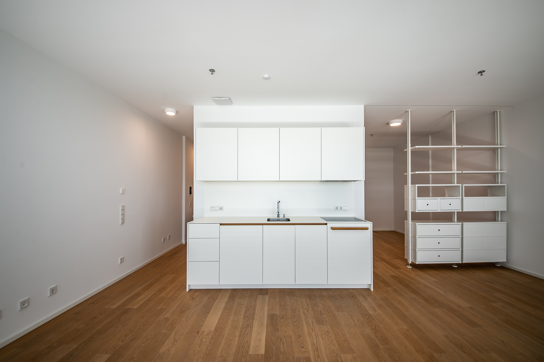 Moderne coole 1,5-Zimmer Wohnung im FRIENDS-Tower in München-Nymphenburg. Die beiden FRIENDS-Tower sind Wohn-Neubauten aus dem Jahre 2016 in Nähe des Hirschgartens. In Tower 1 befindet sich der Concierge-Service, ein Fitnessraum sowie eine Küchen-Lounge.