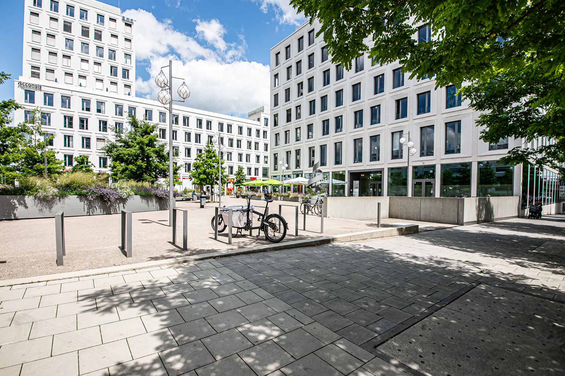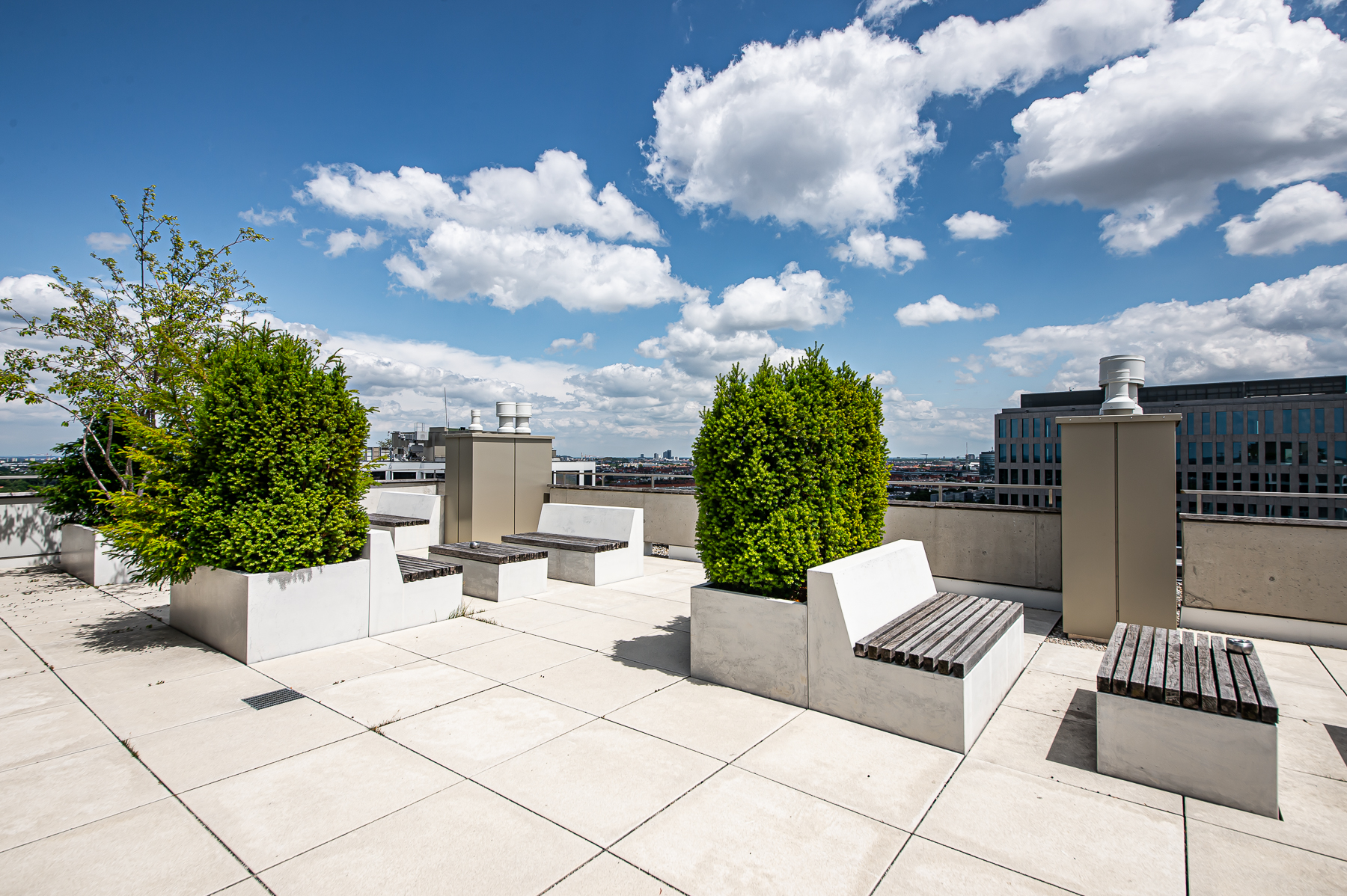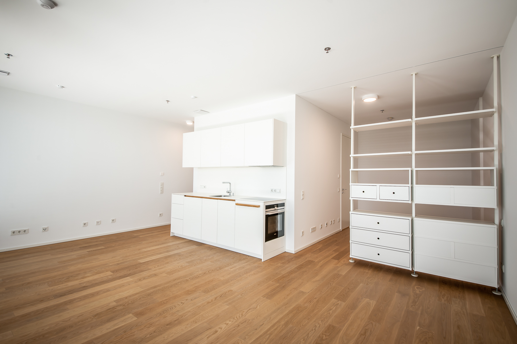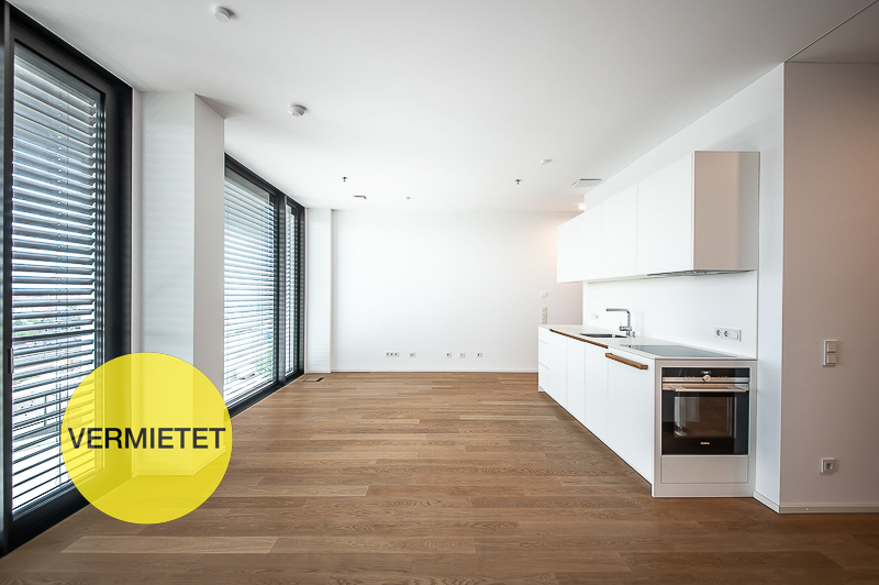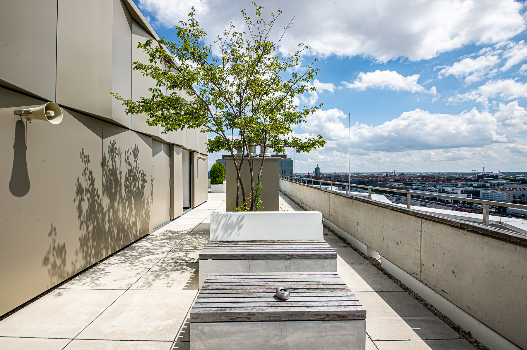 Moderne coole 1,5-Zimmer Wohnung im FRIENDS-Tower in München-Nymphenburg. Die beiden FRIENDS-Tower sind Wohn-Neubauten aus dem Jahre 2016 in Nähe des Hirschgartens. In Tower 1 befindet sich der Concierge-Service, ein Fitnessraum sowie eine Küchen-Lounge.